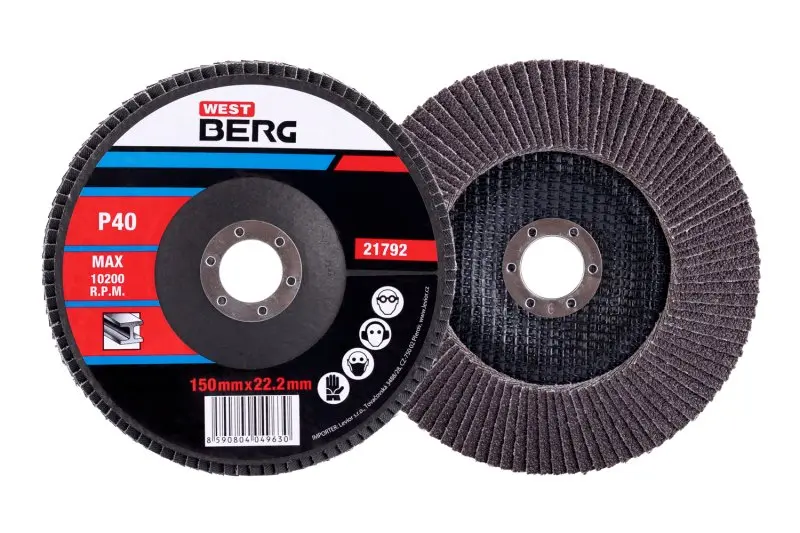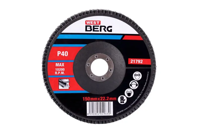 Lamelový kotouč, zrnitost: 40 druh zrna: oxid hlinitý pojivo: umělá pryskyřice podkladový materiál: pružná tkanina - 100% bavlna (240-260g/m2) provedení: vyhnutý otvor : 22,2mm, max. pracovní rychlost : 80m/s, max. přípustné otáčky: 13300 1/min, použití : broušení, obrušování, odrezování, odstraňování nátěrů, ...., rozměry : uvedeny v názvu výrobku.
