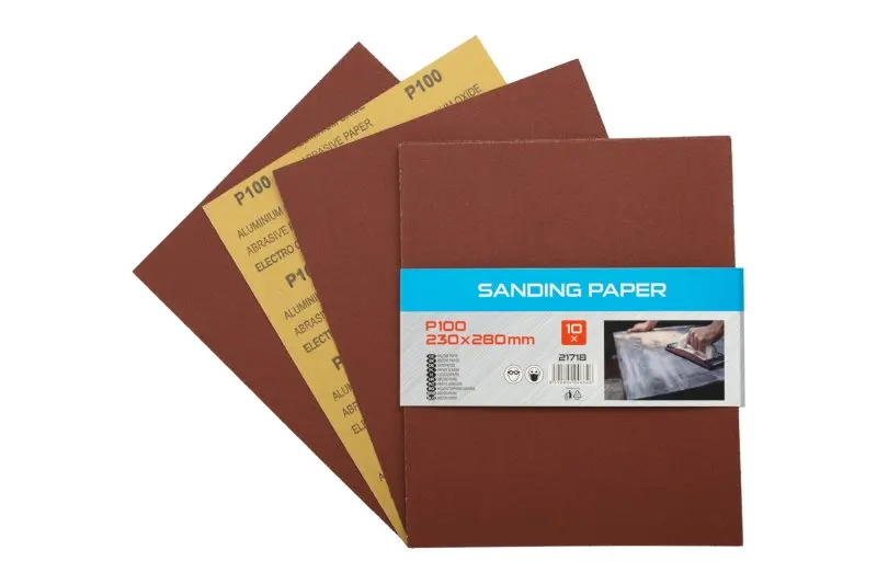 Smirkový papír - sada 10 kusů, zrnitost: 100, druh zrna: oxid hlinitý, pojivo: syntetická pryskyřice, podkladový materiál : pružný papír C (110-135g/m2), rozměry : uvedeny v názvu výrobku, balení : 10 kusů - papírový návlek.