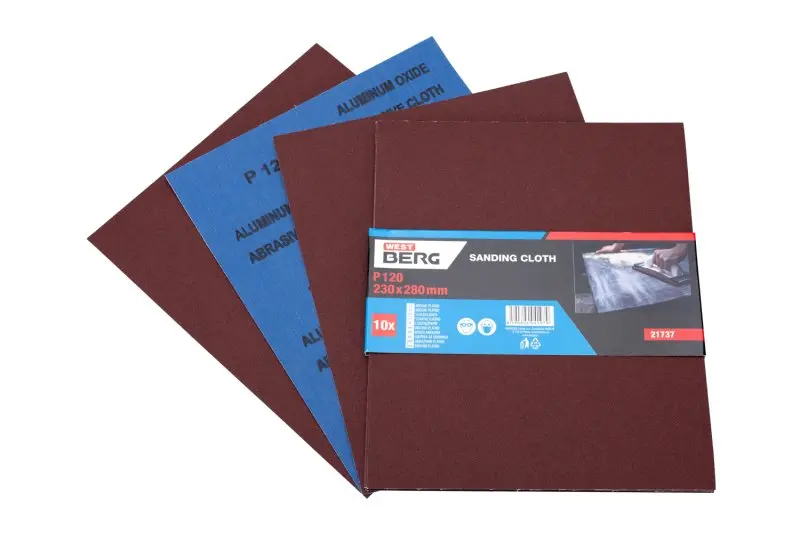 Smirkové plátno - sada 10 kusů, zrnitost: 120, druh zrna: oxid hlinitý, pojivo: syntetická pryskyřice, podkladový materiál : pružná tkanina-100% bavlna (240-260g/m2), rozměry : uvedeny v názvu výrobku, balení : 10 kusů - papírový návlek.