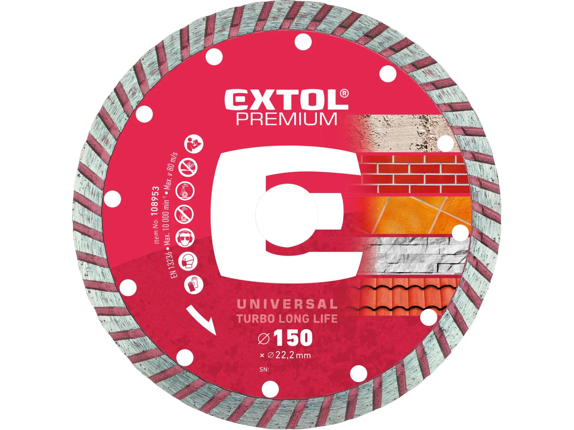 Řada diamantových řezných kotoučů LONG LIFE s prodlouženou životností pro profesionální a poloprofesionální použití. Díky složení diamantové směsi a výšce segmentu mají kotouče až o 50% větší řezný výkon než ostatní Extol Premium kotouče.