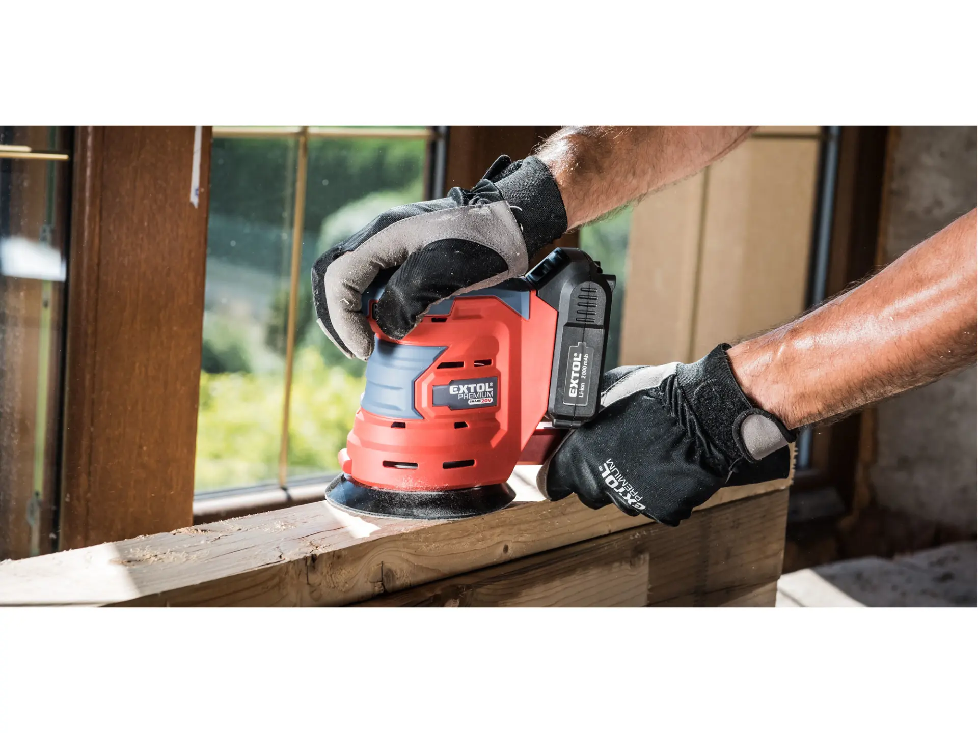 Aku vibrační bruska je ideální nástroj pro broušení dřeva a dřevěných materiálů, kovů a k zabroušení poškozených míst povrchové úpravy, např. barvy a laku, dále tmelů apod. bez použití vody. Rotační pohyb vytváří vysoký brousící výkon a excentricita vytváří náhodný pohyb, který zabraňuje vzniku nežádoucích hlubokých rýh v broušeném materiálu. Brusná plocha je vybavena suchým zipsem, který umožňuje snadnou výměnu brusných papírů. Integrované odsávání pilin udržuje čistý pracovní prostor při práci a po práci jednoduše vysypete sběrný vak a je uklizeno. Pro běžnou práci dostačují jeden nebo dva 2000mAh akumulátory, které můžete rychle nabít v rychlonabíječce, pro náročnější nebo delší práci doporučujeme větší akumulátory s kapacitou 4000–8000mAh. Akumulátor lze použít ve všech typech nářadí řady EXTOL SHARE20V. Díky použité Li-ion technologii je ho možné kdykoliv dobíjet, aniž by se tím snižovala jeho kapacita. Li-ion akumulátor ztrácí energii vlivem samovybíjení velmi pomalu a vydrží dlouho nabitý a připravený k použití.