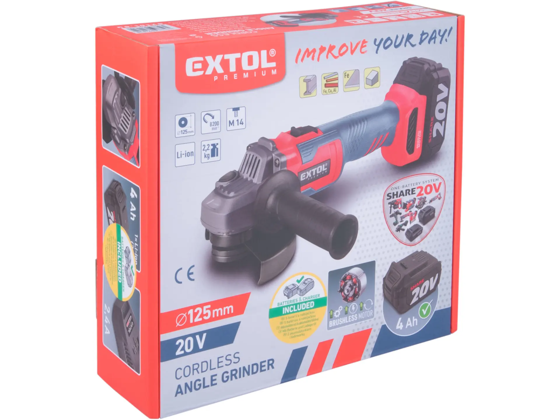 Akumulátorová úhlová bruska Extol® Premium SHARE20V je moderní stroj pro řezání, broušení a leštění kovu, dřeva i kamene. Díky kompaktní konstrukci a nízké hmotnosti se hodí do dílny, na stavbu i do terénu. Je určena pro profesionály i domácí kutily, kteří ocení spolehlivost, výkon a dlouhou životnost. Pohon zajišťuje bezuhlíkový motor s vysokou účinností a efektivním využitím baterie. Motor neztrácí výkon při zatížení a vyžaduje minimální údržbu. Funkce soft startu zajišťuje plynulý rozběh kotouče bez trhavých rázů, což zvyšuje komfort i bezpečnost při práci a šetří převody nářadí. Maximální rychlost dosahuje 8200 otáček za minutu, což umožňuje rychlé a čisté řezy i přesné broušení. Bruska používá kotouče o průměru 125 mm. Bezpečnost zvyšuje ergonomické provedení s pogumovanou ručkou, která tlumí vibrace a zajišťuje pevný úchop. Praktický bezpečnostní spínač nedovoluje náhodné zapnutí brusky, takže nářadí zůstane vypnuté i při nechtěném stisku spouště například při přenášení nebo manipulaci v kufru. Pomocná rukojeť je použitelná na obou stranách stroje, což zvyšuje komfort a kontrolu při práci. Nízká hmotnost 1,9 kg bez baterie (2,2 kg s baterií) usnadňuje manipulaci i práci ve výškách nebo stísněných prostorech. Zdrojem energie je univerzální akumulátor SHARE20V, kompatibilní s dalšími nástroji řady SHARE20V (vrtačky, pily, utahováky ...). Baterie má indikátor nabití, není náchylná na paměťový efekt a i při delším uskladnění vydrží dlouho nabitá a připravená k použití. Rychlonabíječka ji dobije přibližně za hodinu. Součástí balení je bruska, rychlonabíječka a 4Ah baterie. Extol Premium SHARE20V spojuje výkon, mobilitu a moderní technologii. Je ideální pro každého, kdo chce pracovat efektivně, bezpečně a bez omezení elektrické sítě.