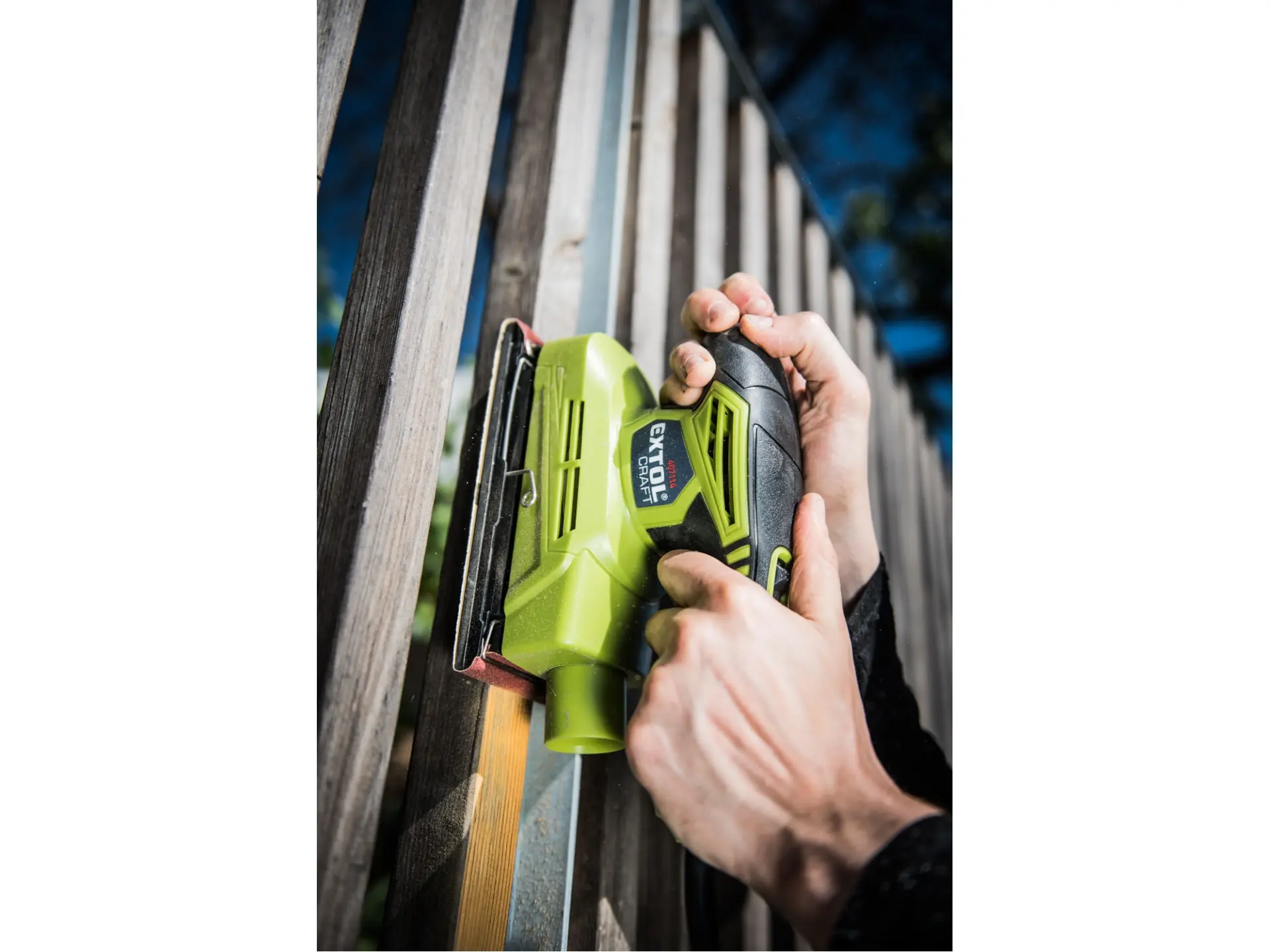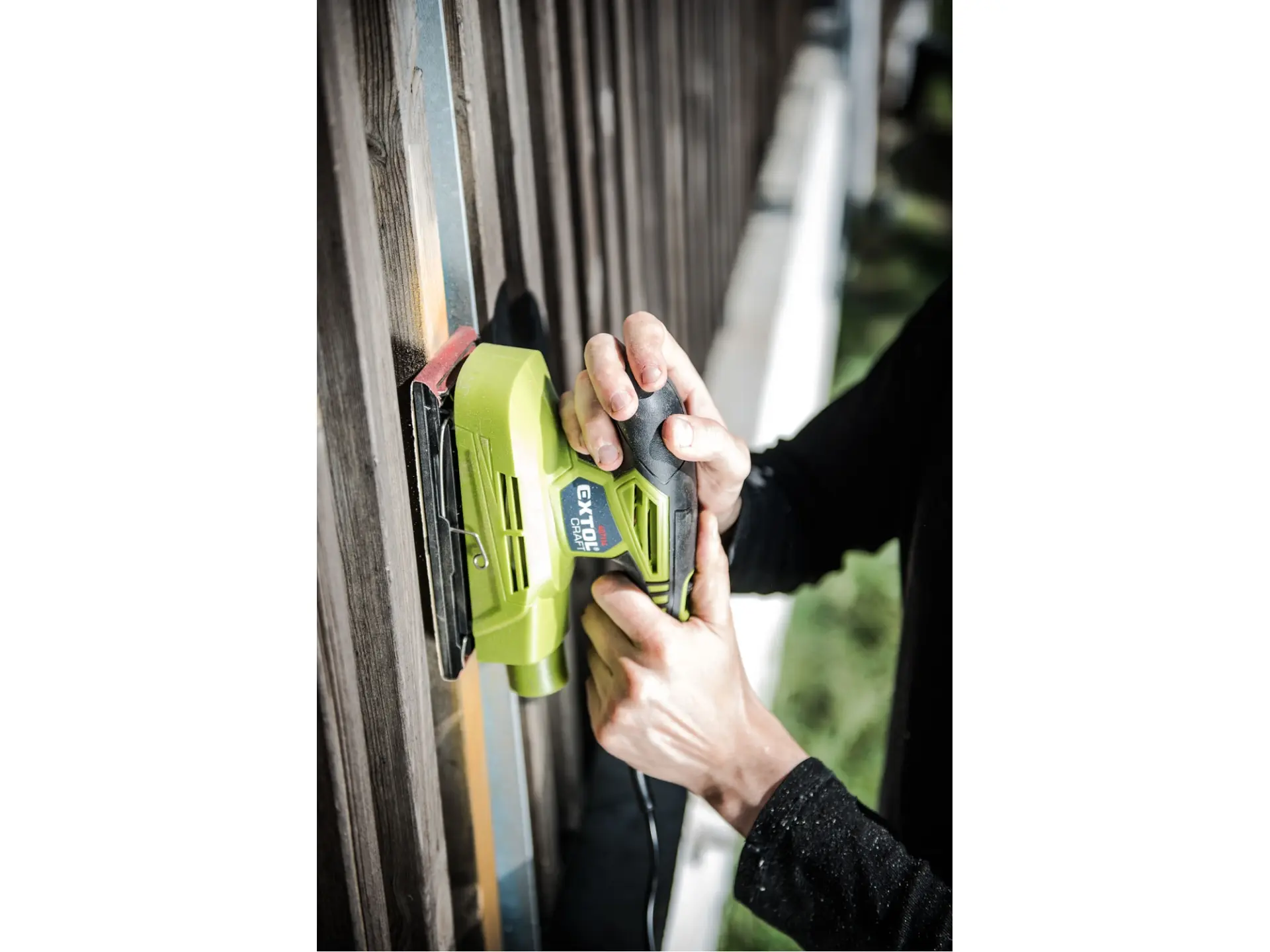 Dvouruční bruska určena pro broušení dřeva a dřevěných materiálů, kovů a zabroušení poškozených míst povrchové úpravy, např. barvy a laku, dále tmelů apod. bez použití vody. Broušení je prováděno mikrojemnými vibracemi brusné základny kmitající o vysoké frekvenci. Bruska je vhodná pro broušení v místech s pravým úhlem, např. v rozích podlah a k finálnímu zbroušení jemných defektů na površích před nanášením povrchové úpravy. Bruska není určena k broušení sádrokartonu a stavebních materiálů.