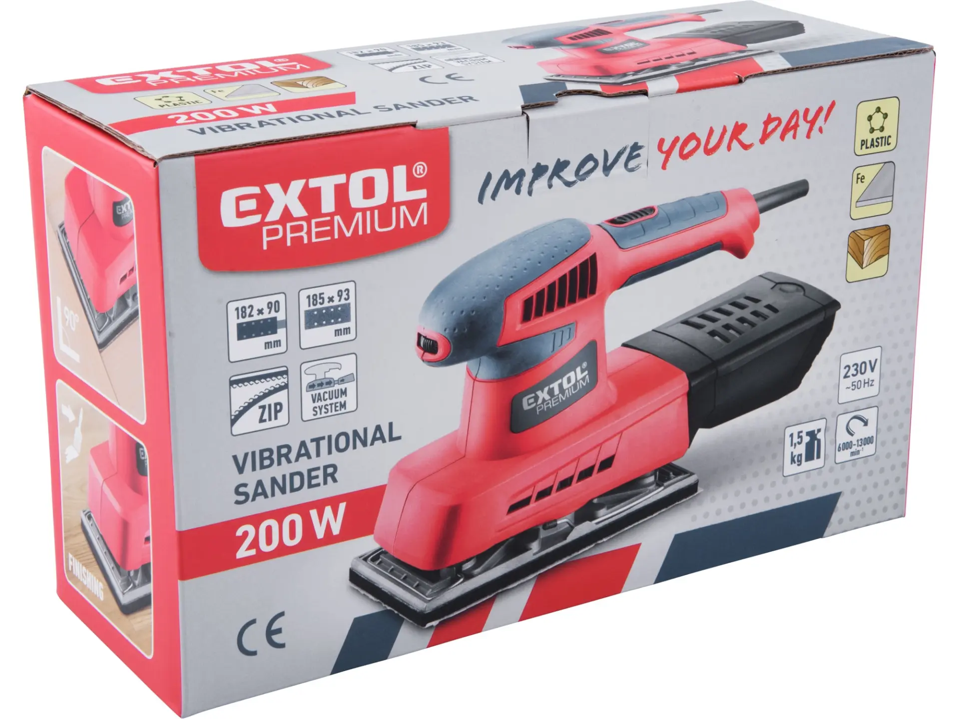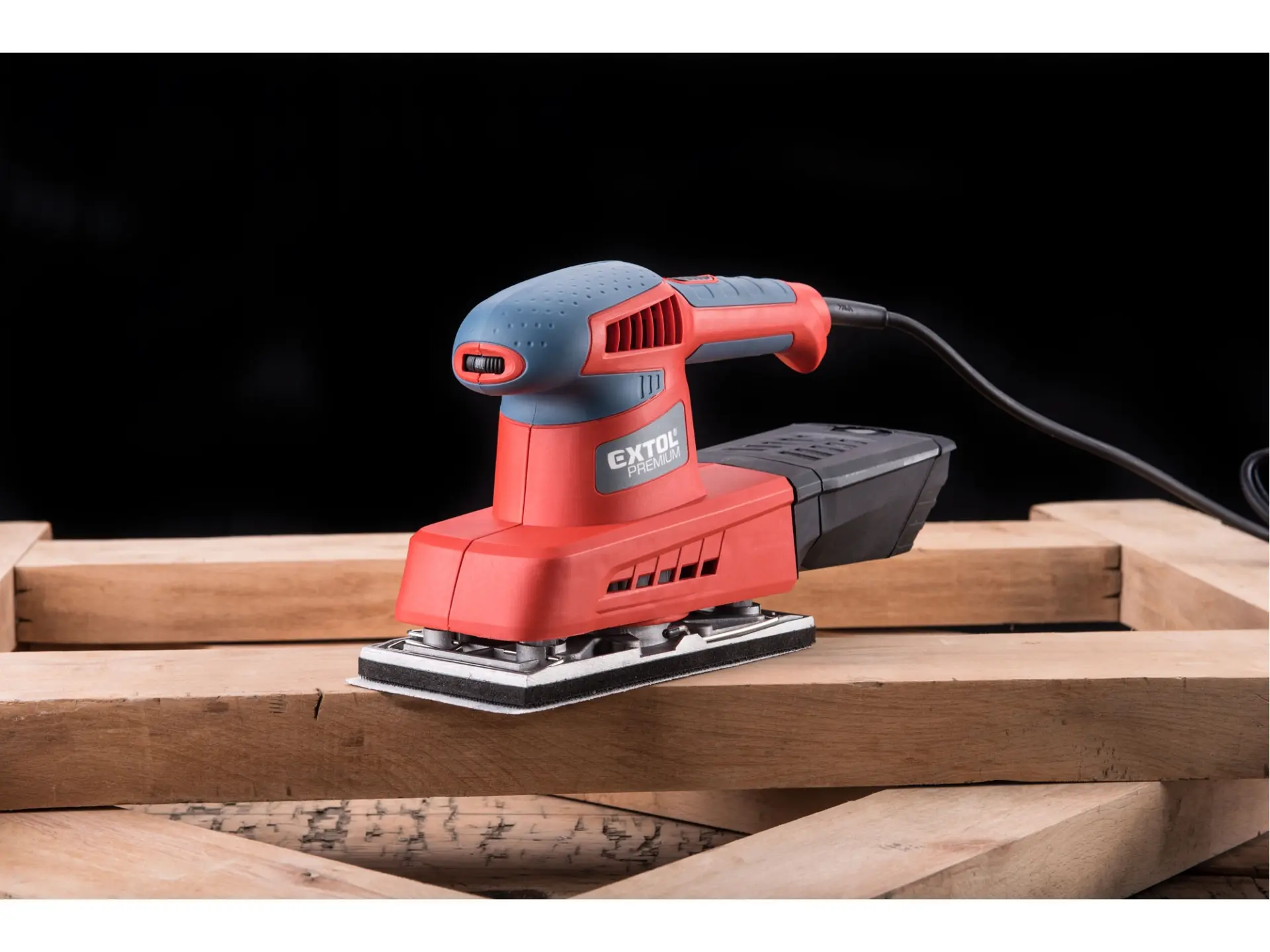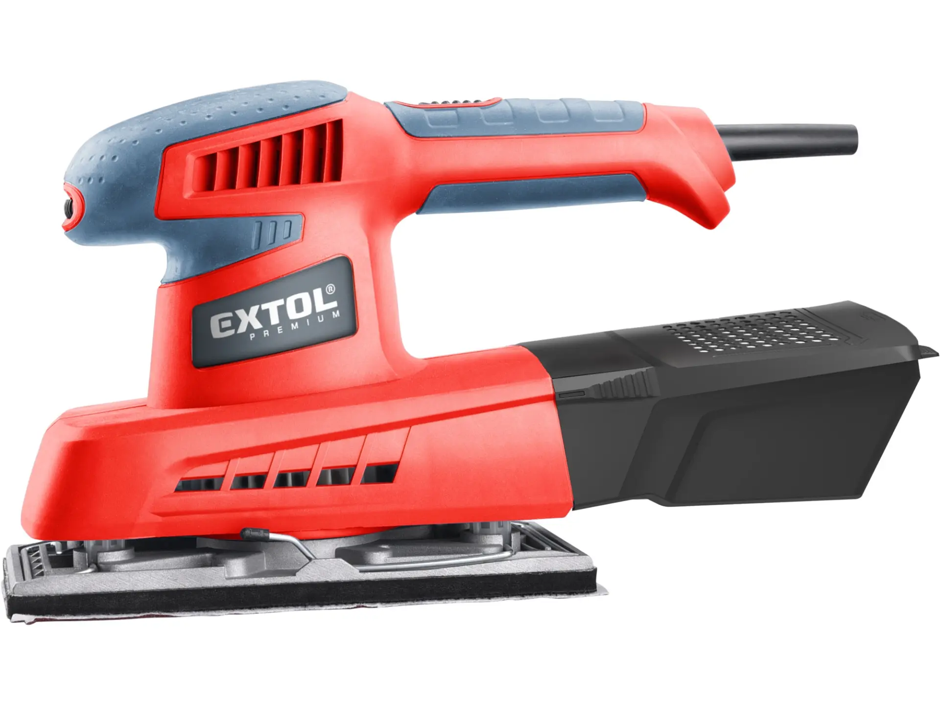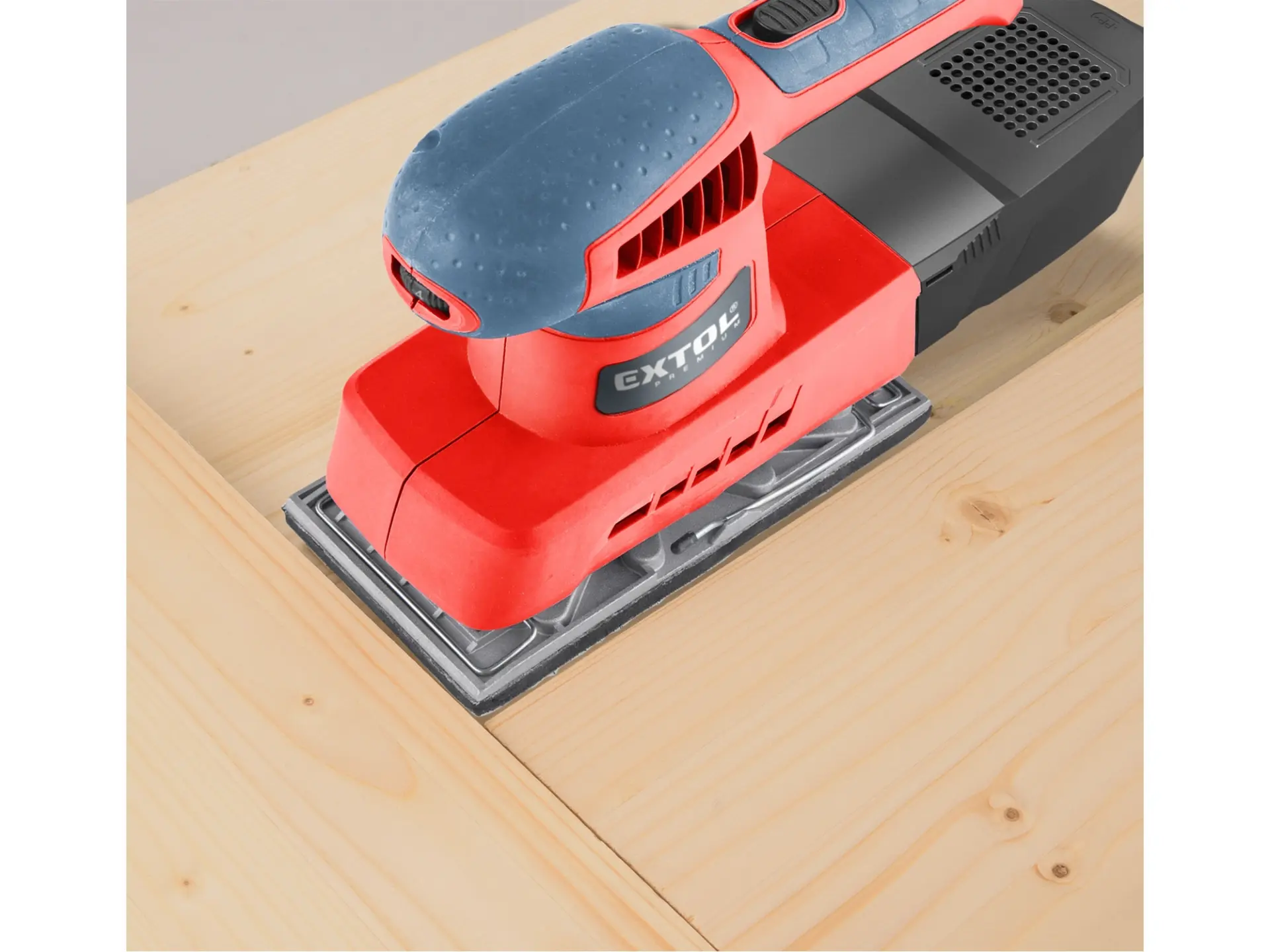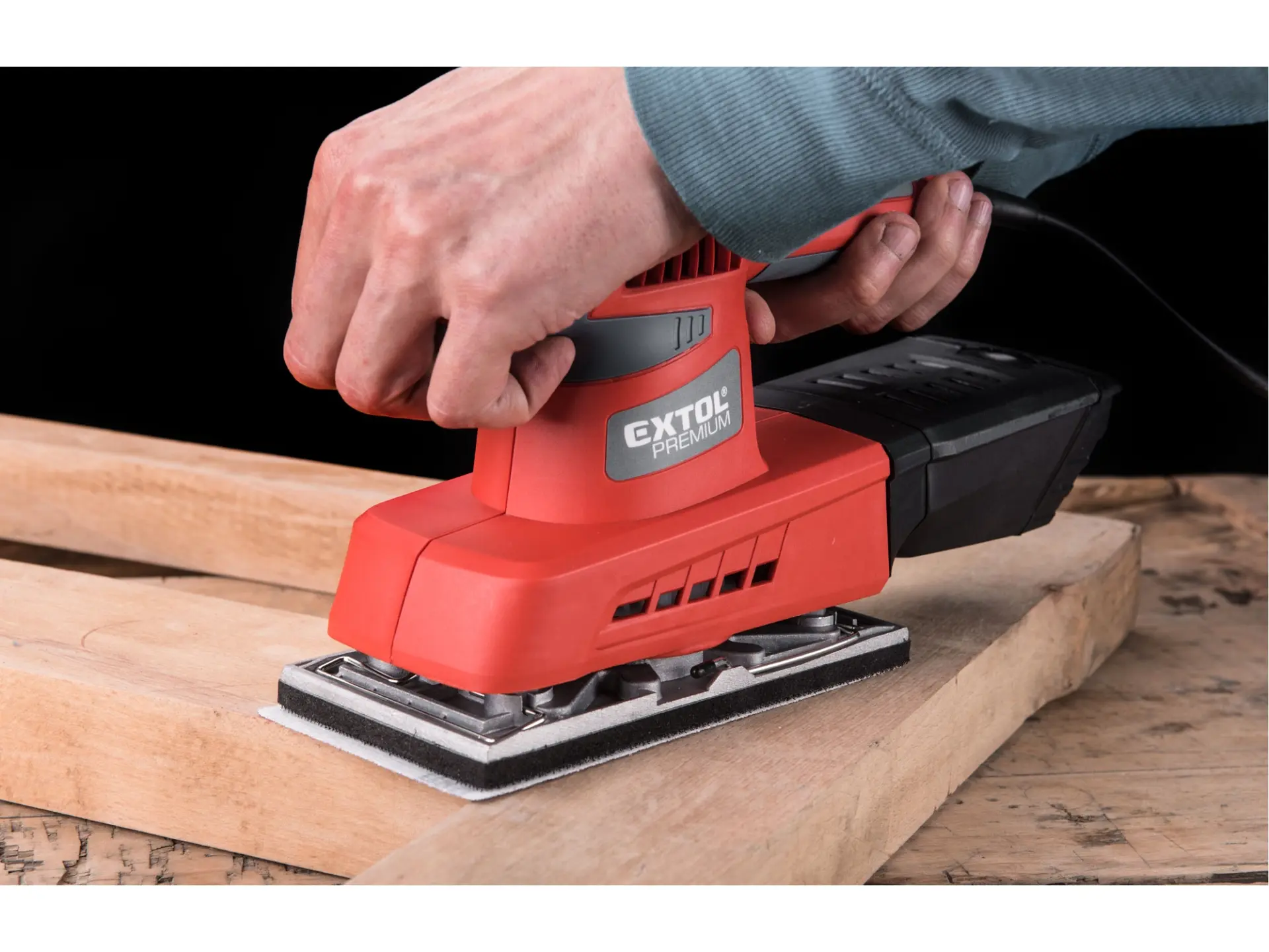 Dvouruční výkonná bruska pro plošné a rohové broušení plochých dřevěných materiálů, kovů, plastů, tmelů a laků. Při broušení si můžete upravit rychlost dle typu broušeného materiálu. Z důvodu delší životnosti má bruska pevnou kovovou základnu na kterou lze přichytit brusné papíry pomocí suchého zipu nebo svorkami. Čistý pracovní prostor zajišťuje integrovaný systém odsávání pilin do sběrného boxu. Horní strana rukojeti je pokryta gumou, která tlumí přenos vibrací při práci.Není vhodná pro broušení sádrokartonu.