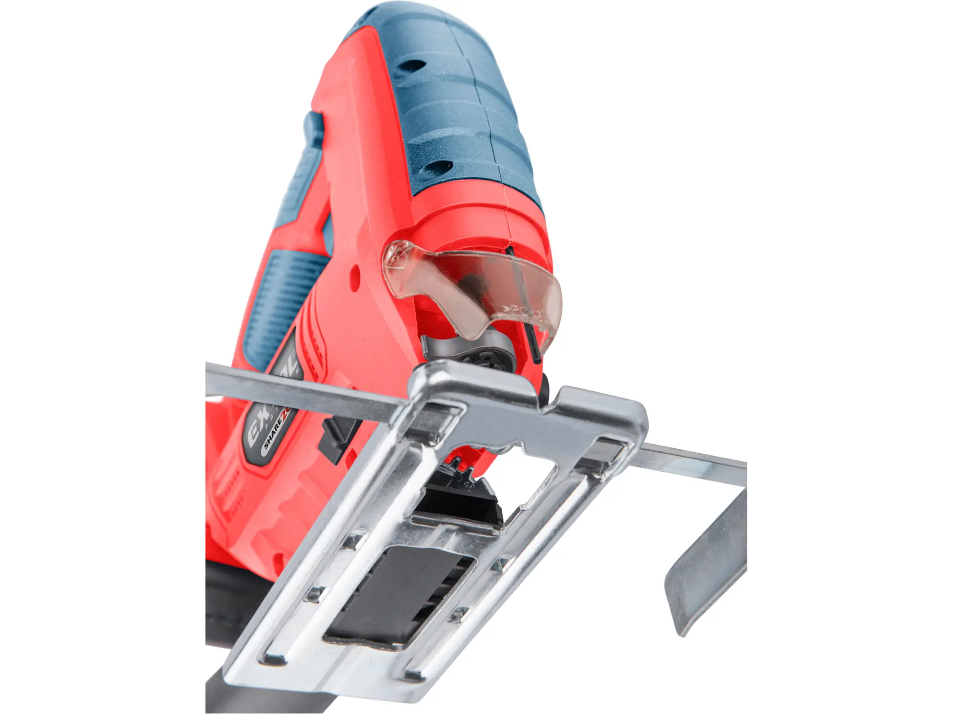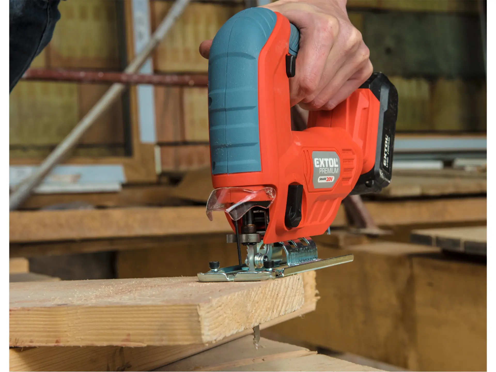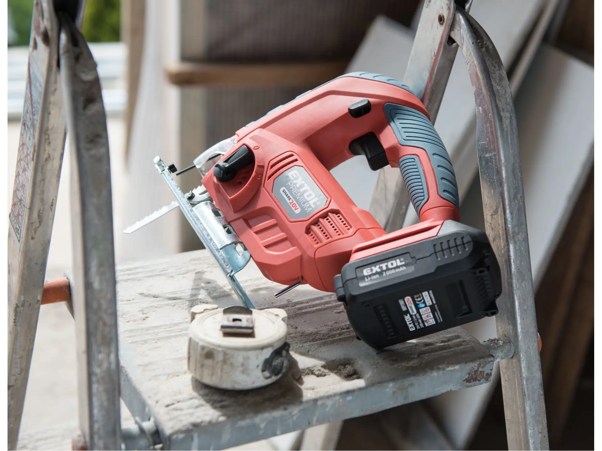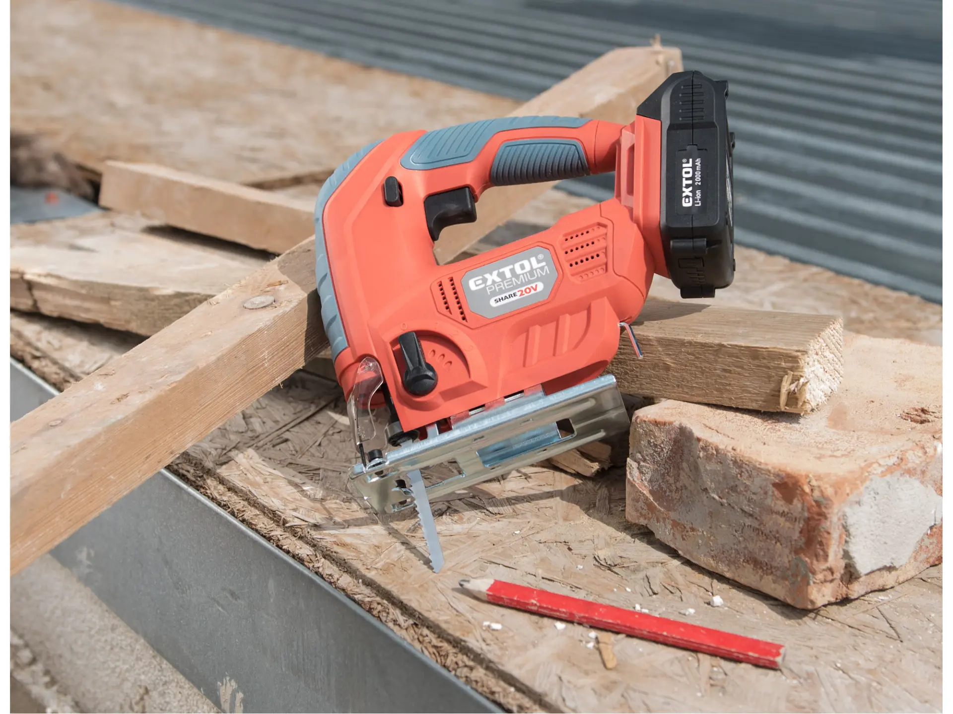 Aku přímočará pila SHARE20V je určena k provádění dělících a tvarových řezů, zejména do dřeva a dřevotřísky a k řezání kovů, plastu, keramických desek a gumy, dále sádrokartonu, cementotřískového materiálu. Díky rychloupínacímu systému lze pilový plátek „Bosch“ vyměnit bez použití nástrojů. Lze použít plátek jakéhokoliv výrobce s tímto úchytem. Standartně při řezání pila odfukuje piliny z místa řezání, ale pokud k ní připojíte vysavač, můžete tento odfuk přepnout a piliny přímo odsávat do vysavače, čímž dosáhnete mnohem čistějšího pracovního místa. Při řezání sádrokartónu a podobných materiálů s velmi jemným prachem je nutno vždy používat odsávání vysavačem. Při práci můžete regulovat rychlost kmitů pomocí spínače a také můžete nastavit sílu předkmitu. Obě nastavení se používají pro změnu stylu a rychlosti řezání v odlišných materiálech. Pro snadnější práci má pila LED světlo osvětlující pracovní místo, které se automaticky zapíná při stisku spínače. Gumová vrstva pokrývající pilu v místě úchopu snižuje množství vibrací, které se přenášejí do rukou a snižuje únavu při práci. Pro běžnou práci dostačují jeden nebo dva 2000mAh akumulátory, které můžete rychle nabít v rychlonabíječce, pro náročnější nebo delší práci doporučujeme větší akumulátory s kapacitou 4000–8000mAh. Akumulátor lze použít ve všech typech nářadí řady EXTOL SHARE20V. Díky použité Li-ion technologii je ho možné kdykoliv dobíjet, aniž by se tím snižovala jeho kapacita. Li-ion akumulátor ztrácí energii vlivem samovybíjení velmi pomalu a vydrží dlouho nabitý a připravený k použití.