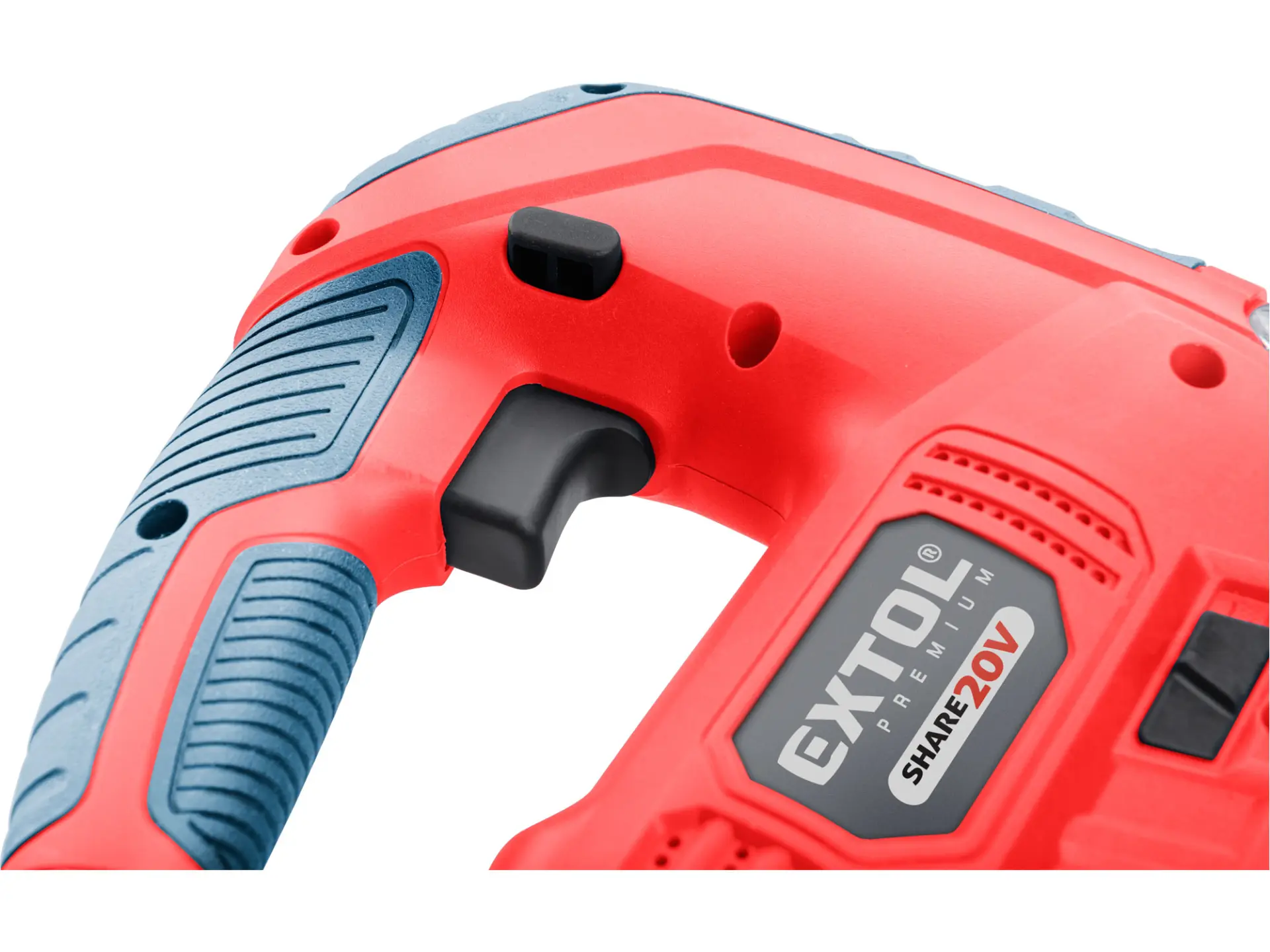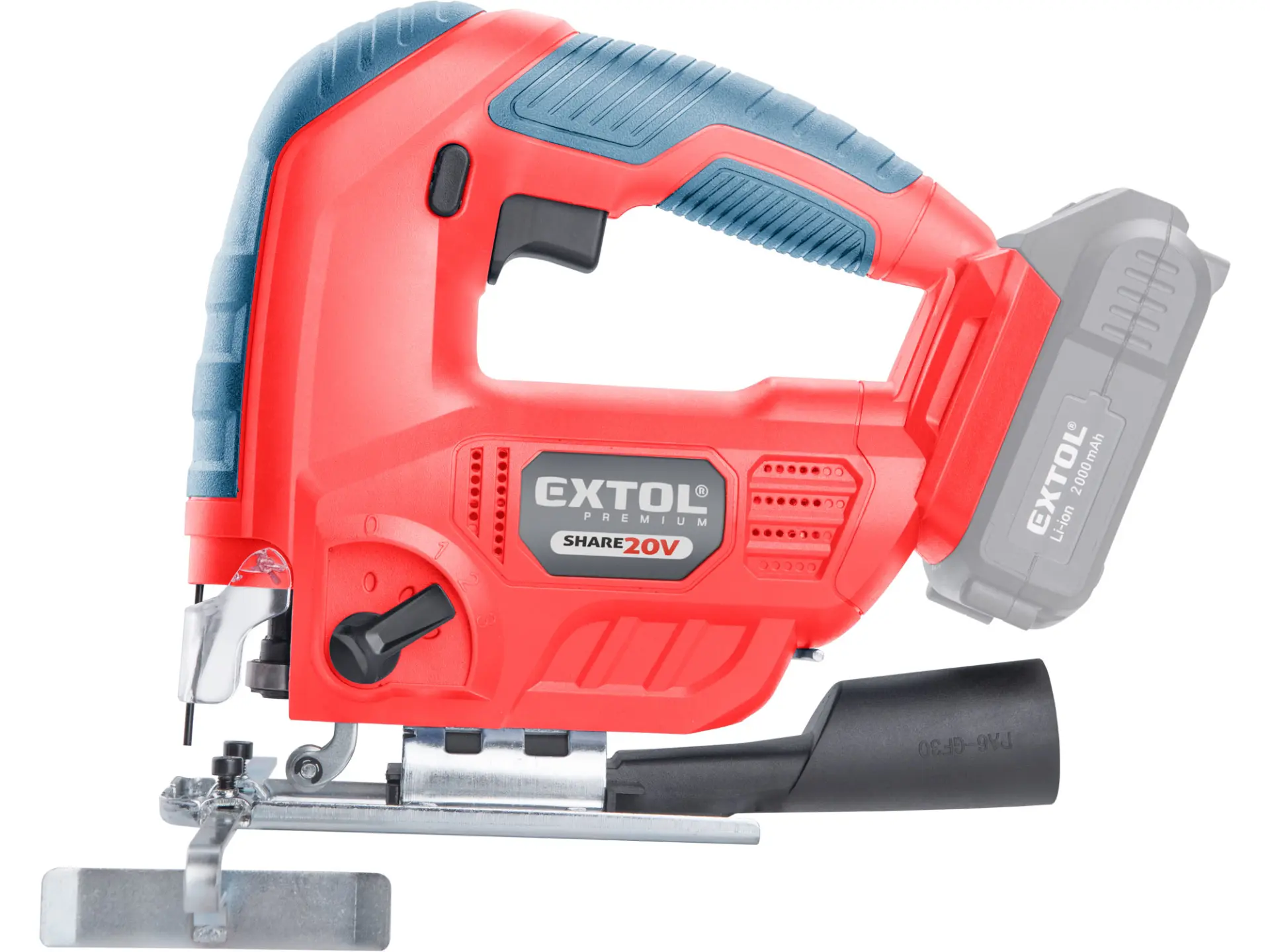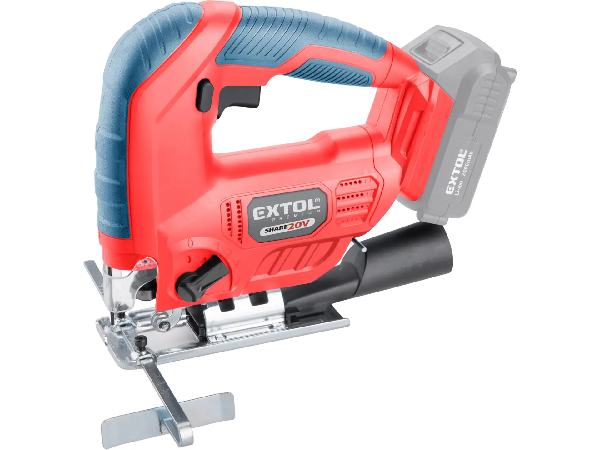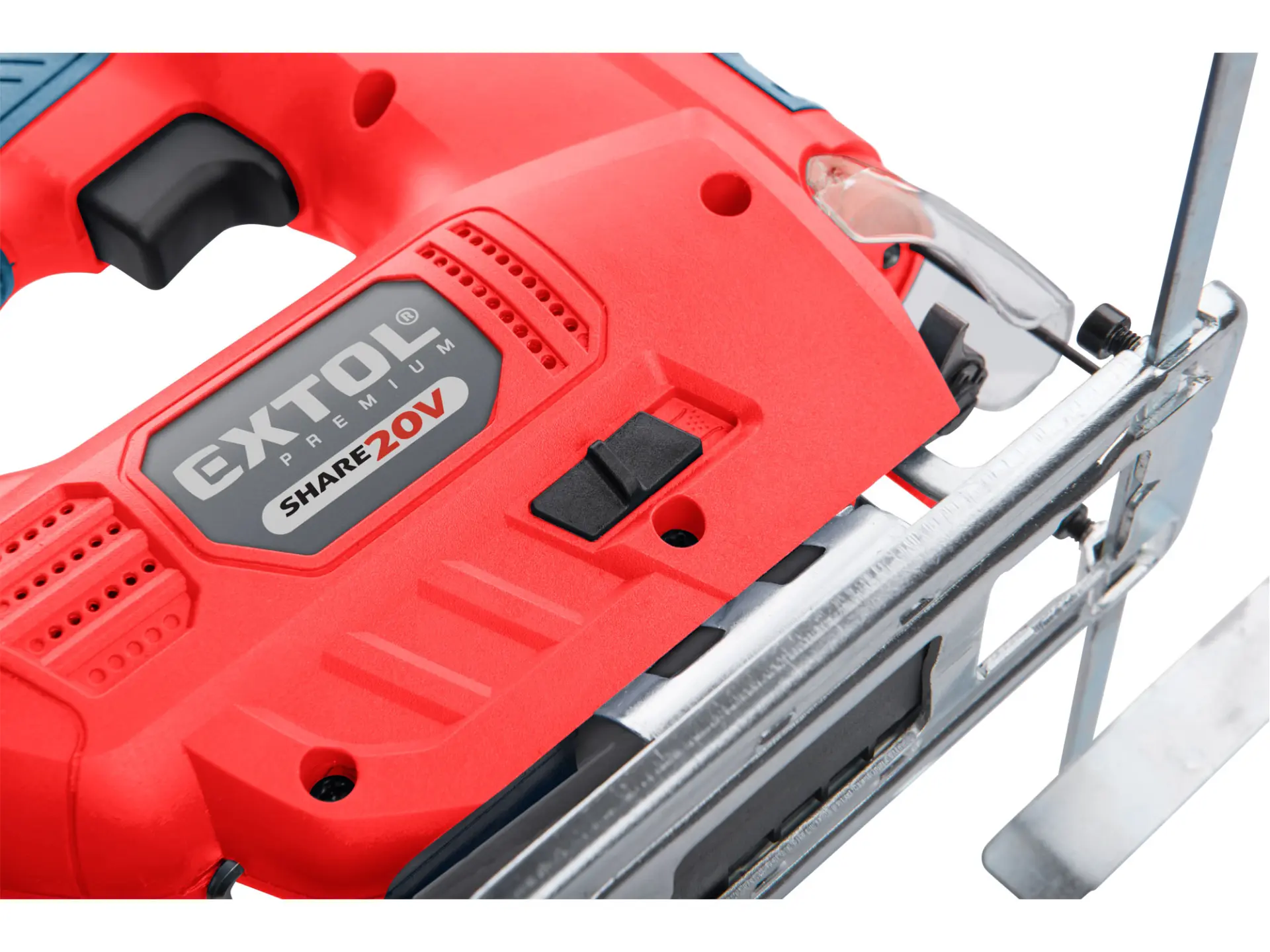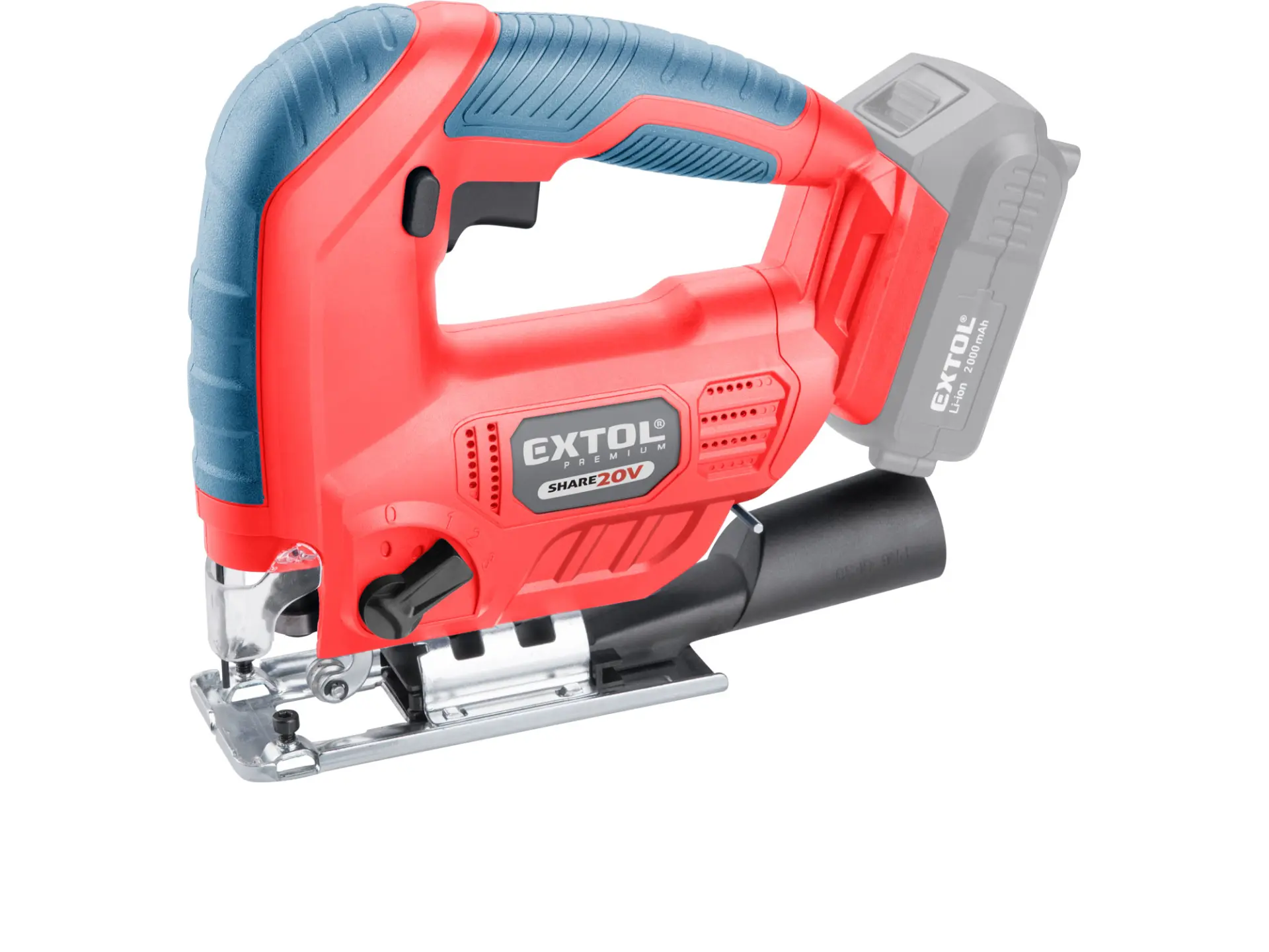 Aku přímočará pila SHARE20V je určena k provádění dělících a tvarových řezů, zejména do dřeva a dřevotřísky a k řezání kovů, plastu, keramických desek a gumy, dále sádrokartonu, cementotřískového materiálu. Díky rychloupínacímu systému lze pilový plátek „Bosch“ vyměnit bez použití nástrojů. Lze použít plátek jakéhokoliv výrobce s tímto úchytem. Standartně při řezání pila odfukuje piliny z místa řezání, ale pokud k ní připojíte vysavač, můžete tento odfuk přepnout a piliny přímo odsávat do vysavače, čímž dosáhnete mnohem čistějšího pracovního místa. Při řezání sádrokartónu a podobných materiálů s velmi jemným prachem je nutno vždy používat odsávání vysavačem. Při řezání můžete regulovat rychlost kmitů pomocí spínače a také můžete nastavit sílu předkmitu. Obě nastavení se používají pro změnu stylu a rychlosti řezání v odlišných materiálech. Pro snadnější práci má pila LED světlo osvětlující pracovní místo, které se automaticky zapíná při stisku spínače. Gumová vrstva pokrývající pilu v místě úchopu snižuje množství vibrací, které se přenášejí do rukou a snižuje únavu při práci. Pro běžnou práci dostačují jeden nebo dva 2000mAh akumulátory, které můžete rychle nabít v rychlonabíječce, pro náročnější nebo delší práci doporučujeme větší akumulátory s kapacitou 4000–8000mAh. Akumulátor lze použít ve všech typech nářadí řady EXTOL SHARE20V. Díky použité Li-ion technologii je ho možné kdykoliv dobíjet, aniž by se tím snižovala jeho kapacita. Li-ion akumulátor ztrácí energii vlivem samovybíjení velmi pomalu a vydrží dlouho nabitý a připravený k použití.