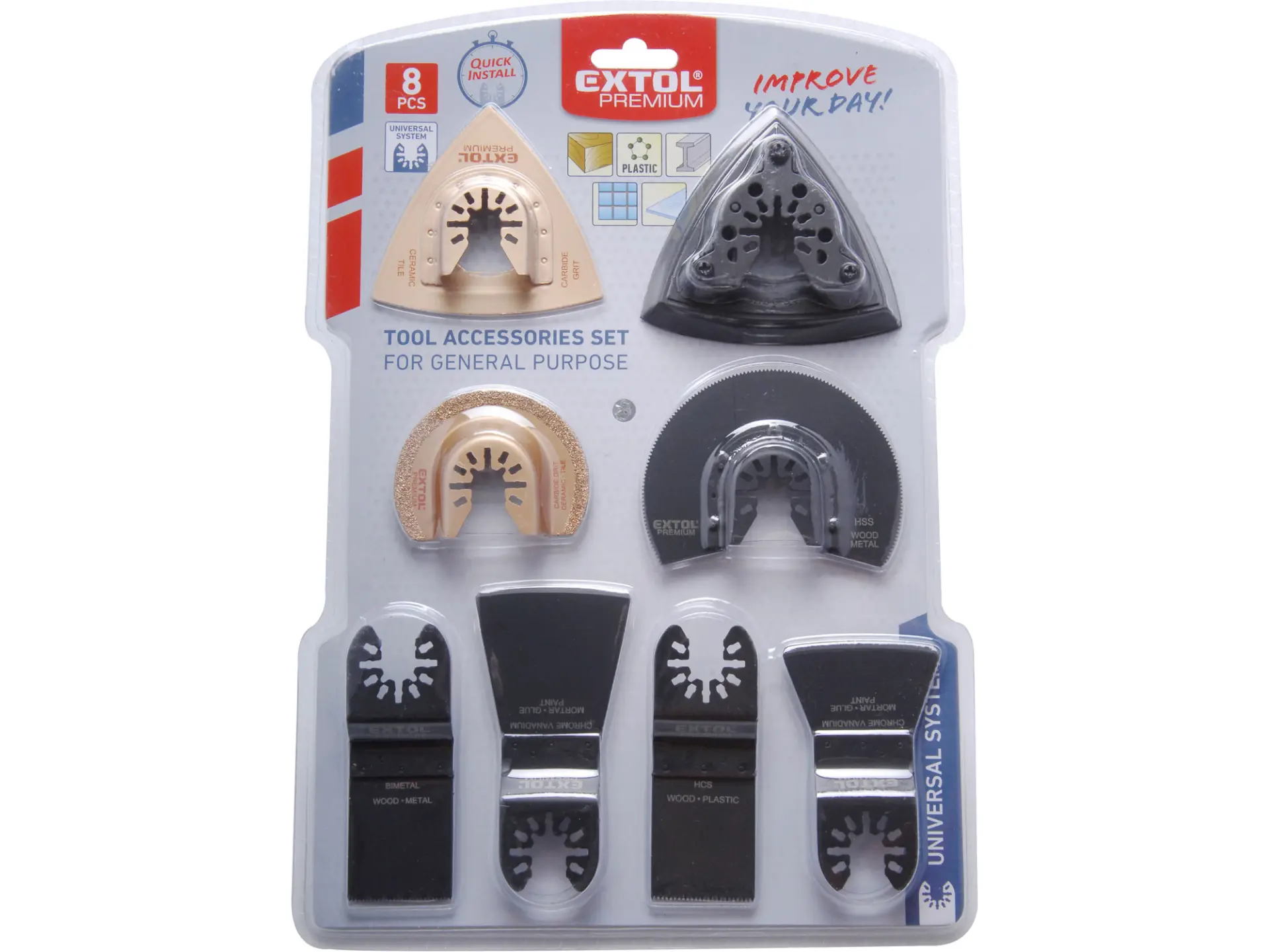 HSS segmentový, pilový kotouč pr. 88mm, HCS zanořovací pilový list 34mm, BIM zanořovací pilový list 34mm, 2ks CrV škrabky 52mm, karbidový řezný kotouč pr. 63,5mm, karbidová delta brusná deska 78mm, de