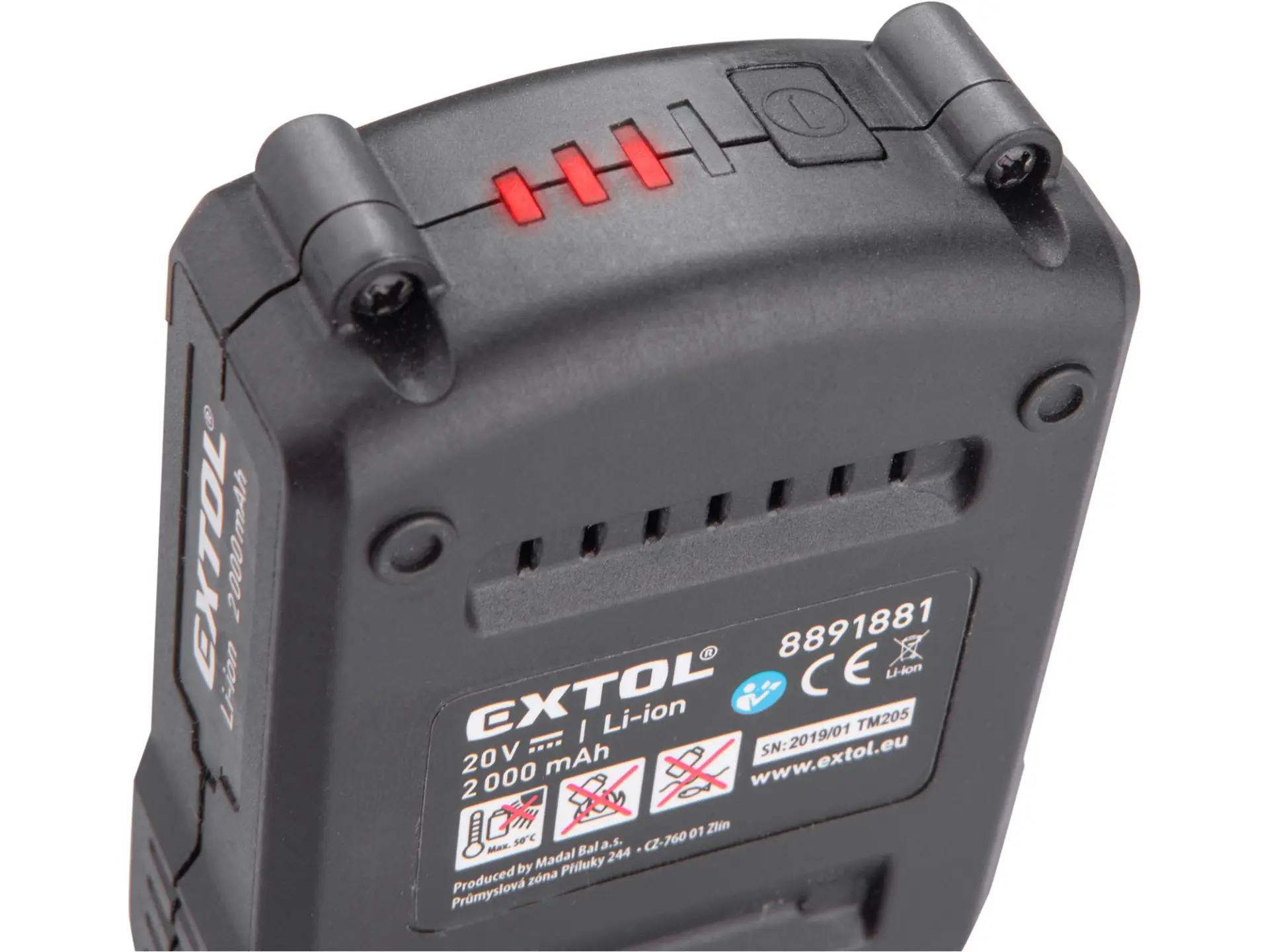 Aku vrtací kladivo je určeno k rychlému vrtání do cihel a betonu pomocí vrtáků s SDS Plus stopkou. Díky pneumatickému příklepovému systému je schopno vrtat mnohem rychleji a efektivněji než příklepové vrtačky. Jeho hlavní výhodou je akumulátorový pohon, který dovoluje si vzít kladivo s sebou tam kde s ním potřebujete pracovat, bez ohledu na to, jestli tam je rozvod elektrické energie. Kladivo je vybaveno zpětným chodem pro snadné vytažení zaseklého vrtáku a dvěma rozsahy rychlosti, které lze využít dle vrtaného materiálu. Pro běžnou práci dostačují jeden nebo dva 2000mAh akumulátory, které můžete rychle nabít v rychlonabíječce, pro náročnější nebo delší práci doporučujeme větší akumulátory s kapacitou 4000–8000mAh. Akumulátor lze použít ve všech typech nářadí řady EXTOL SHARE20V. Díky použité Li-ion technologii je ho možné kdykoliv dobíjet, aniž by se tím snižovala jeho kapacita. Li-ion akumulátor ztrácí energii vlivem samovybíjení velmi pomalu a vydrží dlouho nabitý a připravený k použití.