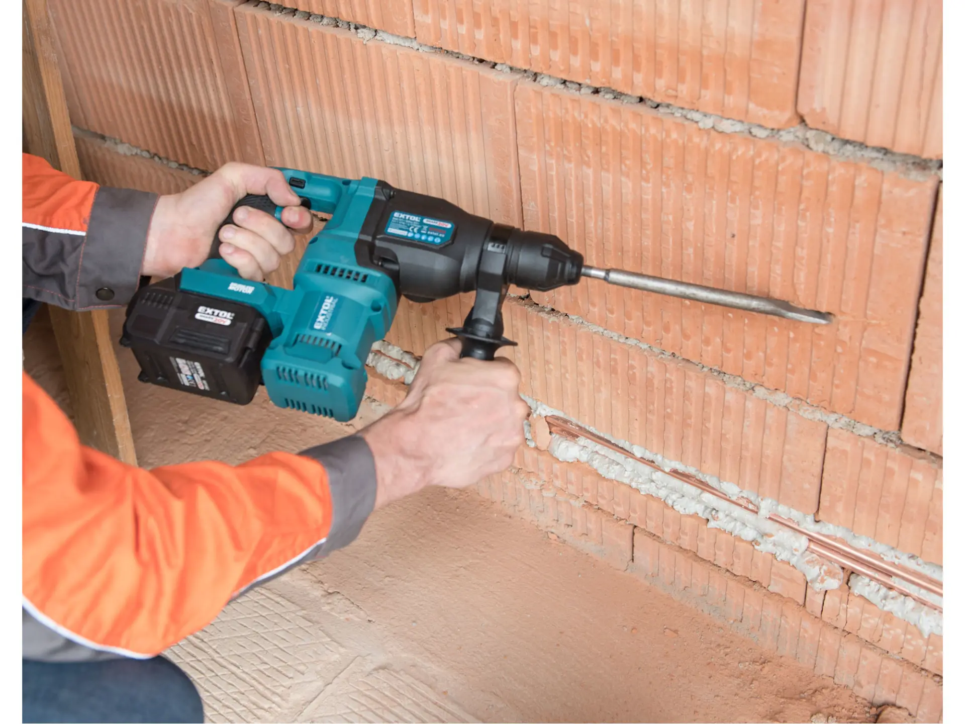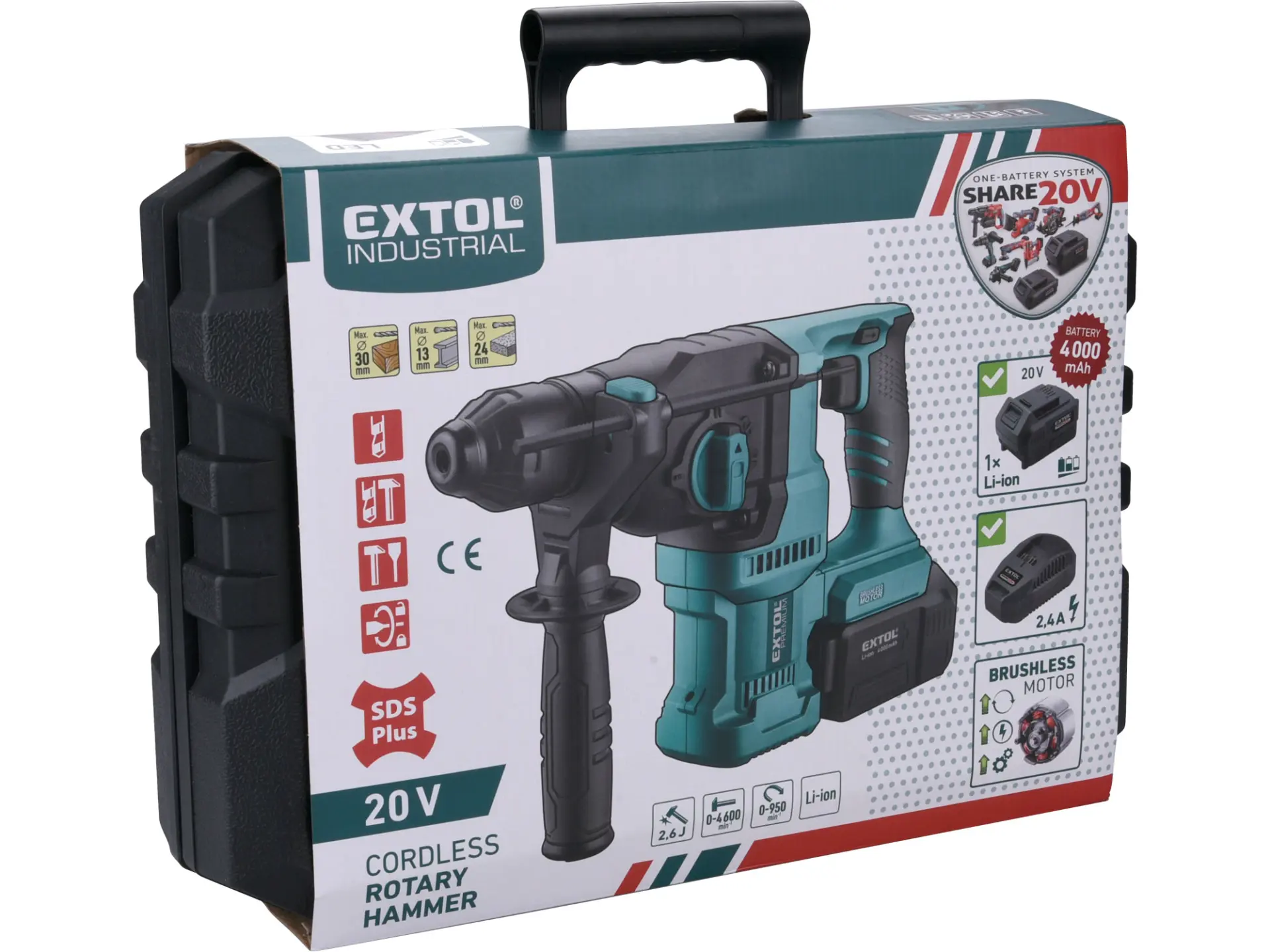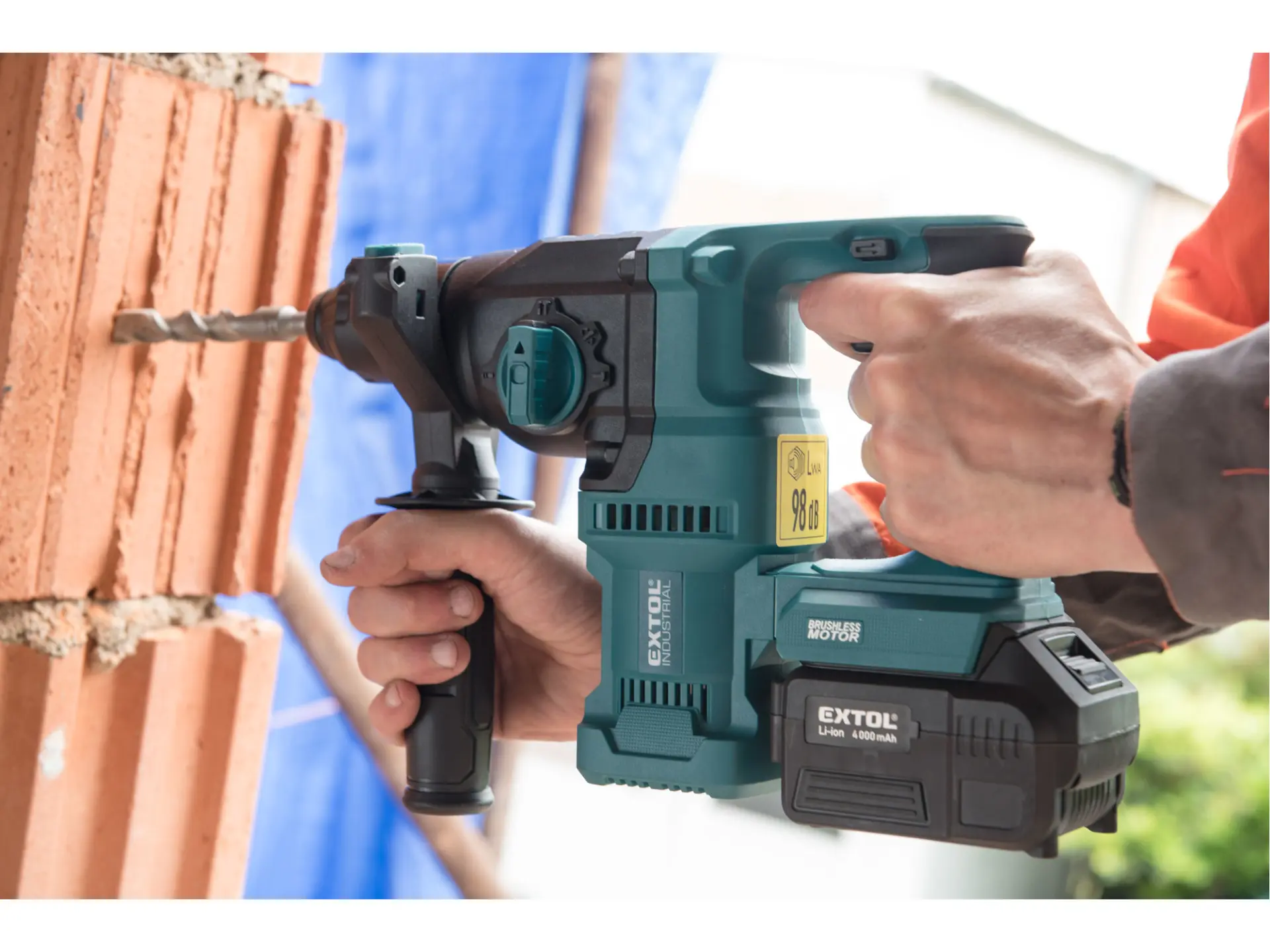 Silné aku vrtací kladivo je určeno k rychlému vrtání do cihel a betonu pomocí vrtáků s SDS plus stopkou a menším sekacím pracím. Kladivo má svisle uložený motor, což umožňuje mnohem vyšší výkon než je u kladiv s vodorovně uloženým motorem. Kladivo je poháněno nejmodernějším „brushless" motorem. Tento nový typ motoru má vyšší životnost, je výkonnější a má menší spotřebu el. energie než klasické motory s uhlíkovými kartáči. Díky výkonnému pneumatickému příklepovému systému je schopno vrtat mnohem rychleji a efektivněji než příklepové vrtačky. Veškeré nastavení typů práce jsou integrovány do jednoho přepínače 4v1 na kterém si můžete zvolit jednu s funkcí vrtání, vrtání s příklepem, sekání nebo nastavení polohy sekáče. Kladivo má zámek sekáče, takže si můžete před sekáním sekáč nastavit do patřičné polohy a při sekání bude kladivo udržovat sekáč v této poloze. Jeho hlavní výhodou je akumulátorový pohon, který dovoluje si vzít kladivo s sebou tam kde s ním potřebujete pracovat, bez ohledu na to, jestli tam je rozvod elektrické energie. Kladivo je vybaveno zpětným chodem pro snadné vytažení zaseklého vrtáku a regulací rychlosti, kterou lze využít dle vrtaného materiálu. Integrované LED osvětlení má zpožděné vypnutí a svítí ještě několik vteřin po vypnutí kladiva. Pro běžnou práci dostačují jeden nebo dva 4000mAh akumulátory, které můžete rychle nabít v rychlonabíječce, pro náročnější nebo delší práci doporučujeme větší akumulátory s kapacitou 5000–8000mAh. Akumulátor lze použít ve všech typech nářadí řady EXTOL SHARE20V. Díky použité Li-ion technologii je ho možné kdykoliv dobíjet, aniž by se tím snižovala jeho kapacita. Li-ion akumulátor ztrácí energii vlivem samovybíjení velmi pomalu a vydrží dlouho nabitý a připravený k použití.