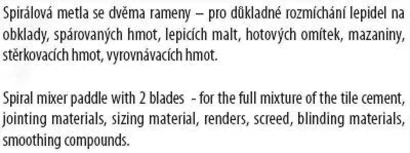 Míchadlo bez kruhu (metla), pozinkované, rozměr: 70 x 500 mm - šestihran, použití: pro důkladné rozmíchání lepidel na obklady, spárovaných hmot, lepících malt, hotových omítek, mazaniny, stěrkovacích hmot, vyrovnávacích hmot.