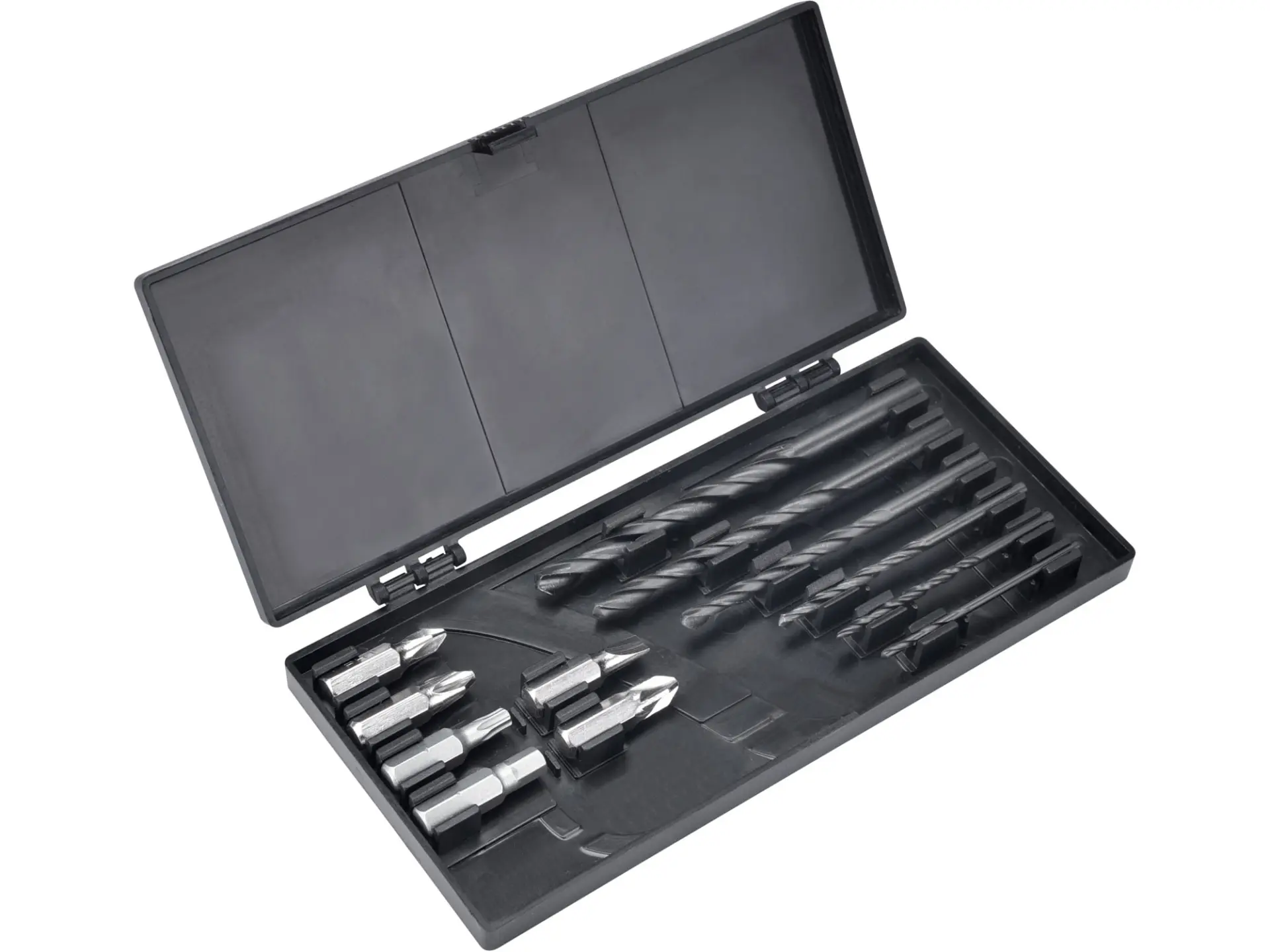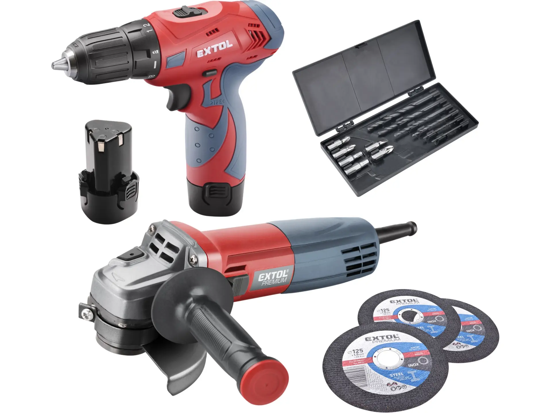 Akční sada obsahující nejpopulárnější elektrické nářadí pro práci - aku vrtací šroubovák a úhlovou brusku. Lehký a výkonný dvourychlostní vrtací šroubovák v ultra kompaktní velikosti je ideální pro středně těžké vrtání a šroubování do kovu a dřeva. Malá, praktická bruska určená pro lehké řezací a brusné práce, odbrušování svařovacích švů apod. Kompaktní rozměry umožňují pohodlnou práci jednou rukou. Celá sada je uložena v kvalitním boxu, který je kompatibilní s Extol Premium boxy. Součástí sady je také pouzdro s vrtáky a hroty a řezací kotouče. Tech. parametry úhlová bruska napětí/frekvence 230V/50Hz příkon 750W průměr kotouče 125mm závit vřetene M14 otáčky 11000/min závit rukojeti M8 hmotnost 1,7kg vrtací šroubovák aku baterie 12V Li-ion (2x) kapacita baterie 1500mAh otáčky I. 0-350/min, II. 0-1350/min L/P chod ano rychloupínací hlava polokovová, 3/8" průměr vrtáku 0,8-10mm stupňů utah. momentu 18+vrtání max. utahovací moment 21/14Nm nabíjení baterie cca 1,5h v kufru ano hmotnost s baterií 0,9kg příslušenství vrtáky 1-2-3-4-5-6mm, bity (-) 5-6mm, PH 1-2, PZ 1-2, sada 12ks, řezný kotouč 125x1mm, 3ks
