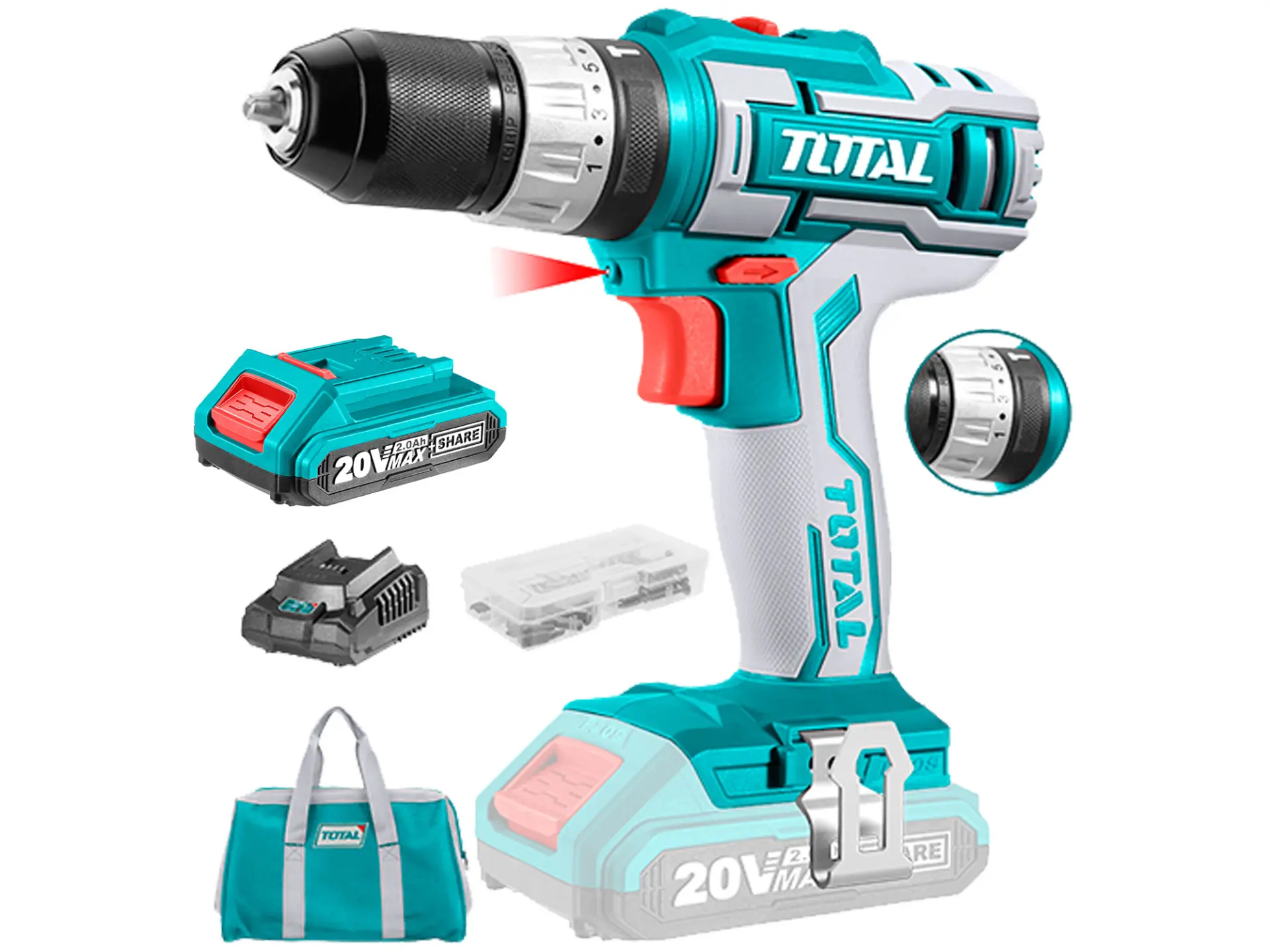 Výkonný vrtací šroubovák AKU disponuje 18 stupňů utahovacích momentů, vrtání a vrtání s příklepem. Šroubovák má 45NM, což je více než dostatečné pro poloprofesionální použití. Sestava má k dispozici dvě baterie s kapacitou 2000mAh, rychlonabíječku a 50ks příslušenství. AKU vrtací šroubovák s příklepem je vybaven protiskluzovou úpravou rukojeti a integrovaným LED světlem. Rovněž je vybavena dvoustupňovou mechanickou přepínací rychlostí. Samozřejmostí je rychloupínací hlava a Auto-lock funkce. Tento výrobek patří do kategorie P20S.