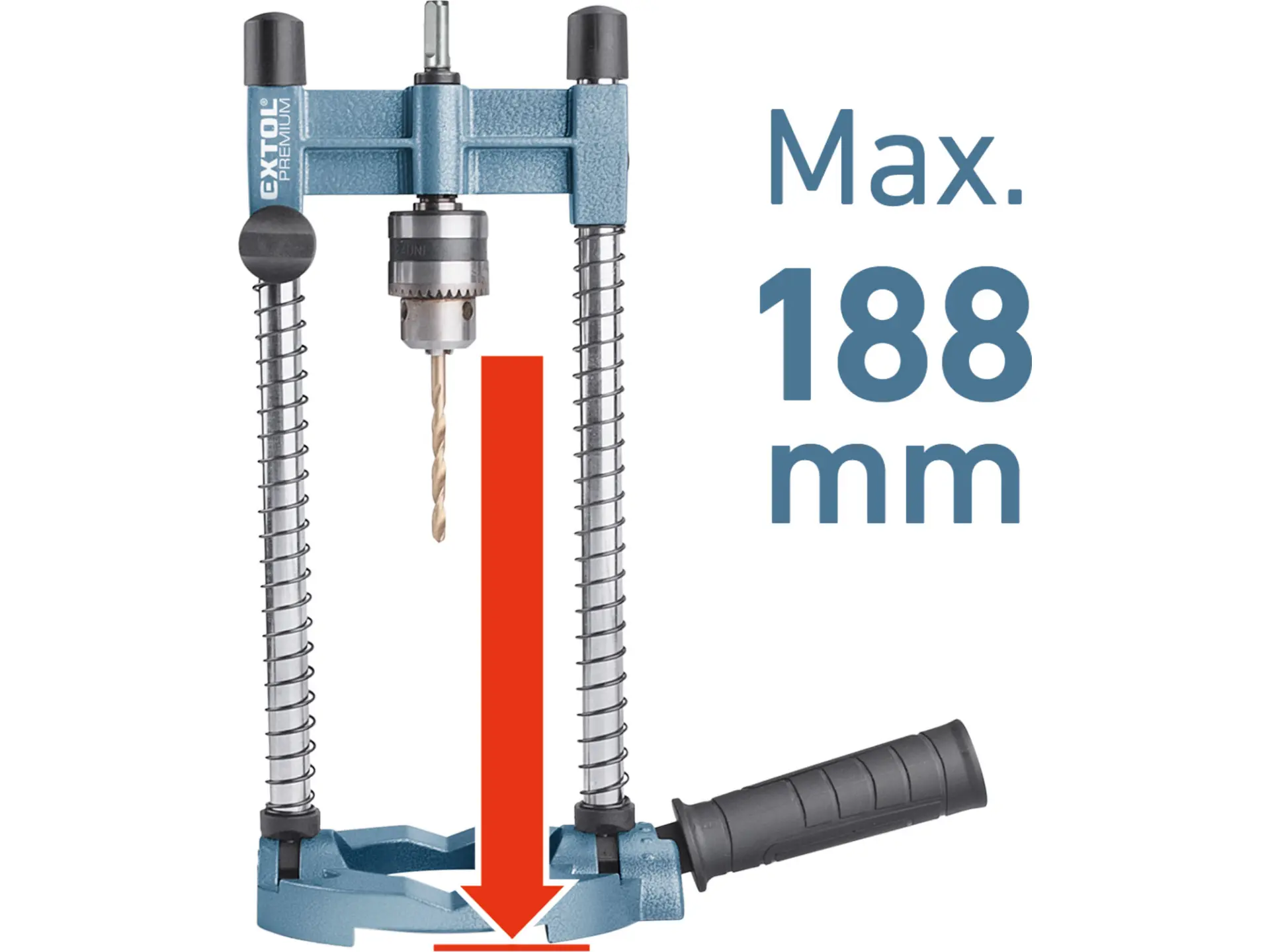 max výška mezi sklíčidlem a spodní části základny je 188mm a max. průměr vrtání (při použití korunek) je 75mm, což je průměr otvoru v základně