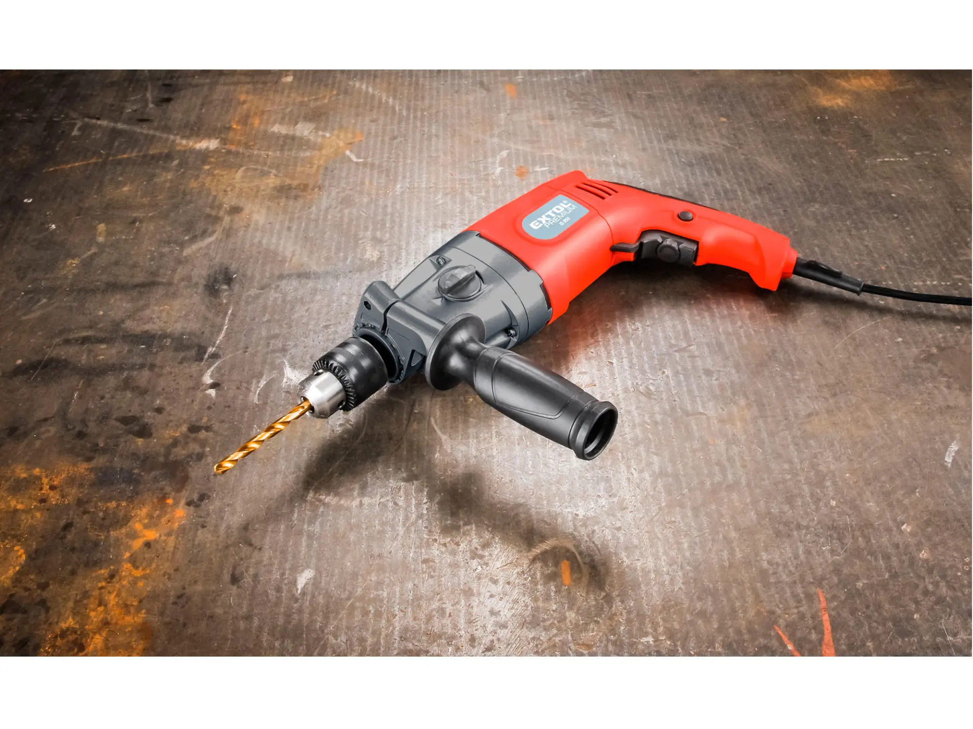 Velmi výkonná dvourychlostní příklepová vrtačka s celokovovým rychloupínacím sklíčidlem (model 8890052), vhodná k vrtání do zdiva a kovů či k míchání barvy.