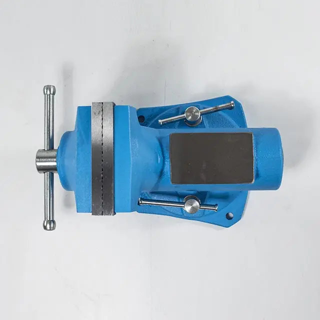 Otočný dílenský svěrák s čelistmi z vysoce kvalitní oceli kalenými na 45 HRC ± 5 HRC. Horizontálně otočná základna. Litinové tělo s opracovanými upínacími čelistmi a kovadlinou. Velká kovadlina Integrovaná, otočná deska ±35° s polohovacími šrouby. Přesné válcové vedení. Upevnění k základové desce maticemi. Přichycení k desce stolu šrouby. Vratidlo s bezpečnostními koncovkami.
