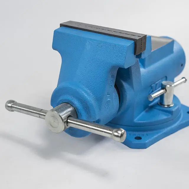 Otočný dílenský svěrák s čelistmi z vysoce kvalitní oceli kalenými na 45 HRC ± 5 HRC. Horizontálně otočná základna. Litinové tělo s opracovanými upínacími čelistmi a kovadlinou. Velká kovadlina Integrovaná, otočná deska ±35° s polohovacími šrouby. Přesné válcové vedení. Upevnění k základové desce maticemi. Přichycení k desce stolu šrouby. Vratidlo s bezpečnostními koncovkami.