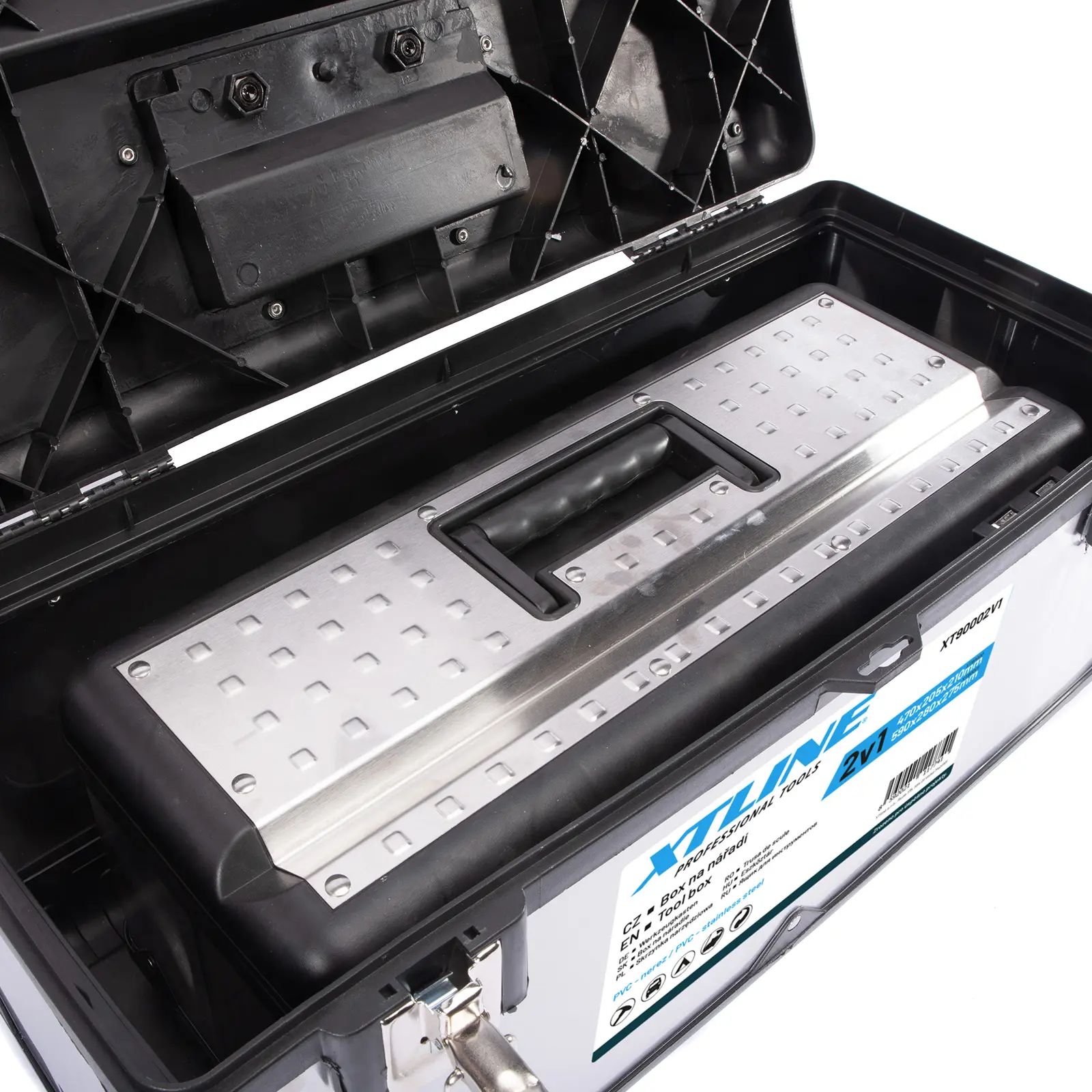 Profesionální box na nářadí v kombinaci plastu a nerezu. Pevný a odolný pro vysokou zátěž, je možné jej použít i jako stupínek (max. 100 kg). Kovové přezky a oko na uzamčení visacím zámkem. Žlábek pro zakládání trubek a latí při řezání. Obsahuje box XT90000 a XT90001.
