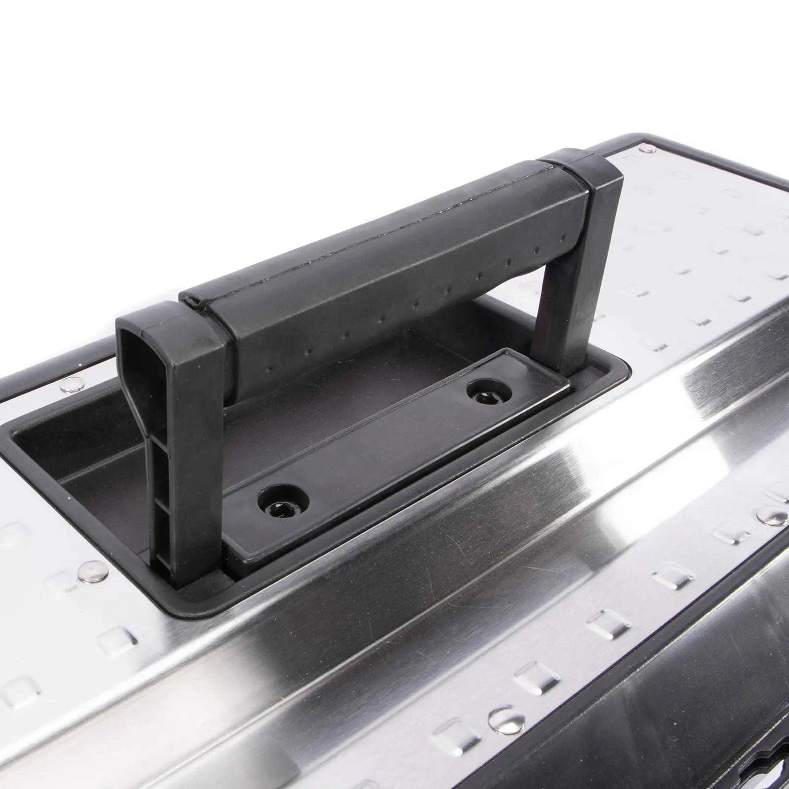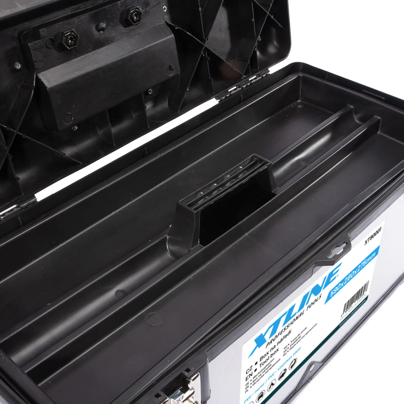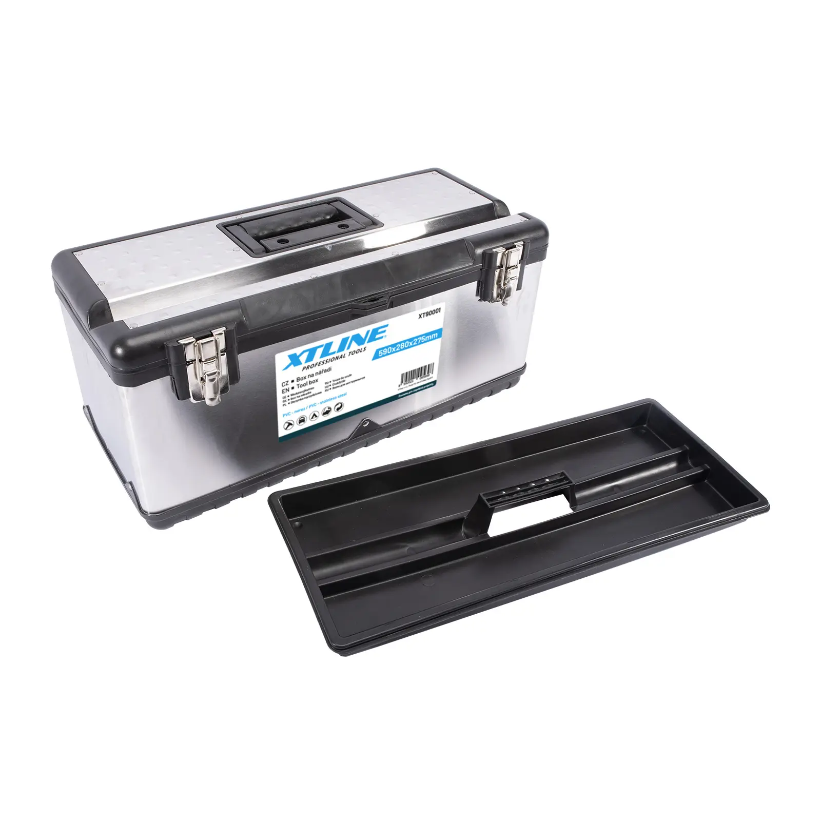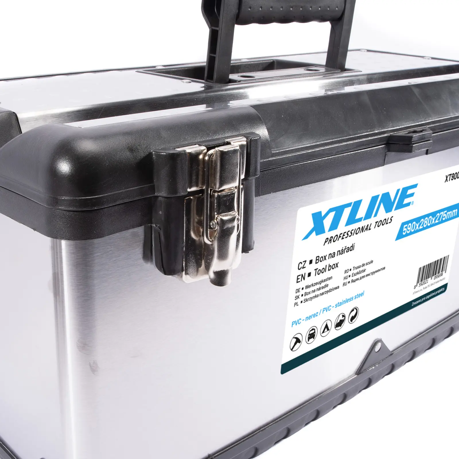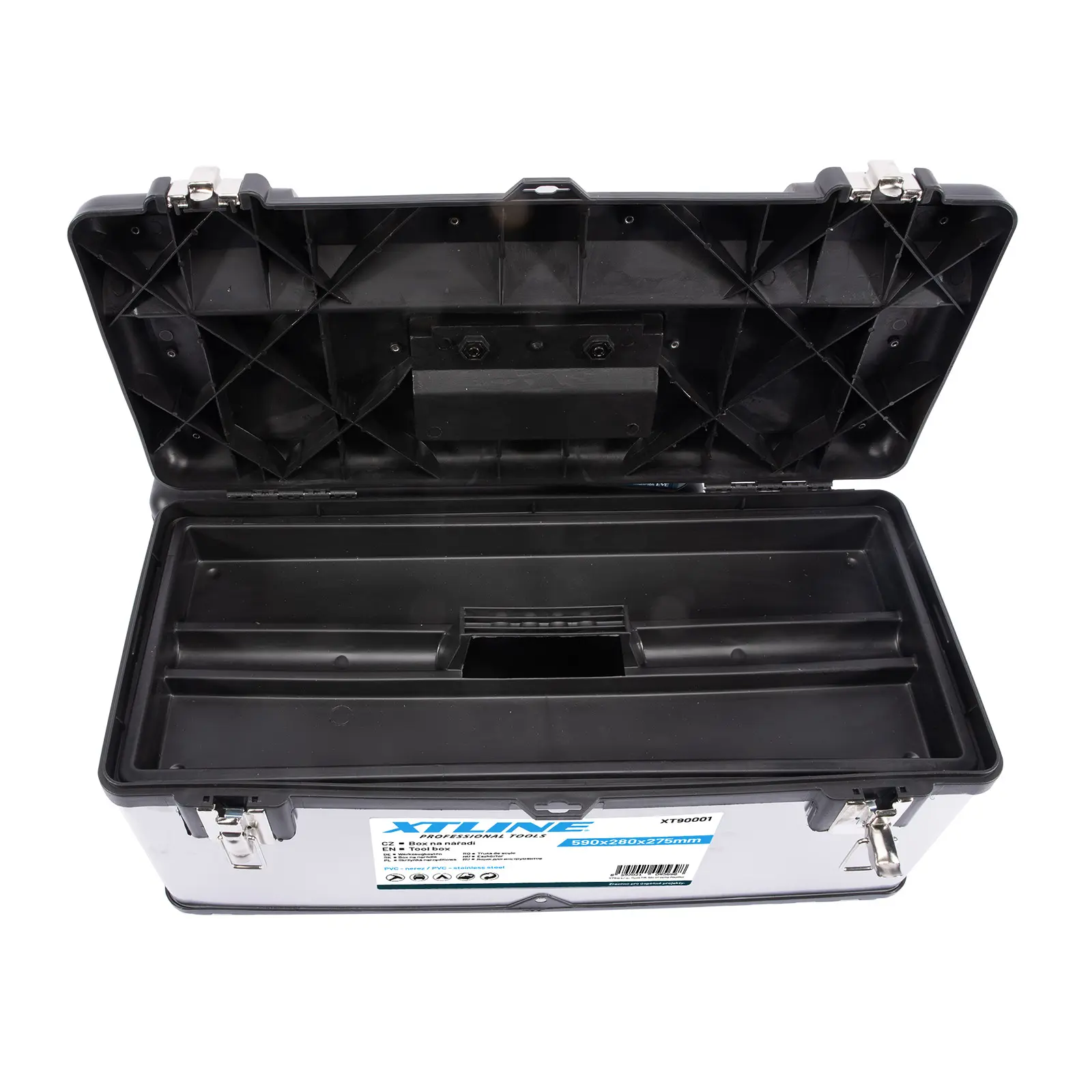 Profesionální box na nářadí v kombinaci plastu a nerezu. Pevný a odolný pro vysokou zátěž, je možné jej použít i jako stupínek (max. 100 kg). Kovové přezky a oko na uzamčení visacím zámkem. Žlábek pro zakládání trubek a latí při řezání.