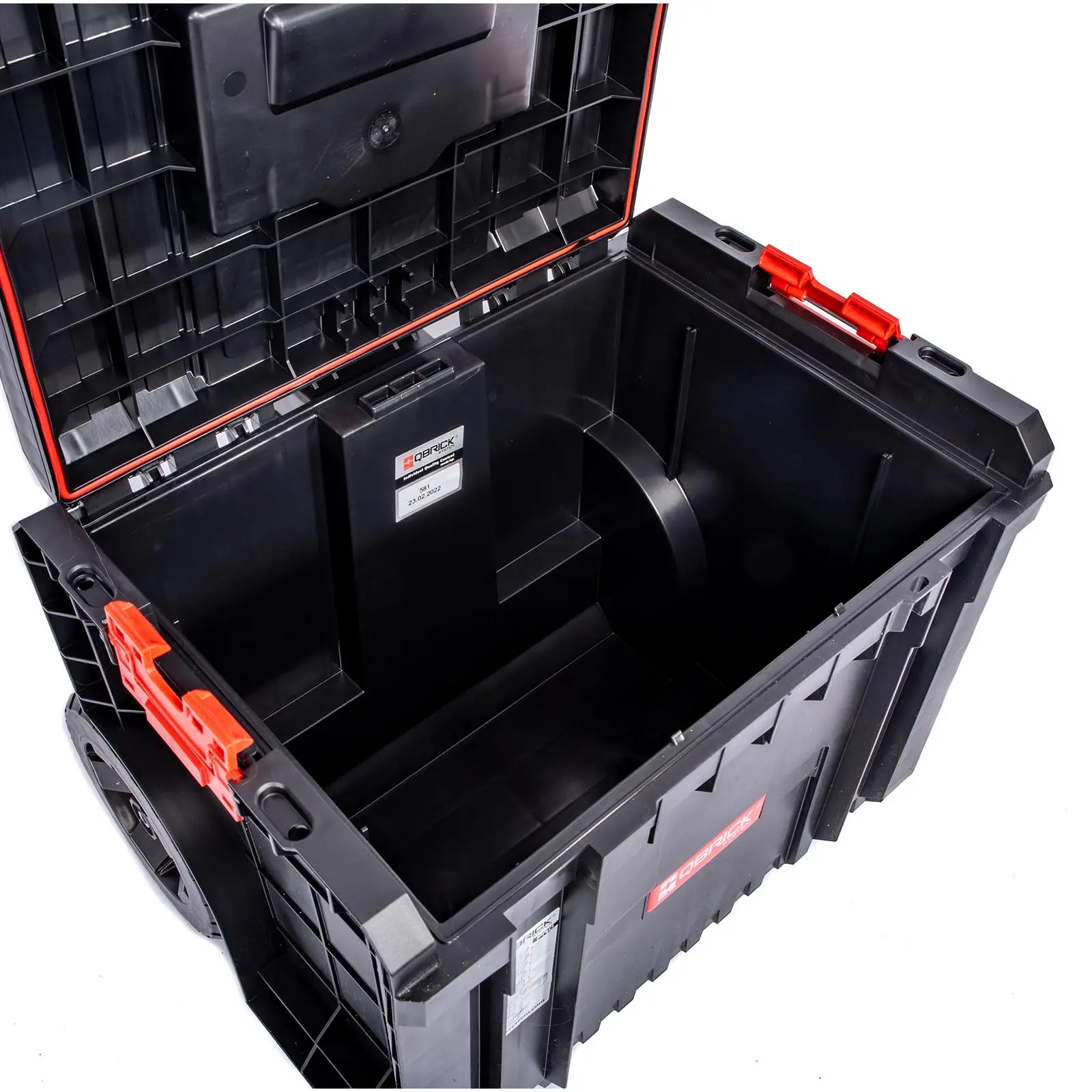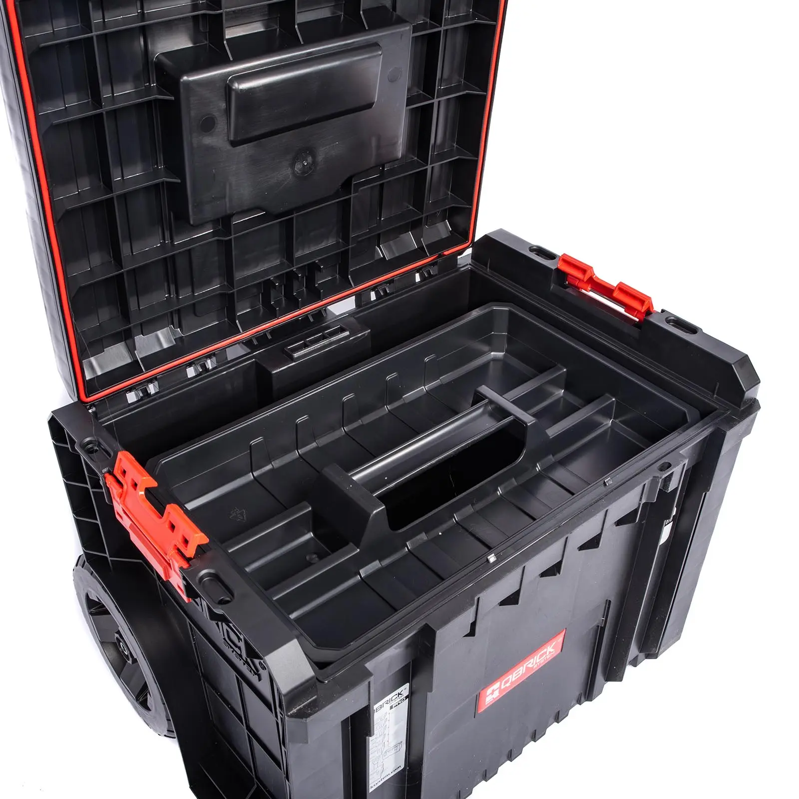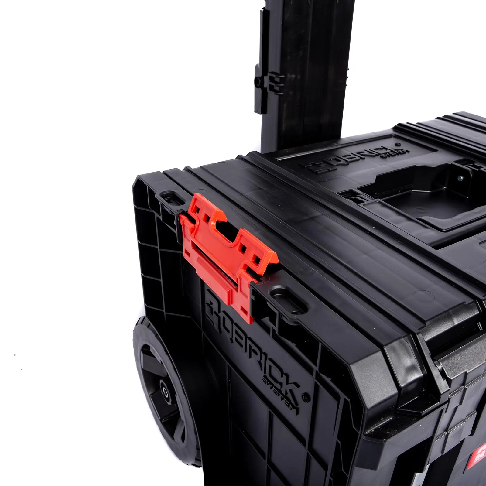 Box na nářadí s kolečkami disponuje teleskopickou hliníkovou rukojetí pro snadný převoz z místa na místo.Pevné spojovací prvky a boční spojky z polyamidu poskytují bezpečnost přepravovaného nářadí.Konstrukce je vodotěsná a prachotěsná a má flexibilní těsnění ve víku.