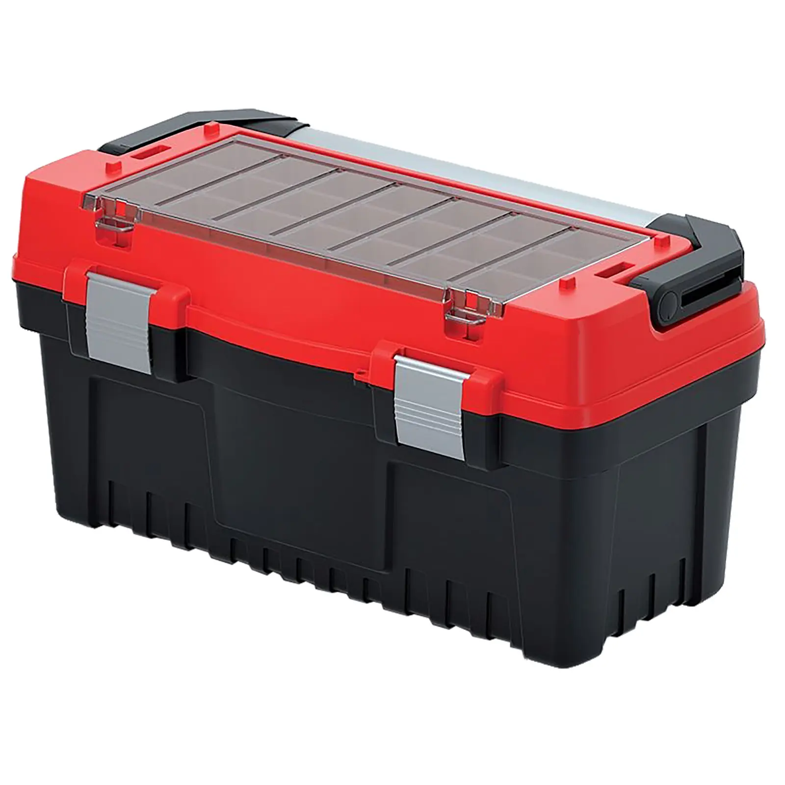 Plastový box na nářadí pro přehledné uložení a snadné přenášení nářadí. Panty vyztužené kovovýmičepy. Kovové zámky. Na víku jsou dvě krabičky na šroubky, vruty, hmoždinky apod. Robustní hliníkovárukojeť přes celou délku boxu. Součástí kufru je vyjímatelný vklad.