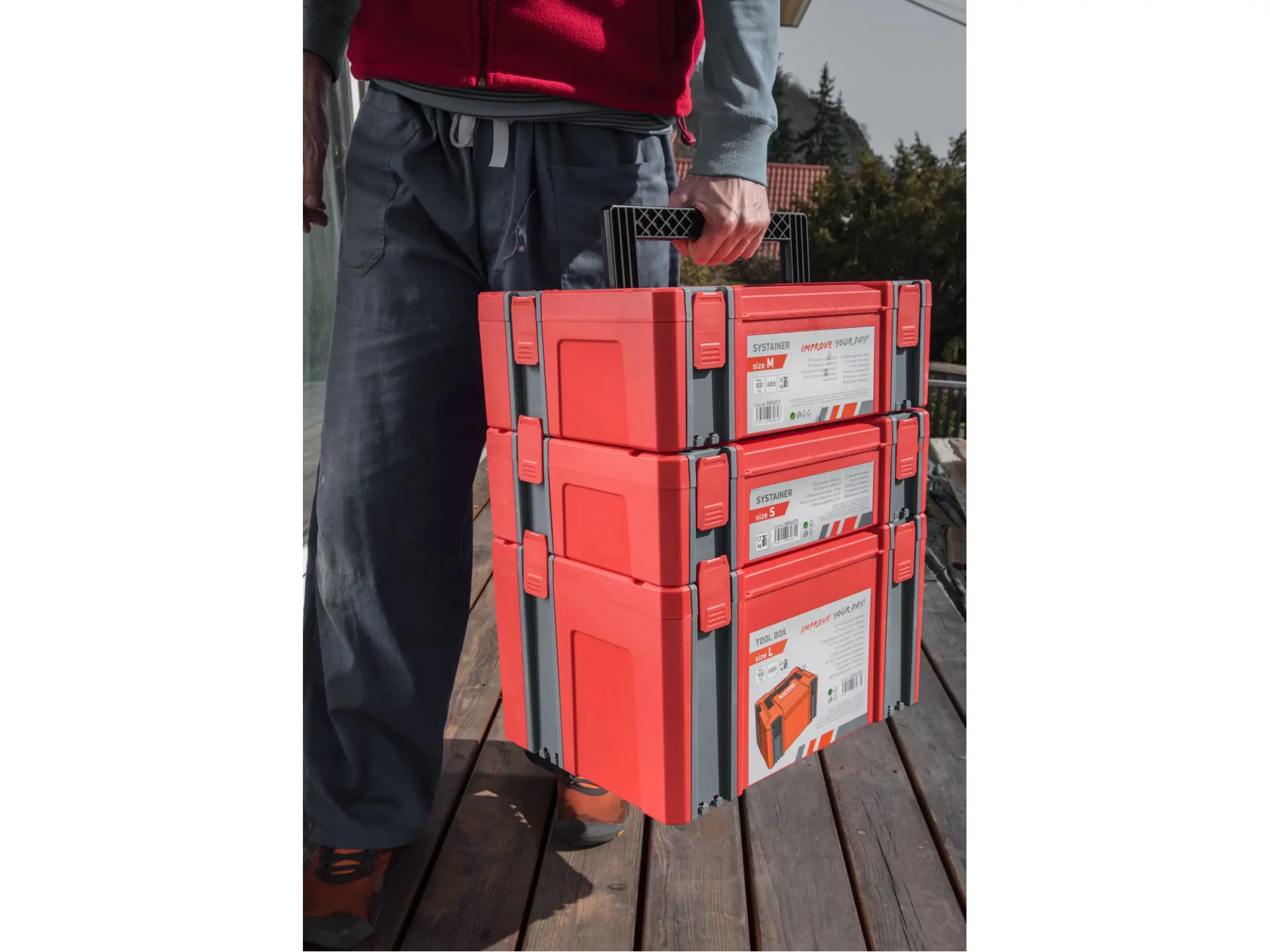 vnitř.rozměr 427x292x95mm, možnost pevného spojení více boxů dohromady pomocí posuvných zámků, box velikosti L umožňuje přimontování koleček, díky kterým je mobilní, což je výhodou zejména v okamžiku