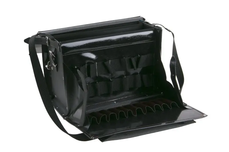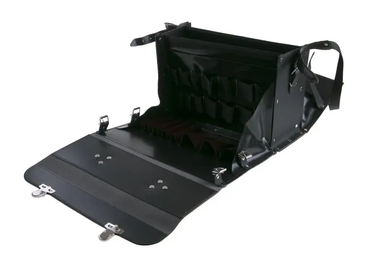 Profesionální brašna rozkládací. Nabízí maximální užitnost každého prostoru v ní. U tohoto typu si lze otevřít přední i zadní stěnu. Brašna je ze syntetické usně, je pevně vyztužená ze všech stran. Obsahuje pět řad vnitřních kapes na nářadí a jednu prostornou kapsu na předním dílu. Možnost otevření předního a zadního dílu nabízí přehlednou manipulaci s nářadím. Dvě řady kapes jsou přizpůsobeny na velmi jemné nářadí, jde o dvě vnitřní statické příčky na kterých jsou gumy pro uchycení nářadí. Vhodná pro velké množství nářadí, na montážní práce a jiné. Uspokojí i nejnáročnějšího uživatele. Při zavřené poloze vypadá stejně jako brašna 37342. Brašna je ušita speciální PES nití Amann, nosnost nitě je 12 kilo, švy jsou dále v exponovaných místech nýtovány. Prvky: přední a zadní část tašky lze odklopit, držadlo, popruh přes rameno s nárameníkem, pevně vyztužená. Vnitřní konstrukce: 1 kapsa na předním díle na dokumenty, 3 řady přihrádek na nářadí, vnitřní příčky s gumovámi úchyty na drobné nářadí. Výztuhy: dno, hřbet, boky, přední i zadní díl. Hlavní materiál: syntetická useň.