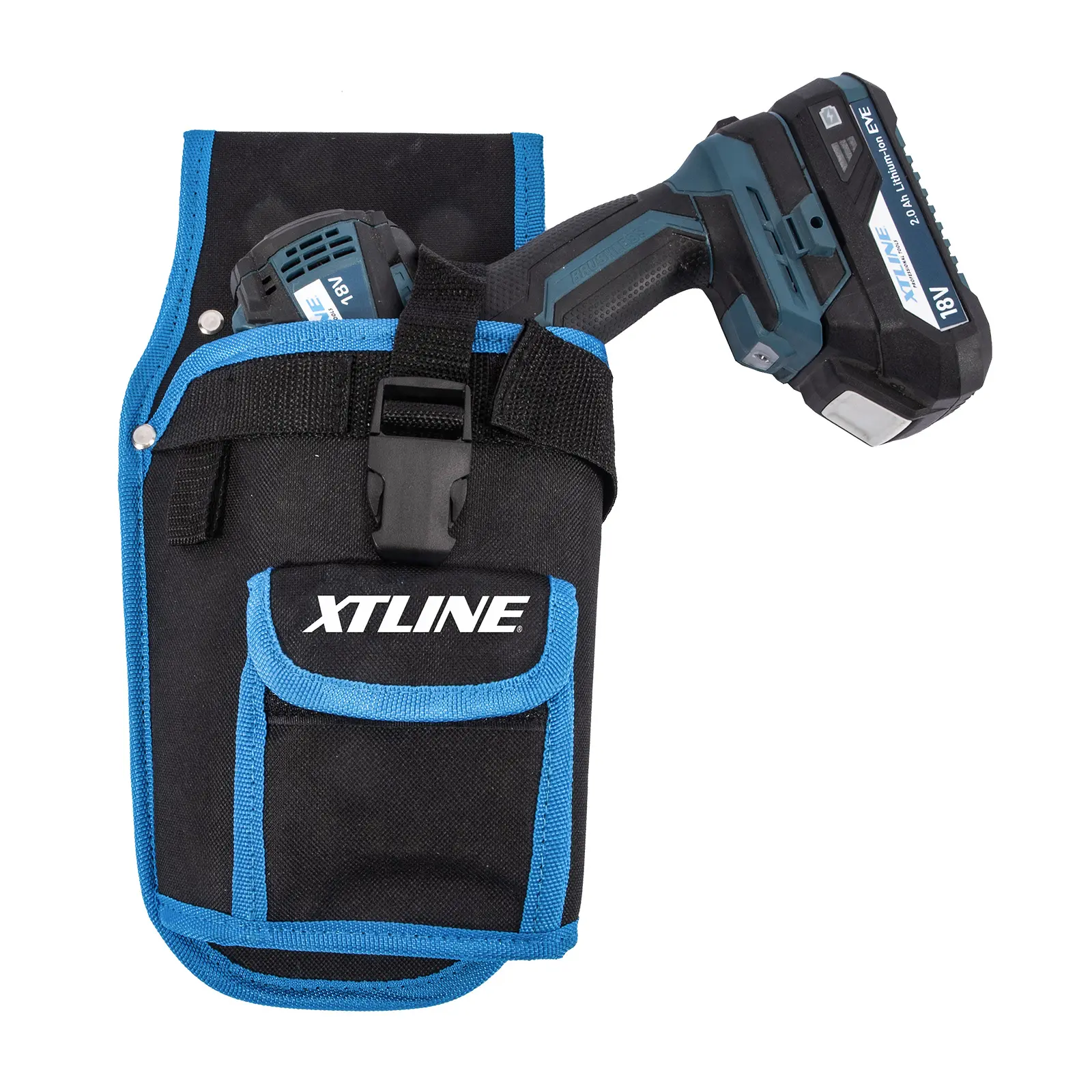 Pouzdro o rozměru 280x160 mm obsahuje 2 poutka na nářadí, průžnou kapsu na šroubovák, kapsu na 13 bitů a pojistný pásek na aku vrtačku.