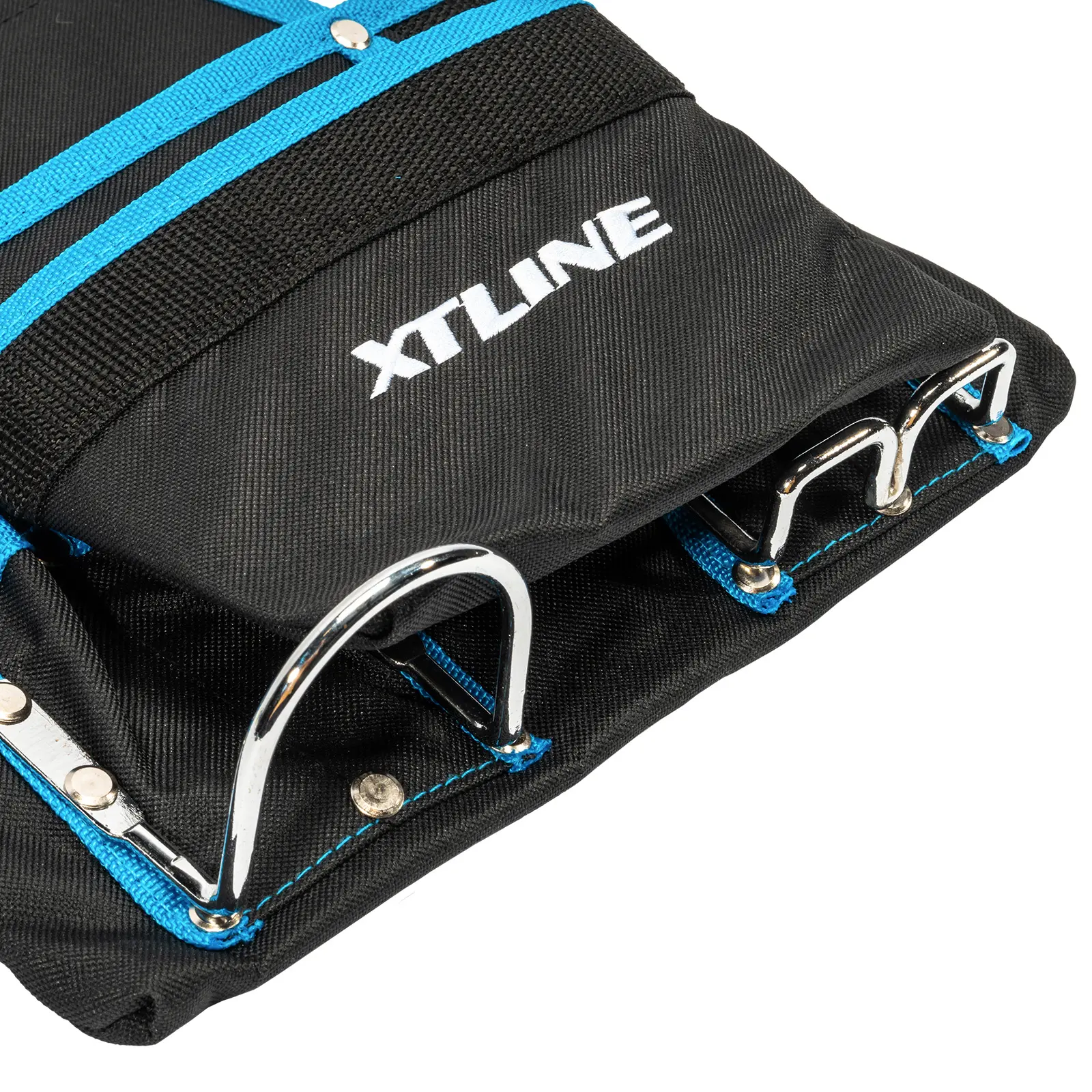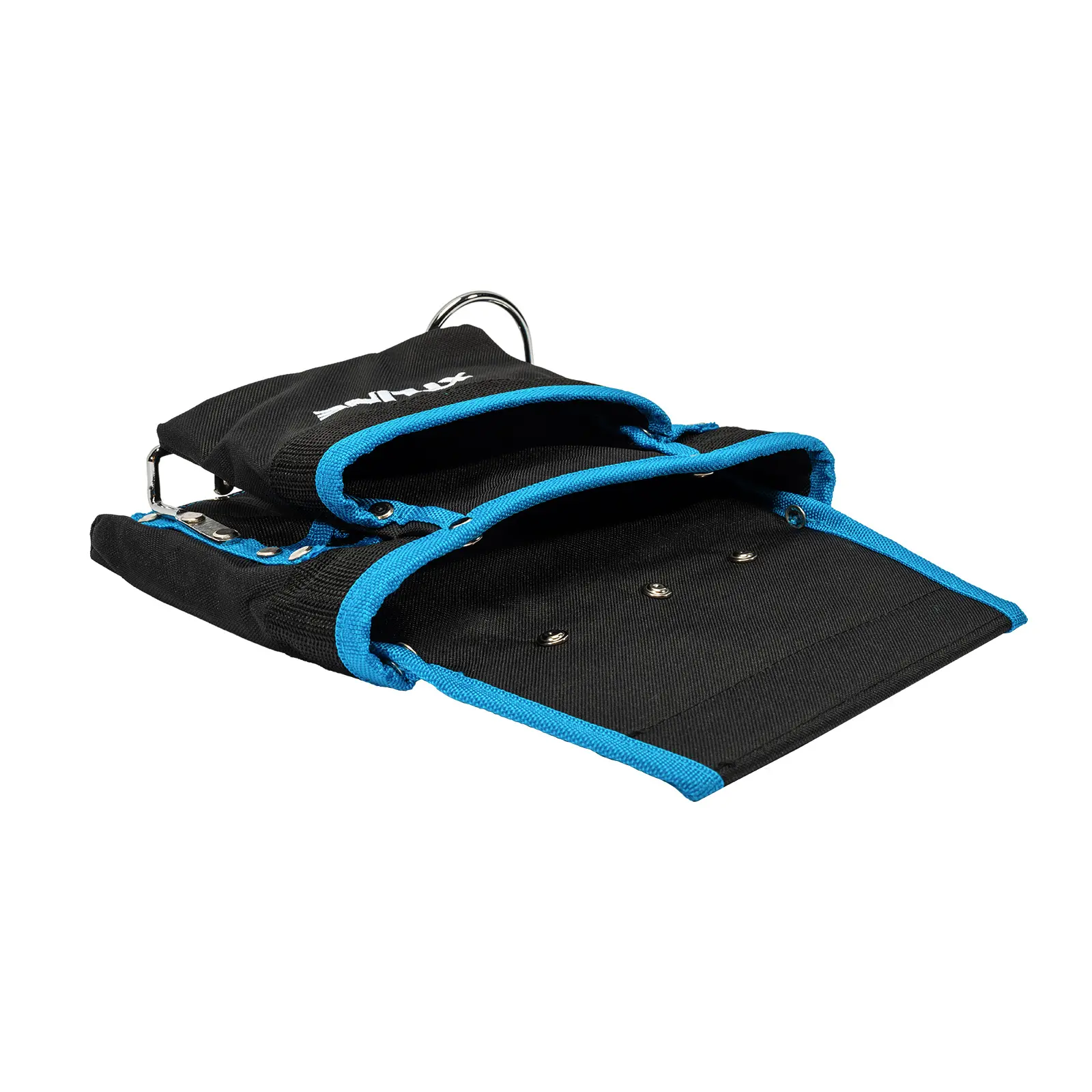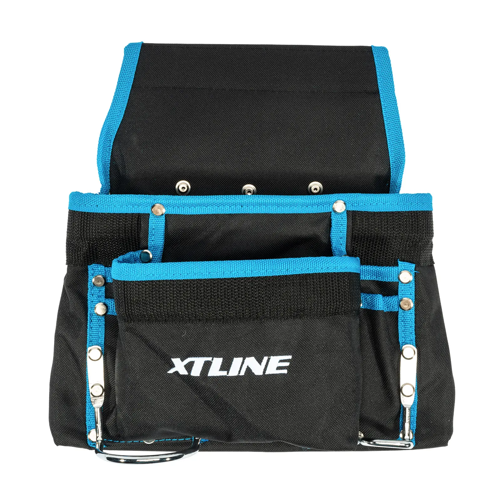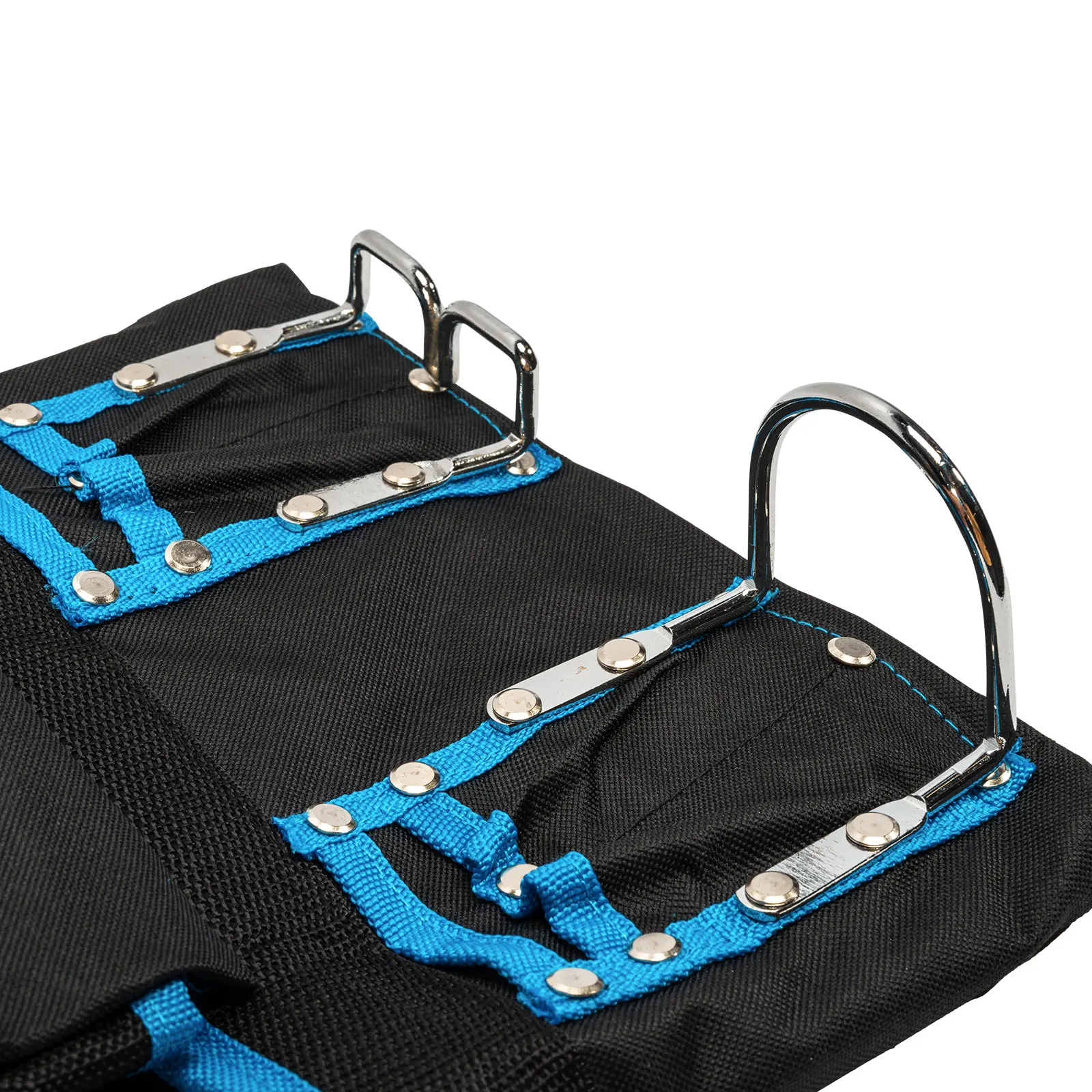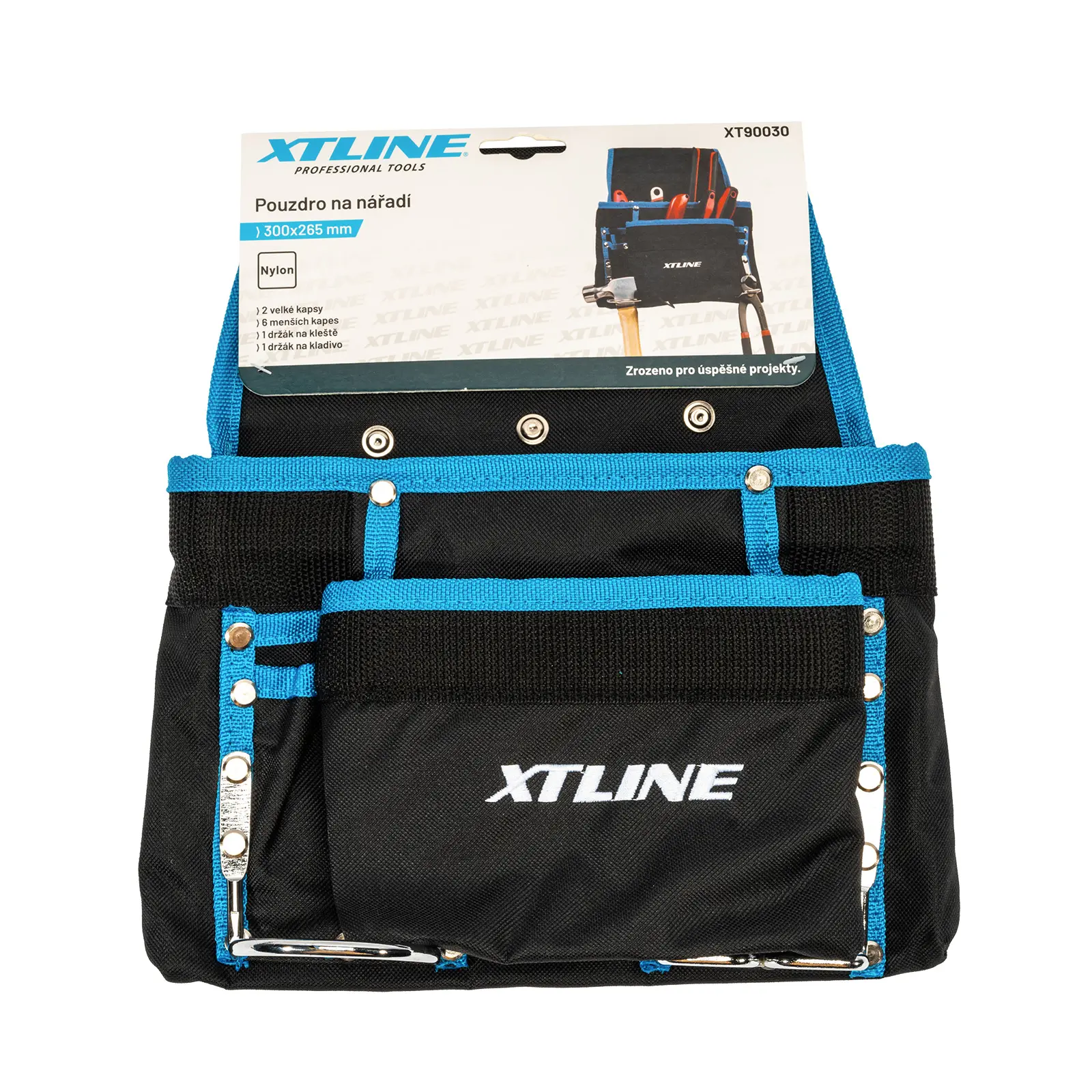Pouzdro na nářadí o rozměru 300x250 mm obsahuje 2 velké kapsy, 6 menších kapes, držák na kleště a držák na kladivo.