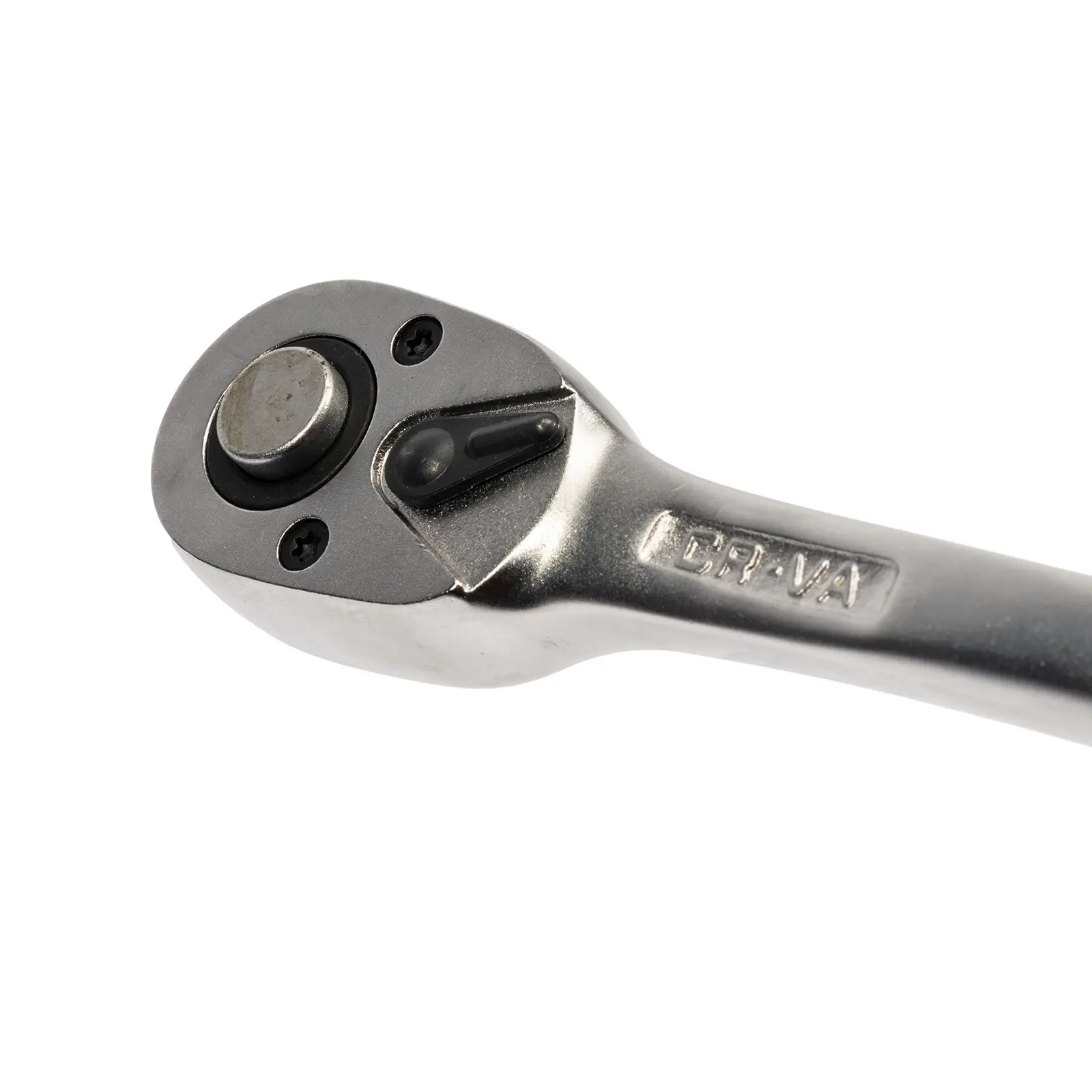 Ráčna s 36 zuby a přepínací páčkou. Pogumovaná, protiskluzová rukojeť. Chromový povrch odolný proti korozi. Aretace pevně drží hlavici na čtyřhranu a vylučuje samovolné uvolnění.Rychlá a snadná výměna hlavice pomocí pojistky.Technologie: pískovaný MBD povrchpojistný kolík pro jednoruční výměnu hlavicjednolitý korupus ráčny včetně rukojeti pro vyší pracovní zatíženíspeciálně tvrzená nejnamáhanější část ráčny