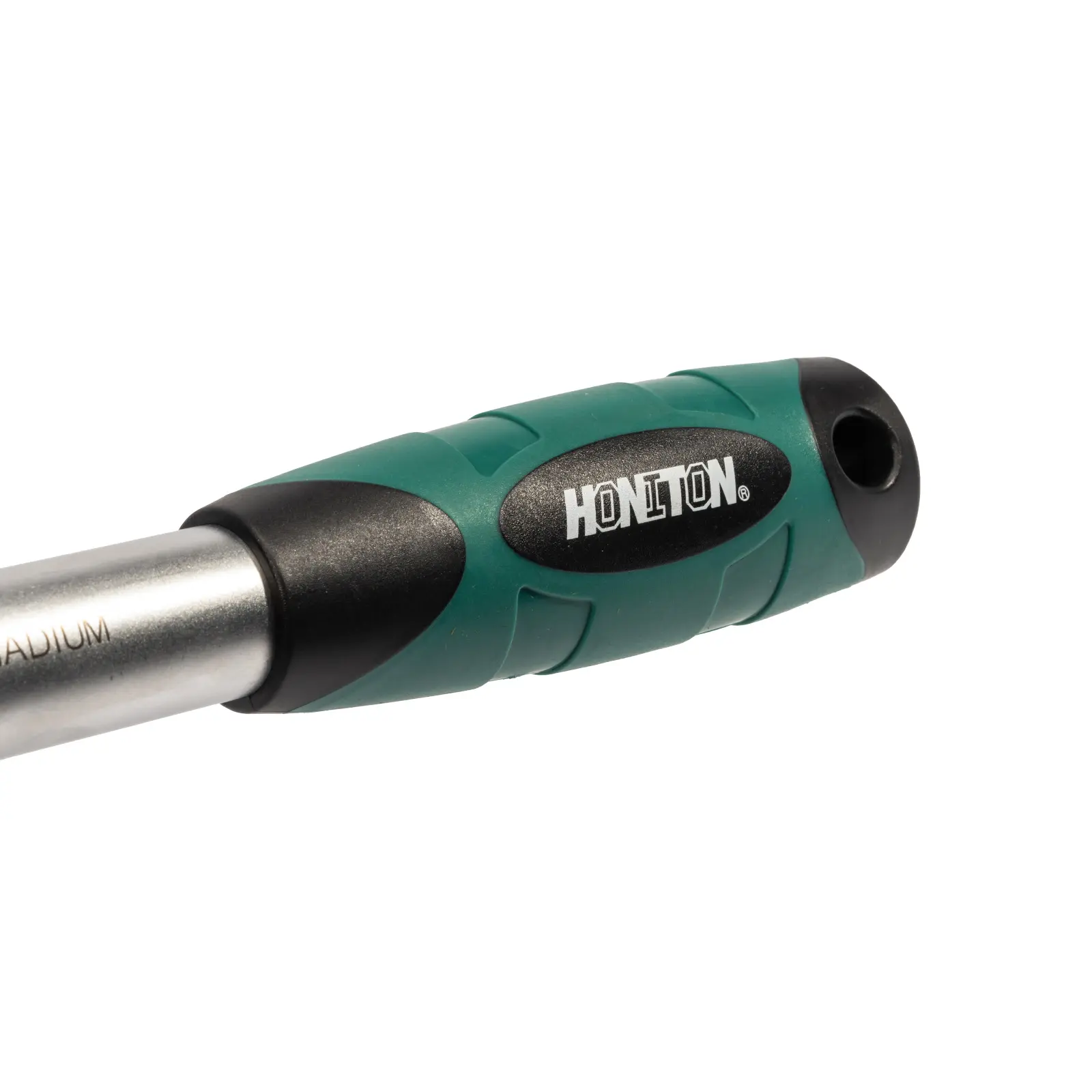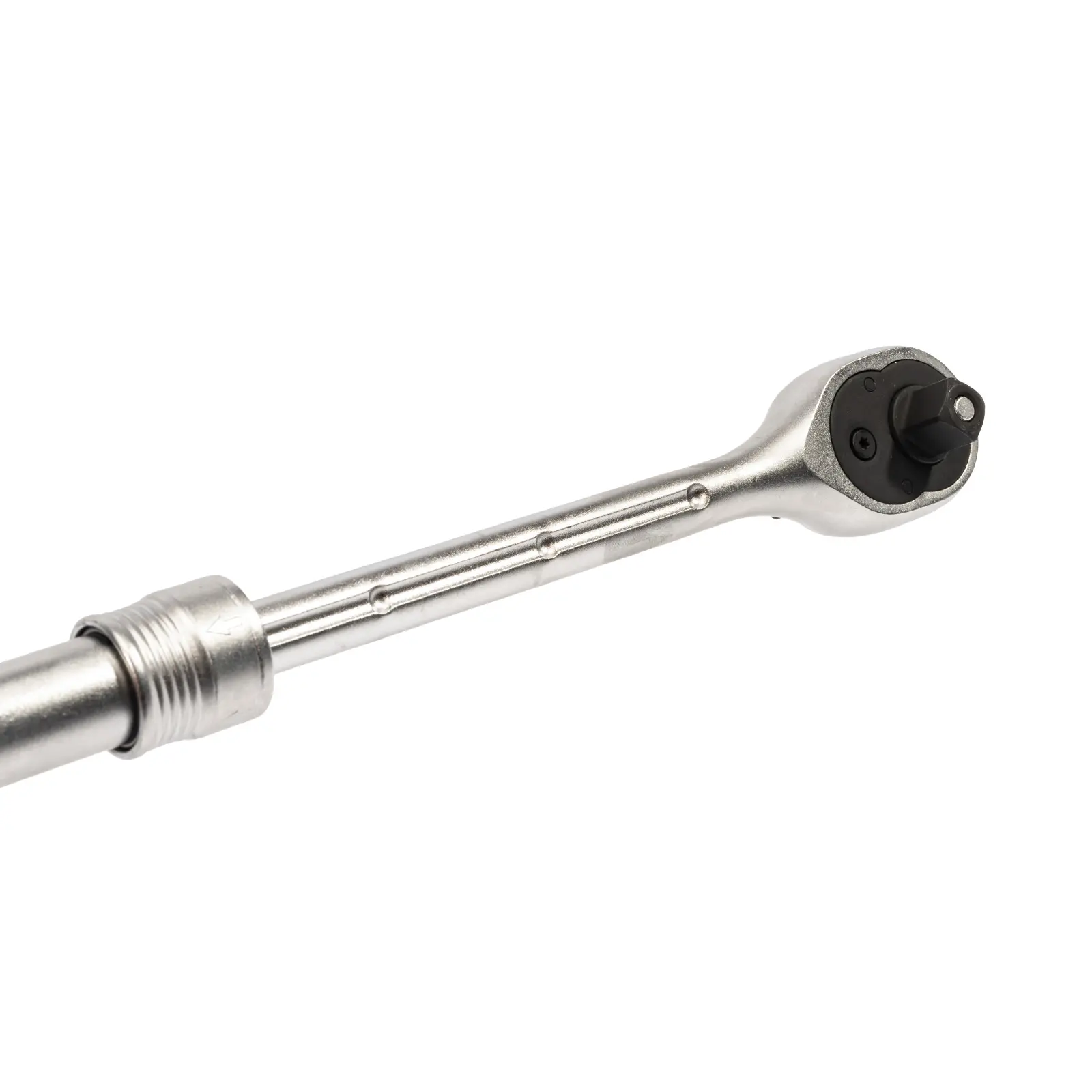 Ráčna teleskopická s pogumovanou rukojetí, kterou lze pomocí uvolnění aretace prodloužit cca o 100mm a tím zvýšit pákový efekt při utahování.