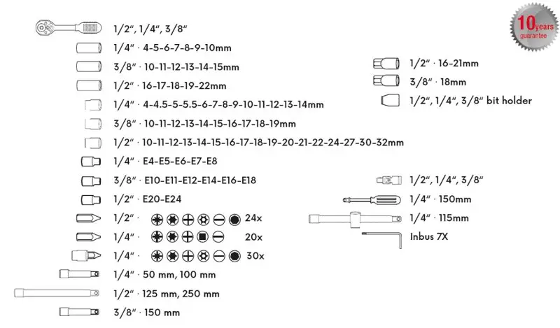 Sada hlavic a nástavců 1/4,3/8,1/2. Všechny části jsou vyrobeny z chrom-vanadiové oceli kováním, dobře kombinovaná sada v přehledném plastovém kufru, ráčny s přepínací páčkou a uvolňovacím tlačítkem, ergonomicky tvarovaná rukojeť.