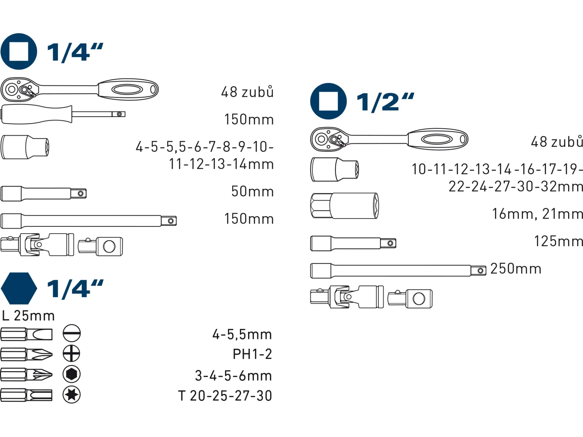 1/4": 4-5-5,5-6-7-8-9-10-11-12-13-14mm, 1/2": 10-11-12-13-14-16-17-19-22-24-27-30-32mm