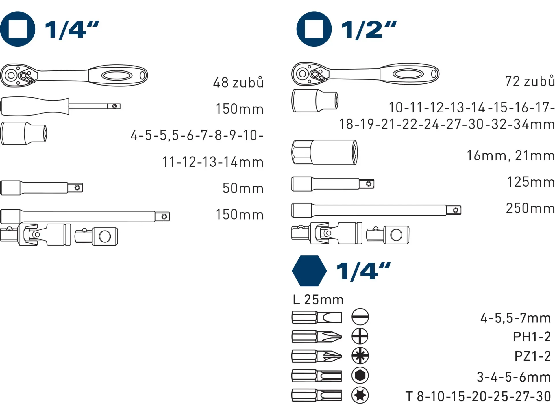 1/4": 4-5-5,5-6-7-8-9-10-11-12-13-14mm, 1/2": 10-11-12-13-14-15-16-17-18-19-21-22-24-27-30-32-34mm