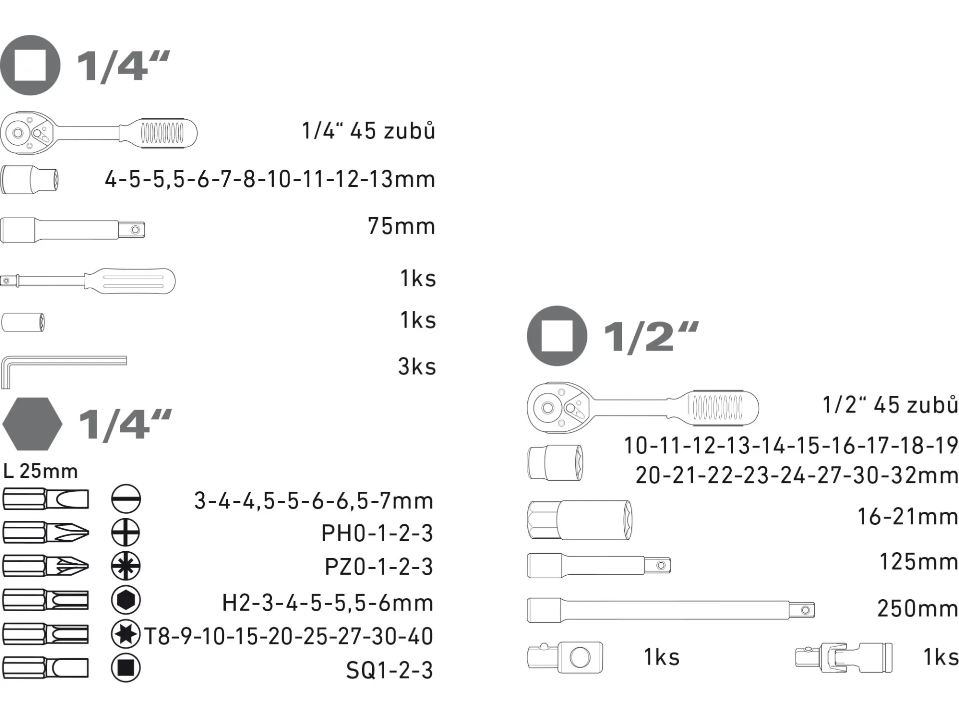 1/4": 4-5-5,5-6-7-8-10-11-12-13mm, 1/2": 10-11-12-13-14-15-16-17-18-19-20-21-22-23-24-27-30-32mm