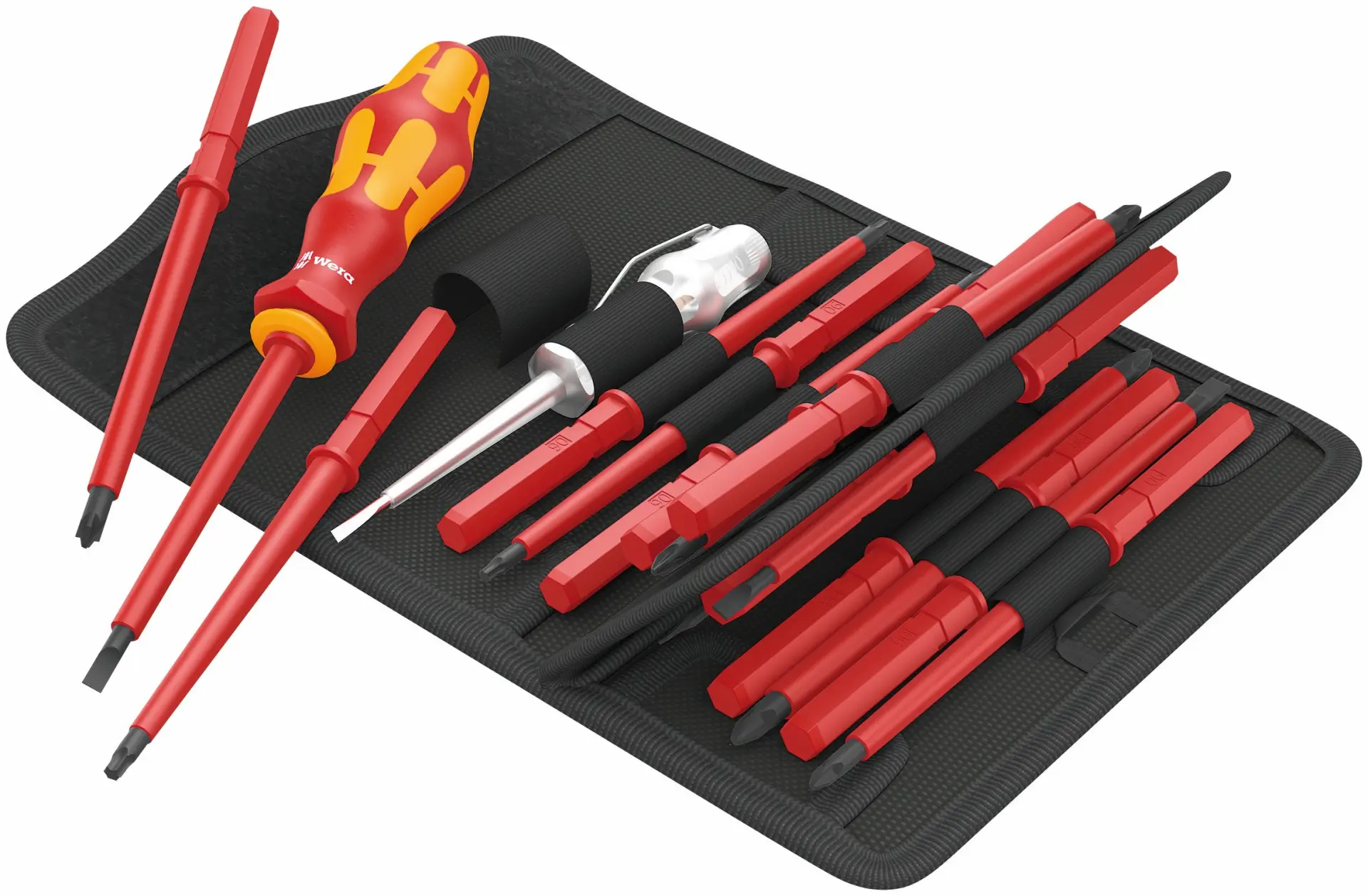 14 výměnných čepelí VDE s ručním držákem 817 VDE Kraftform a jednopólovou zkoušečkou napětí v robustní brašně s popruhem.