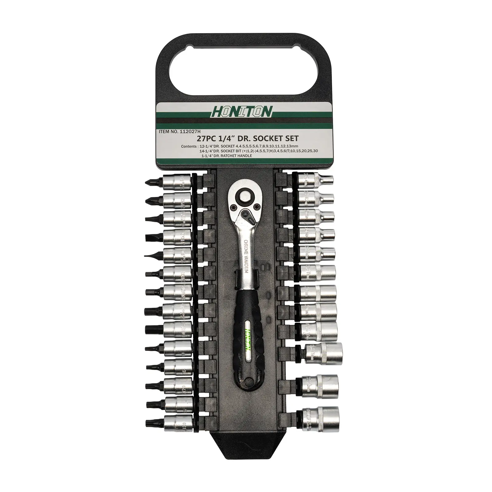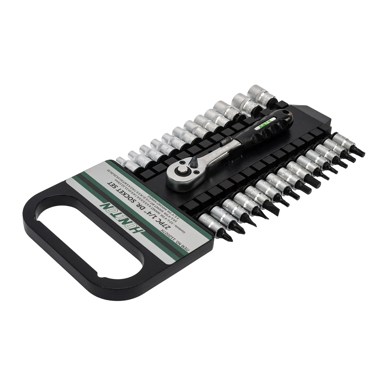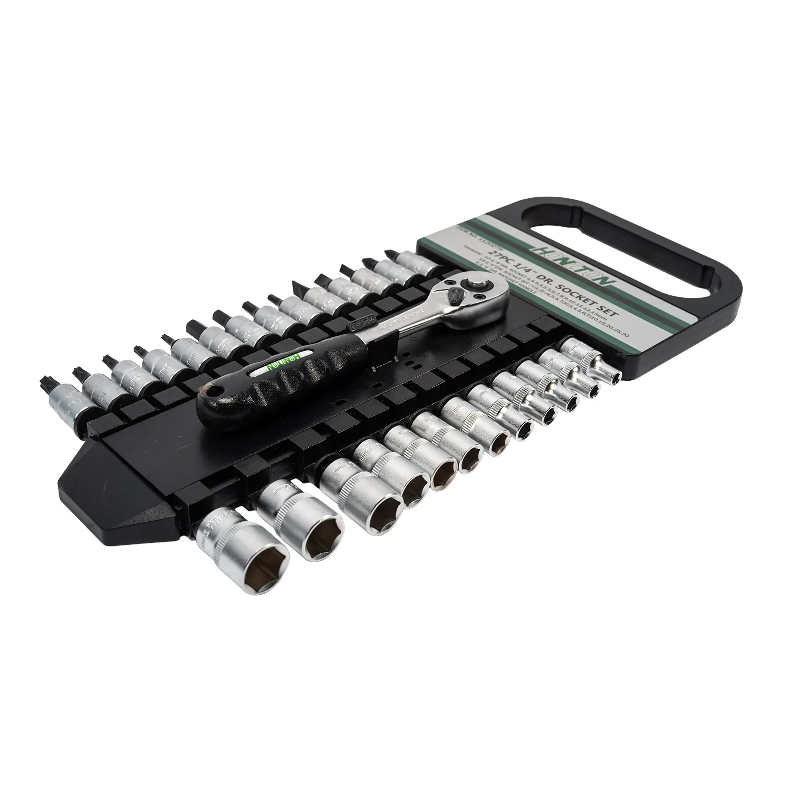 Sada 1/4" hlavic 4-13mm, nástrčných PH,PL,IMB a TRX hlavic a ráčny na plastovém držáku.