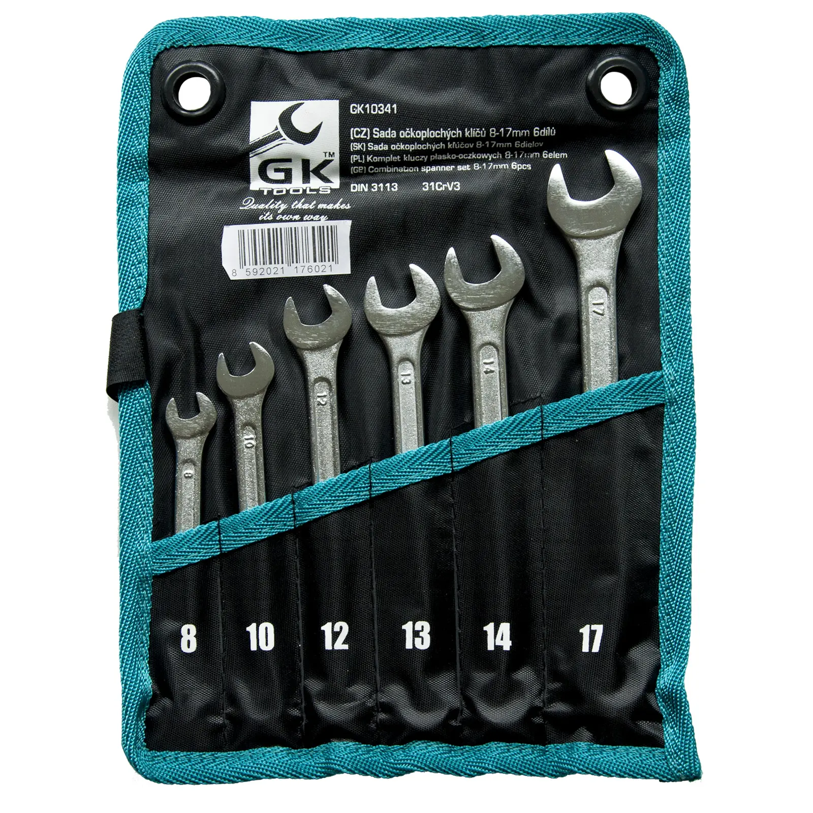Sada očkoplochých klíčů je uložena v plastovém držáku. Klíče jsou z jedné strany ploché otevřené, ze strany druhé je dvanáctihranné očko.