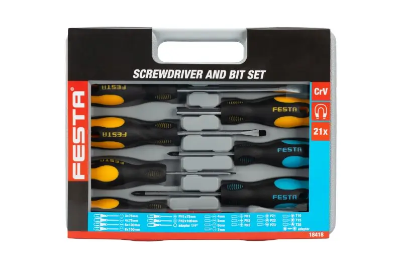 • 1x šroubovák na bity, 14x bit ploché 4, 5, 6, 7 - PH 1, 2, 3 - PZ 1, 2, 3 - Torx T 15, 20, 25 a adapter šestihran 1/4" / čtyřhran 1/4"