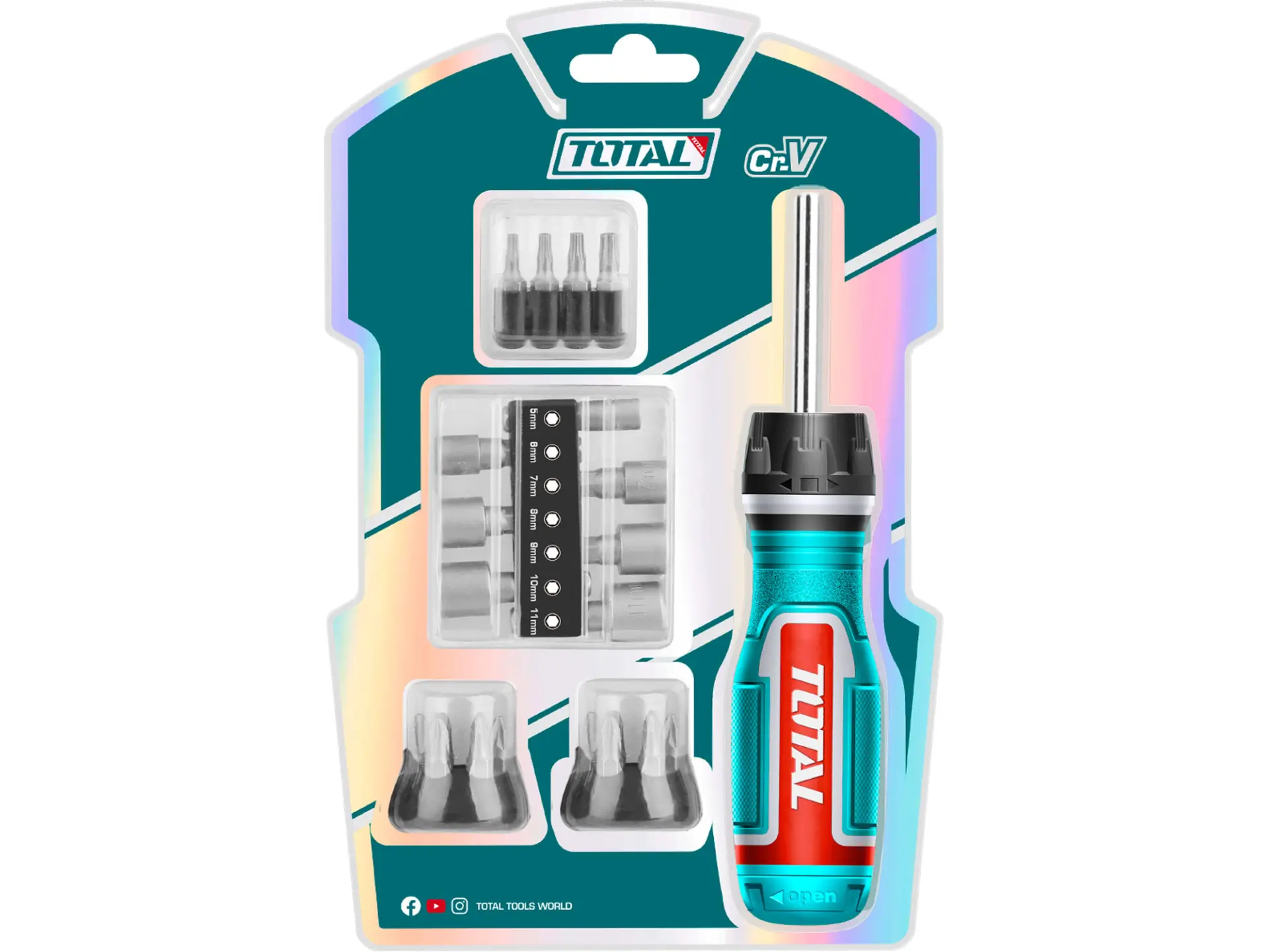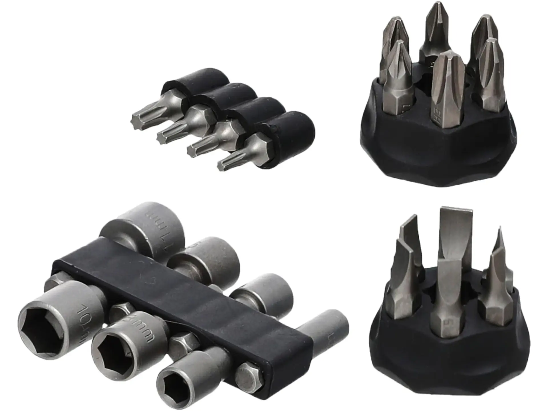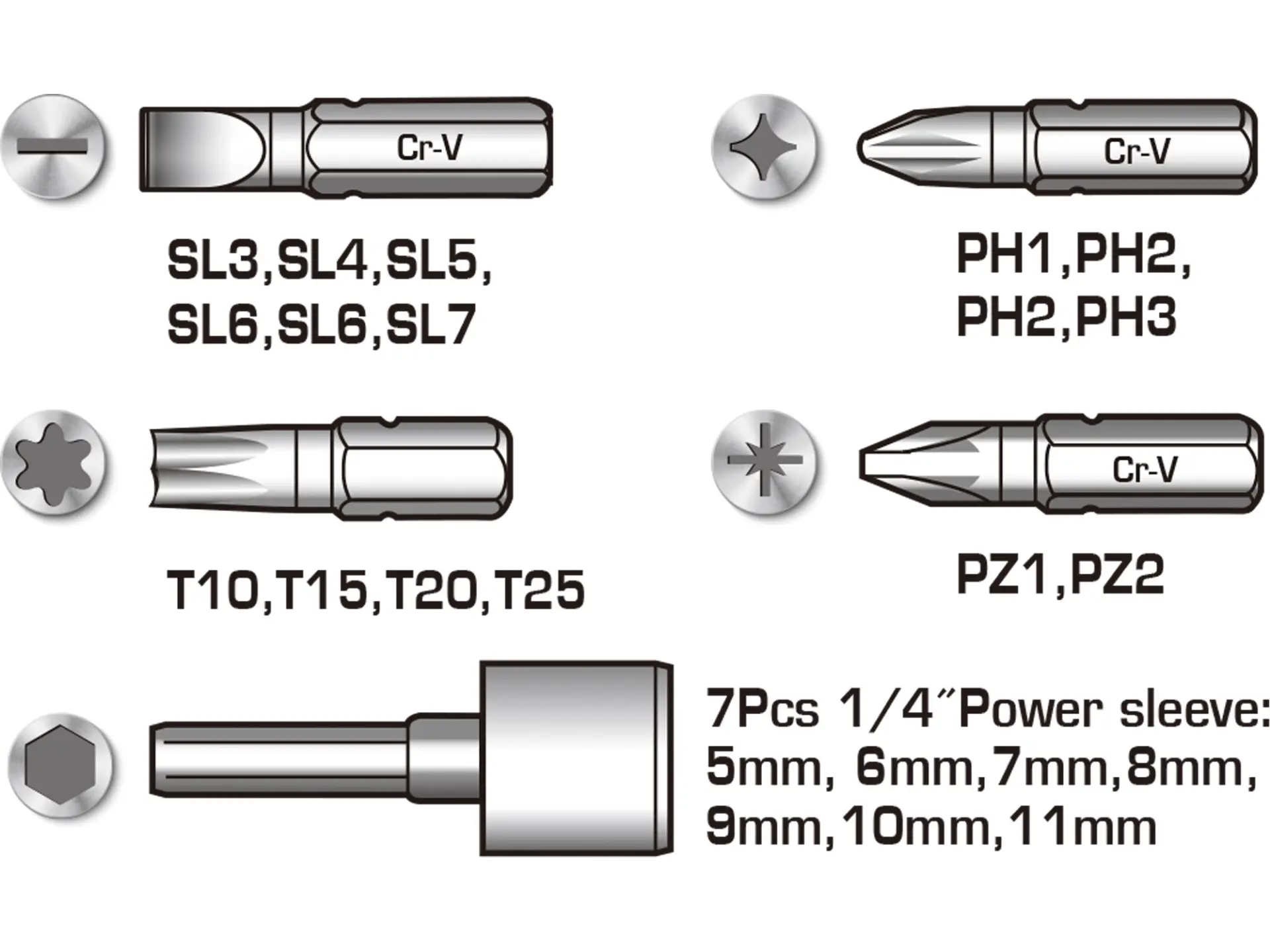 16ks 6.35x25mm hrotů: SL3,SL4,SL5,SL6,SL6,SL7,PH1,PH2,PH2,PH3,PZ1,PZ2,T10,T15,T20,T25, 7ks 1/4" zástrčných hlavic: 5,6,7,8,9,10,11mm , 1ks ráčnového šroubováku
