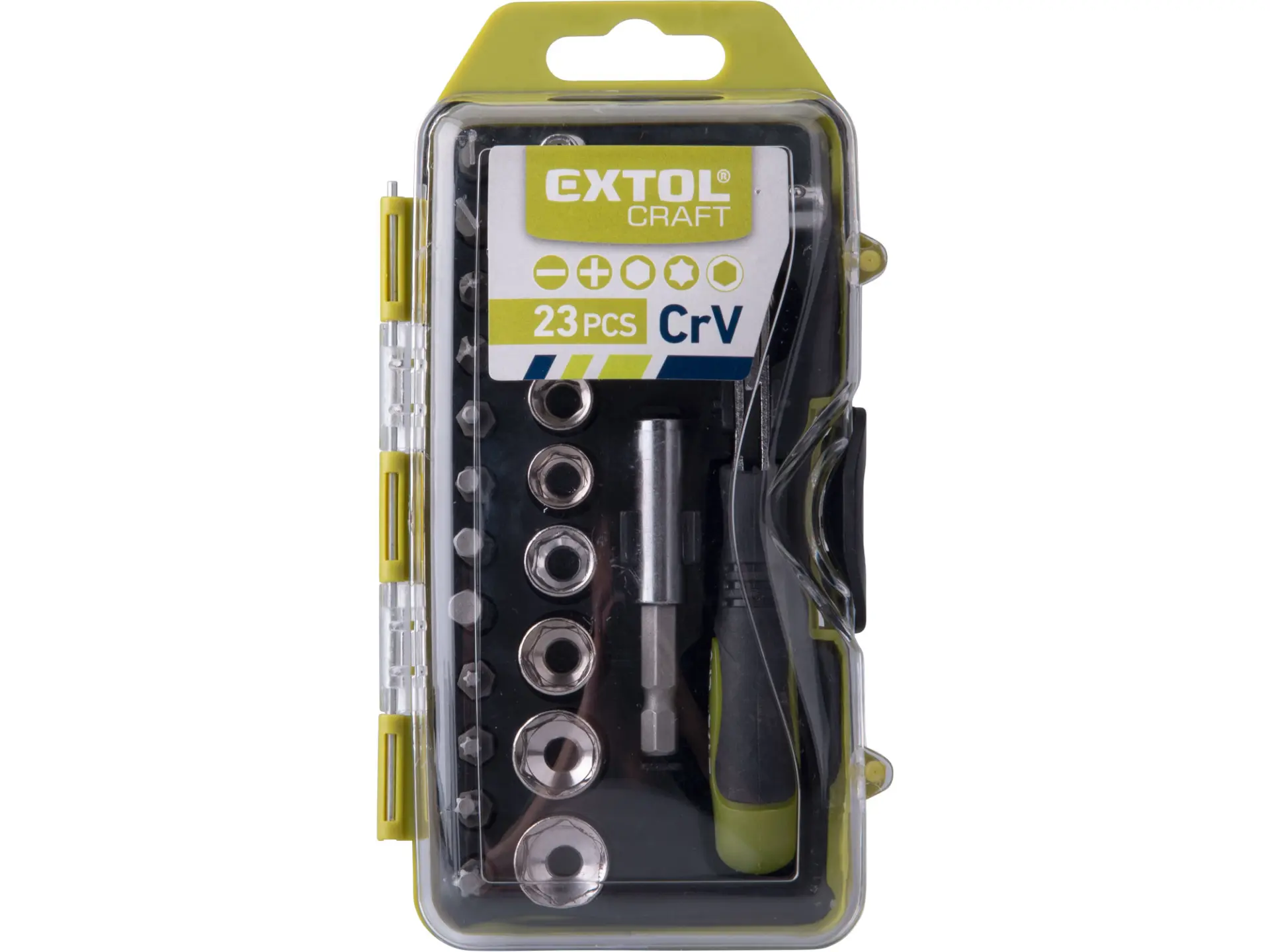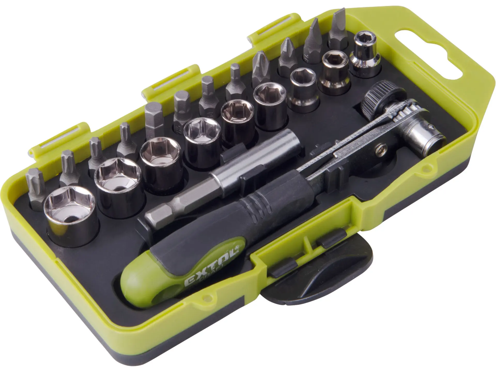 (-) 5-6mm, PH 1-2, HEX 3-4-5-6mm, T 15-20-25-30, hlavice 4-5-6-7-8-9-10-12-13mm, 1/4" magnetický nástavec na hroty 60mm, kombinovaná ráčna zakončená 1/4" vnitřním šestihranem na hroty a vnějším 1/4" č