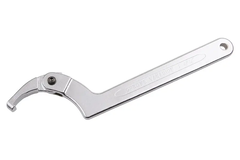 Stavitelný hákový klíč pro límce, kroužky a ložiska. Jediná čelist s upínacím kolíkem v průmyslové povrchové úpravě. Při používání zajistěte přesné nasazení háku čelisti. Provedení: matný chromovaný povrch, kovaný, chrom vanadiová ocel.