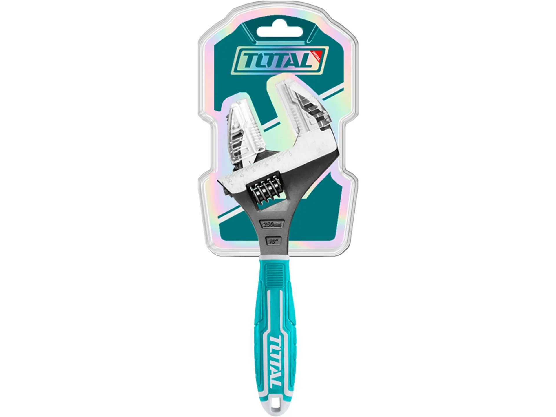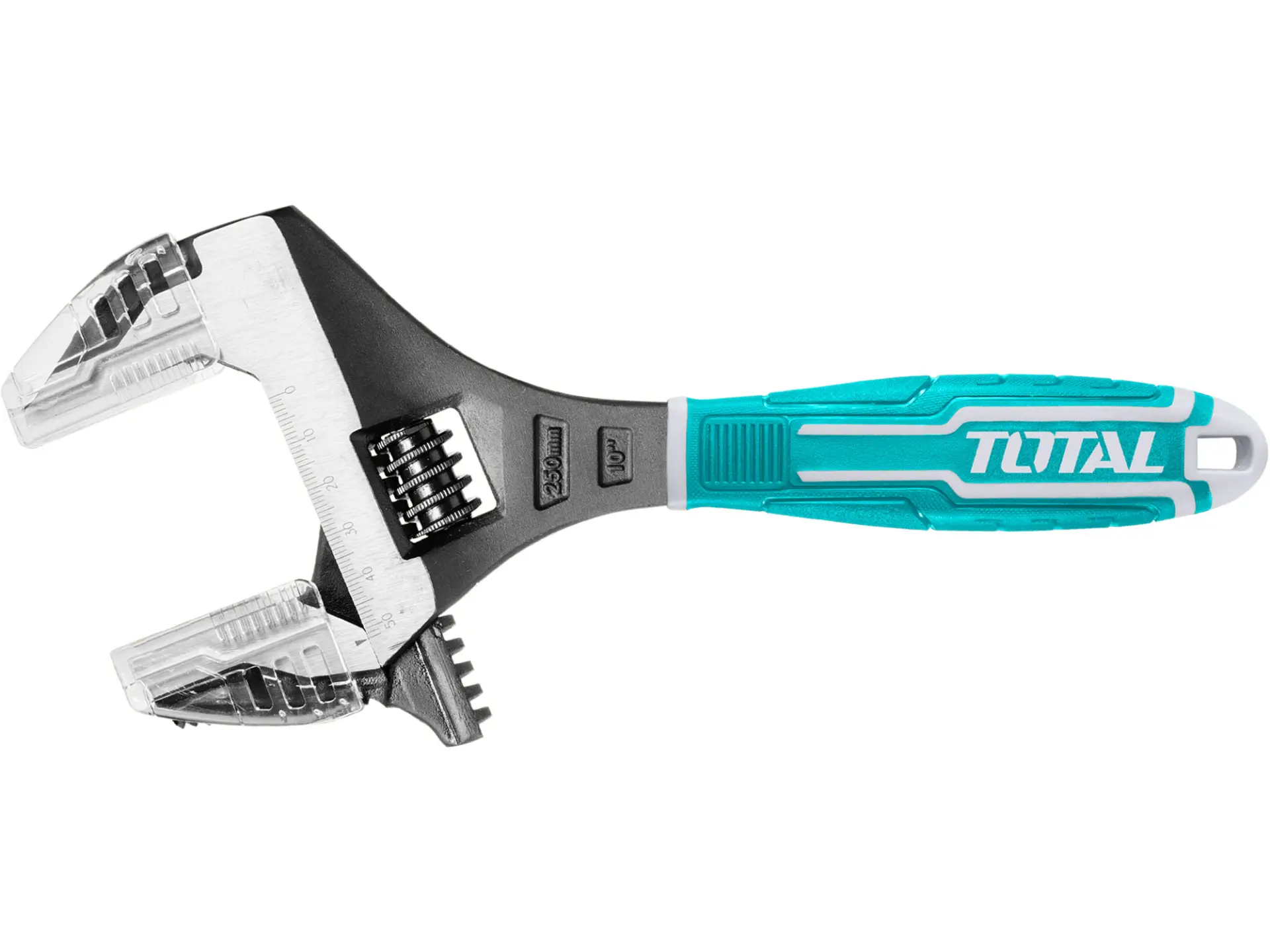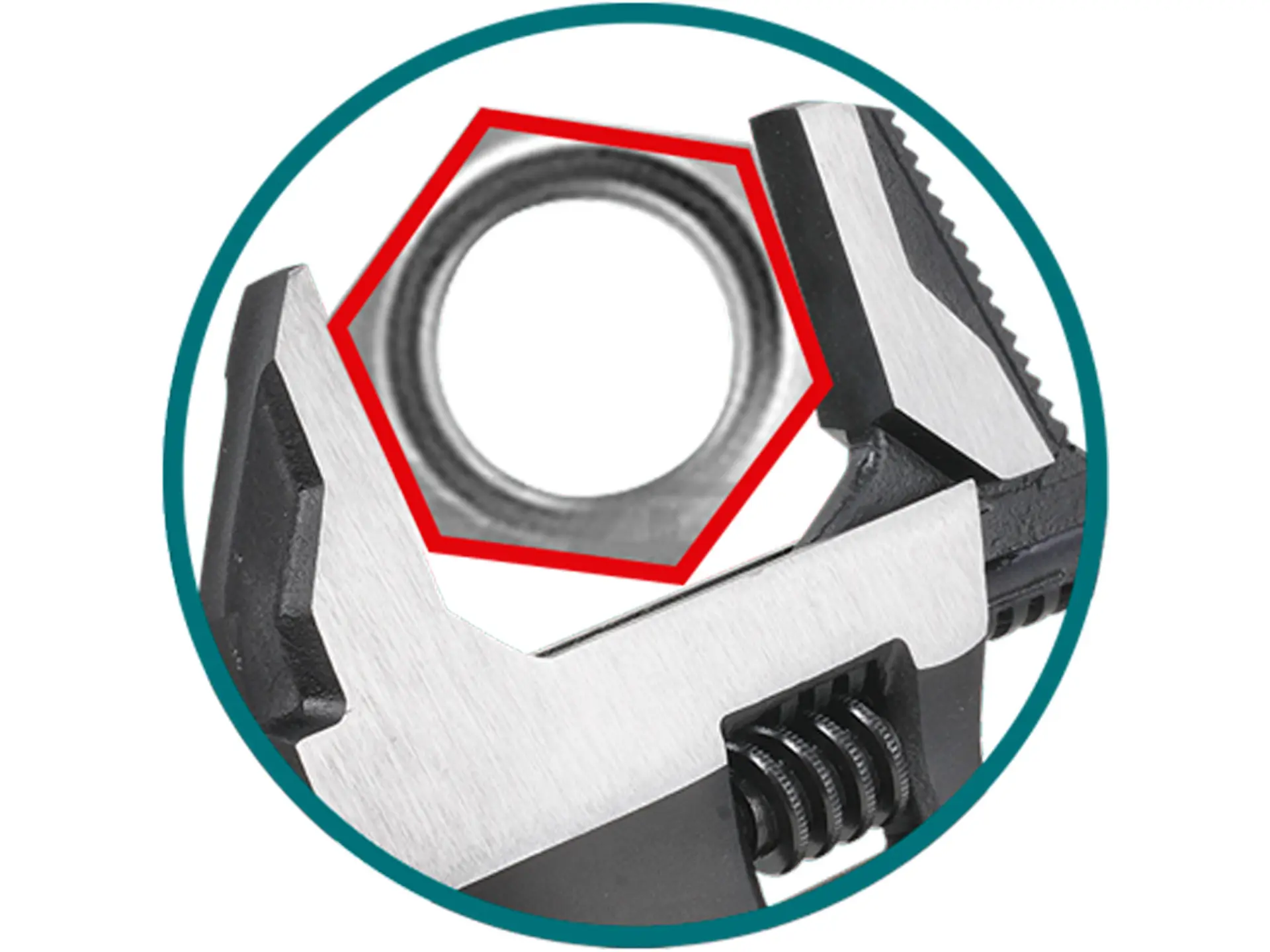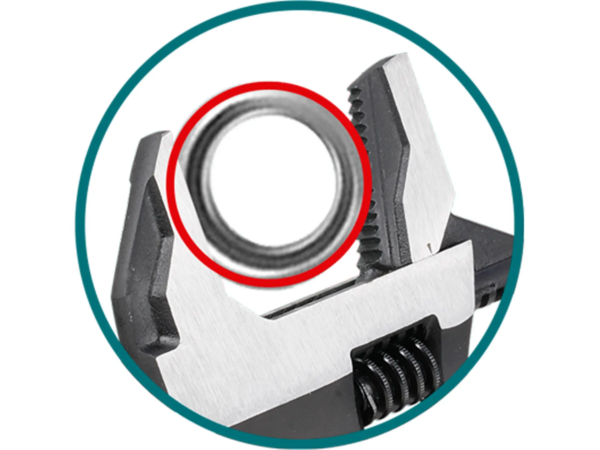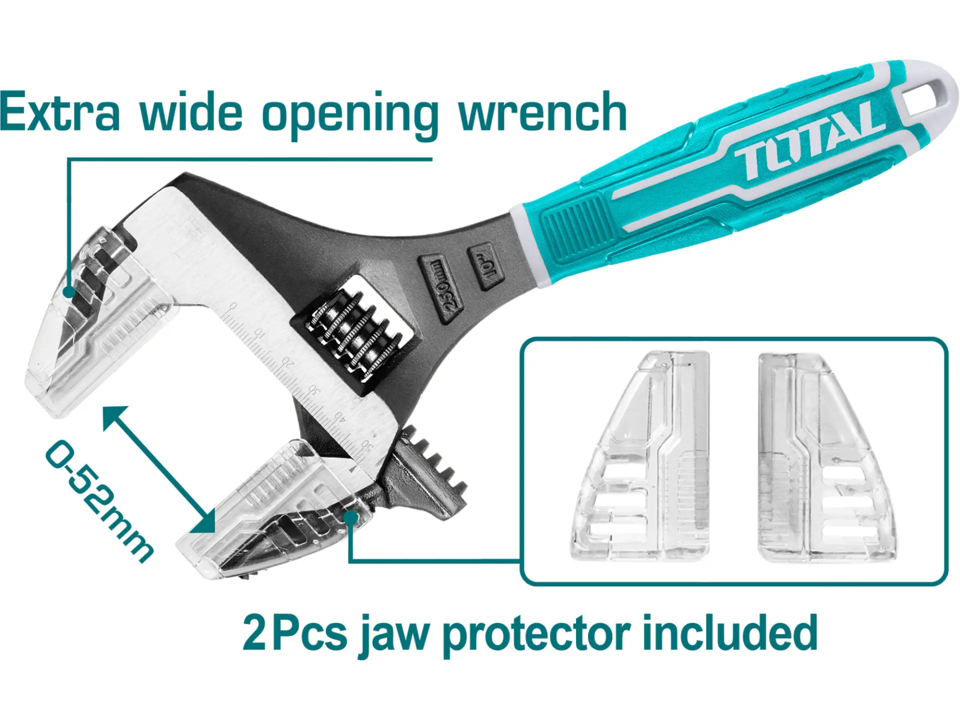 Nastavitelný klíč s funkcí hasáku, Extra široký otvor: 0-52 mmDélka: 250 mm, CRV, Včetně 2ks chrániče čelistí pro ochranu povrchu obrobkuVýměnná hlava, Jedinečný design dvoubarevné měkké rukojetiObzvláště ideální pro utahování a odstraňování matic, posuvných matic a pojistných matic pod dřezem a toaletou.