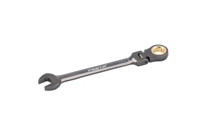 Ráčnové klíče FESTA s kloubem pro použití pod úhlem s výhodou rohatky (ráčny) jsou vyrobeny kováním z kvalitní chromvanadiové oceli. Tato ocel povrchově upravená matným tvrdochromem pro dosažení optimální povrchové tvrdosti a odolnosti vůči korozivním vlivům. Rohatku ráčny klíče tvoří 72 kalených zubů, záběr po 5-ti obloukových stupních. Kvalitou, tvrdostí a přesností přesně odpovídají normě DIN/ISO.
