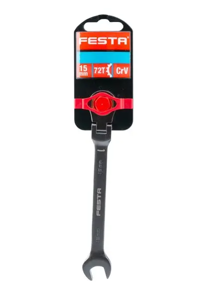 Ráčnové klíče FESTA s kloubem pro použití pod úhlem s výhodou rohatky (ráčny) jsou vyrobeny kováním z kvalitní chromvanadiové oceli. Tato ocel povrchově upravená matným tvrdochromem pro dosažení optimální povrchové tvrdosti a odolnosti vůči korozivním vlivům. Rohatku ráčny klíče tvoří 72 kalených zubů, záběr po 5-ti obloukových stupních. Kvalitou, tvrdostí a přesností přesně odpovídají normě DIN/ISO.