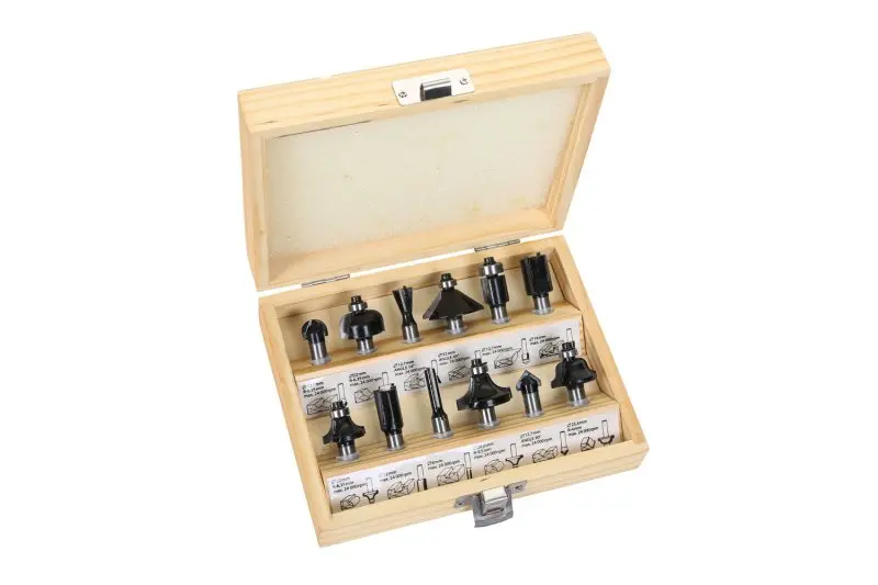Tvarové frézy na dřevo - sada 12 ks, frézy jsou osazeny kvalitními SK plátky, různé druhy tvarových fréz bez nebo s vodícím kolečkem a kvalitním ložiskem, použití : pro frézování drážek a hran různých tvarů, stopka 8mm, balení : Dřevěný box.