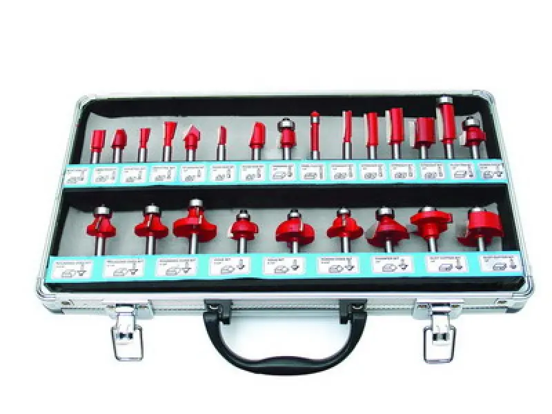 Tvarové frézy na dřevo - sada 24 ks, frézy jsou osazeny kvalitními SK plátky, různé druhy tvarových fréz bez nebo s vodícím kolečkem a kvalitním ložiskem, použití : pro frézování drážek a hran různých tvarů, stopka 8mm, balení : odolný hliníkový kufřík.