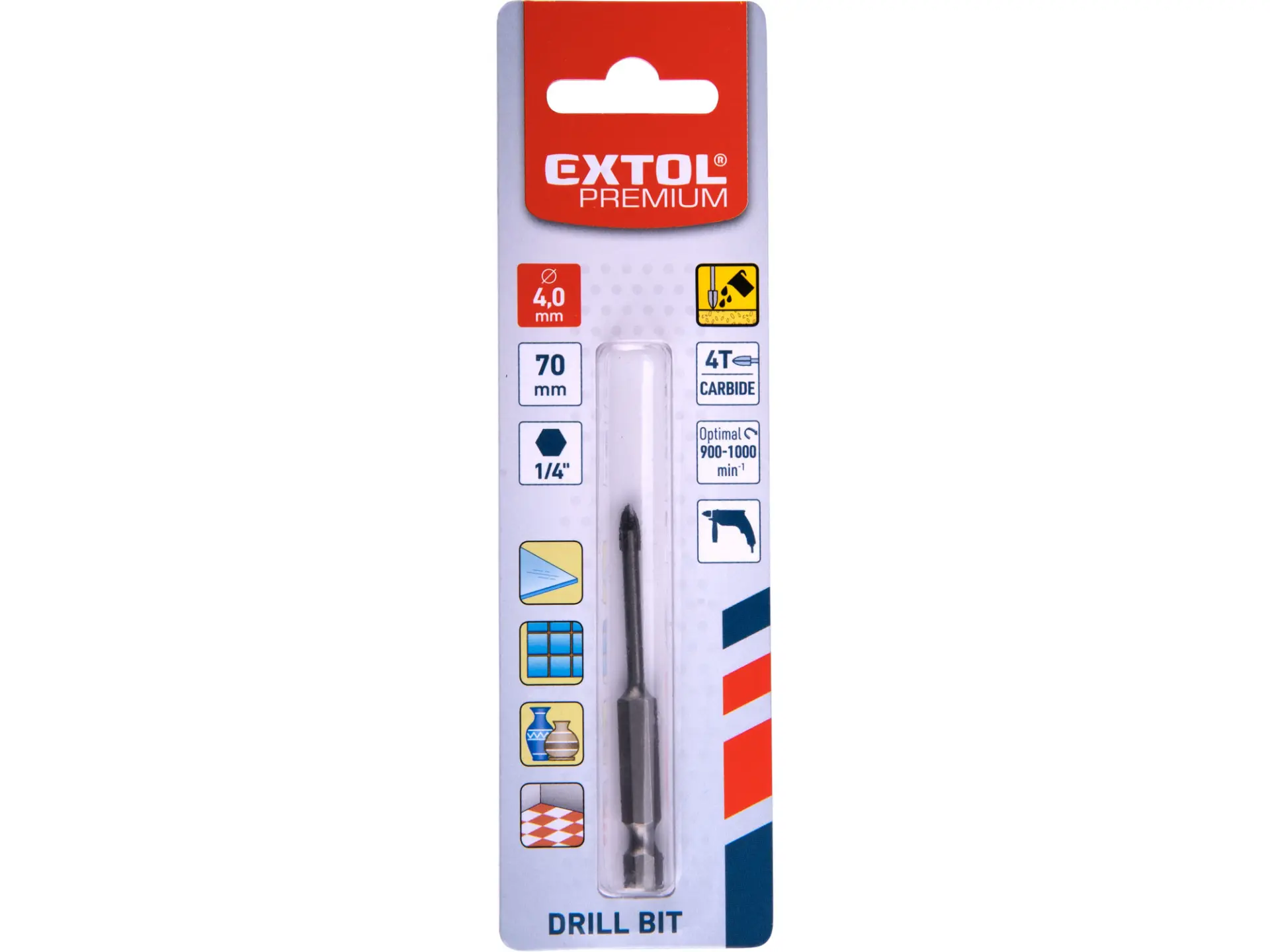 • karbidový vrták se čtyřmi břity slouží k vrtání děr do nejrůznějších stavebních materiálů jako např. dlažba, obklady, keramika, sklo atd.
