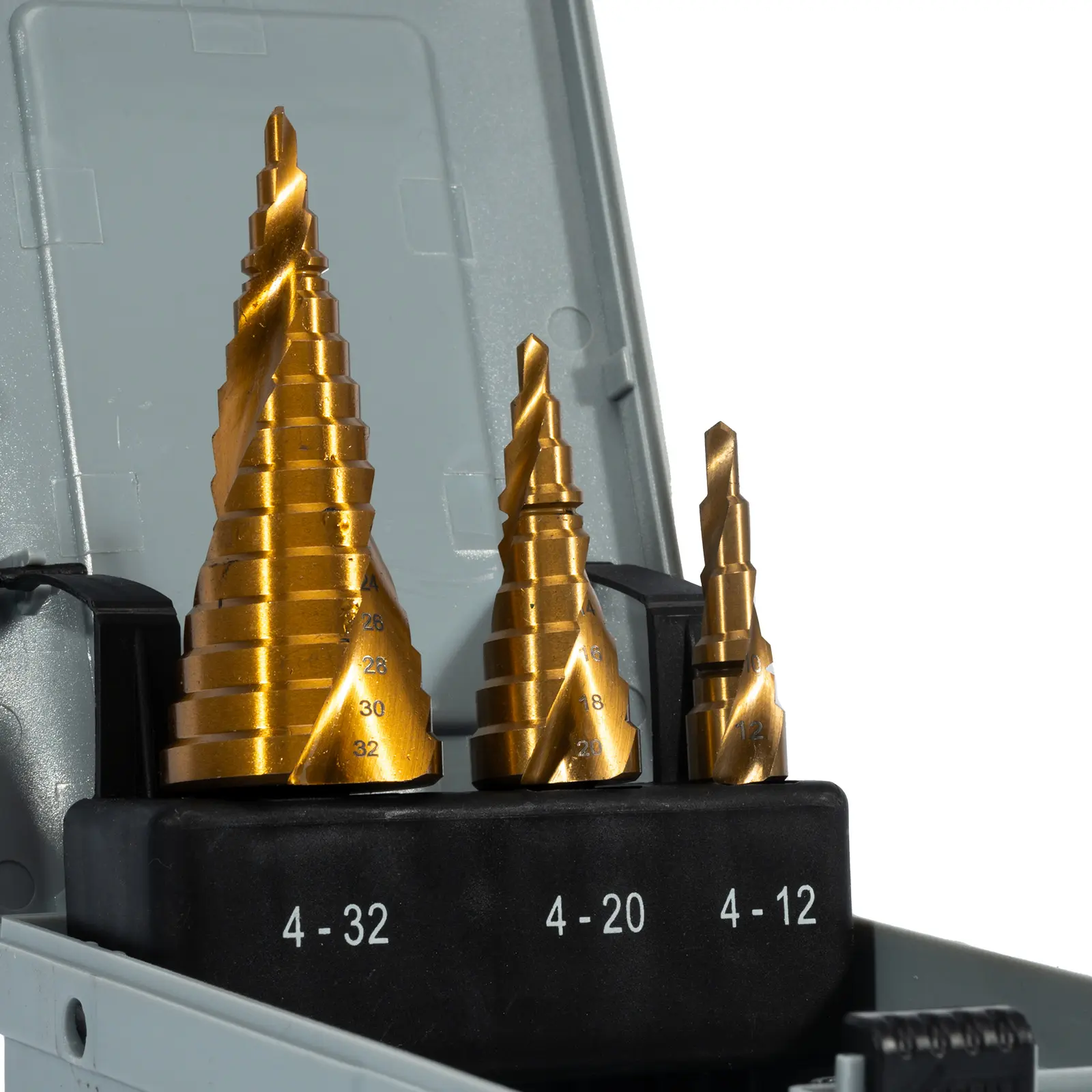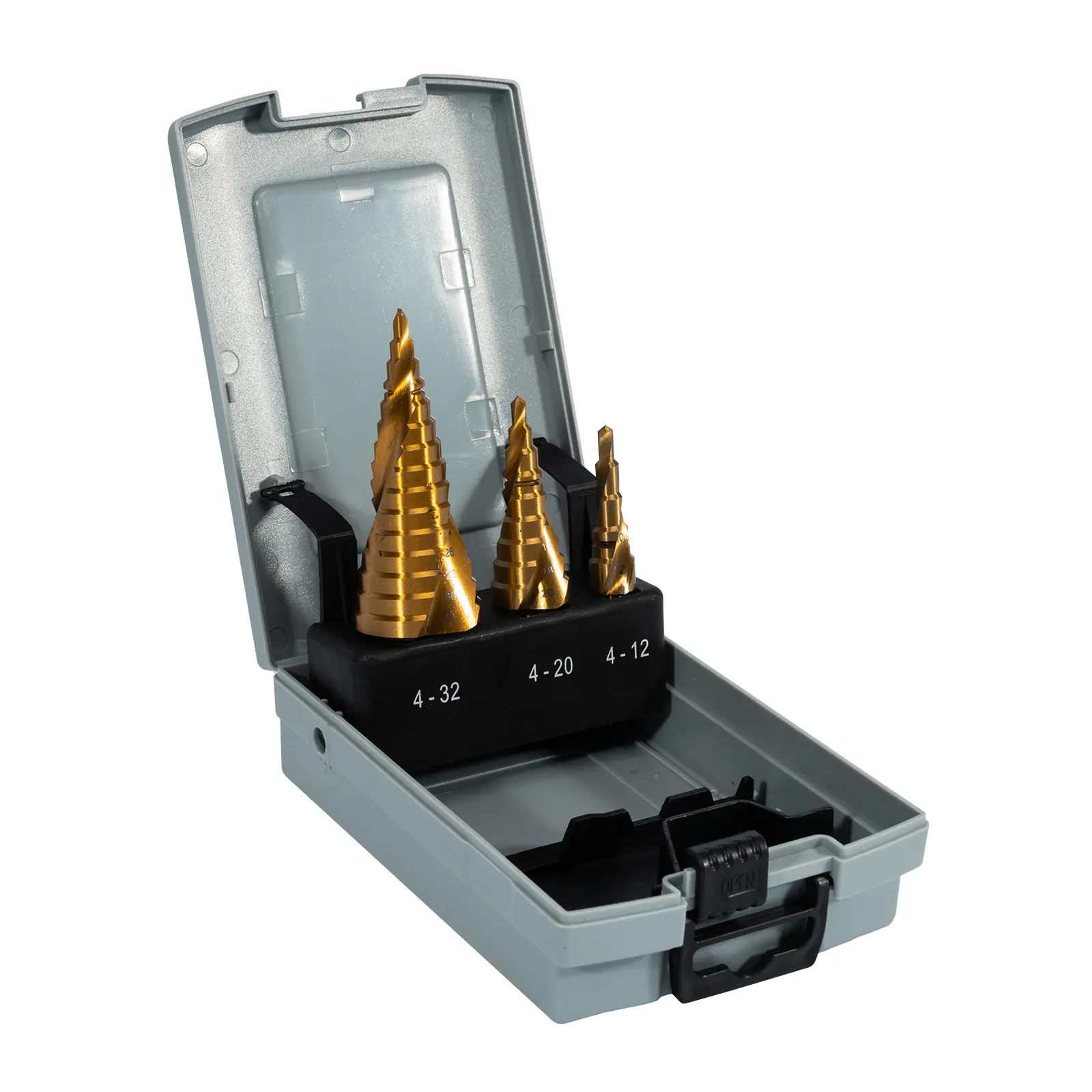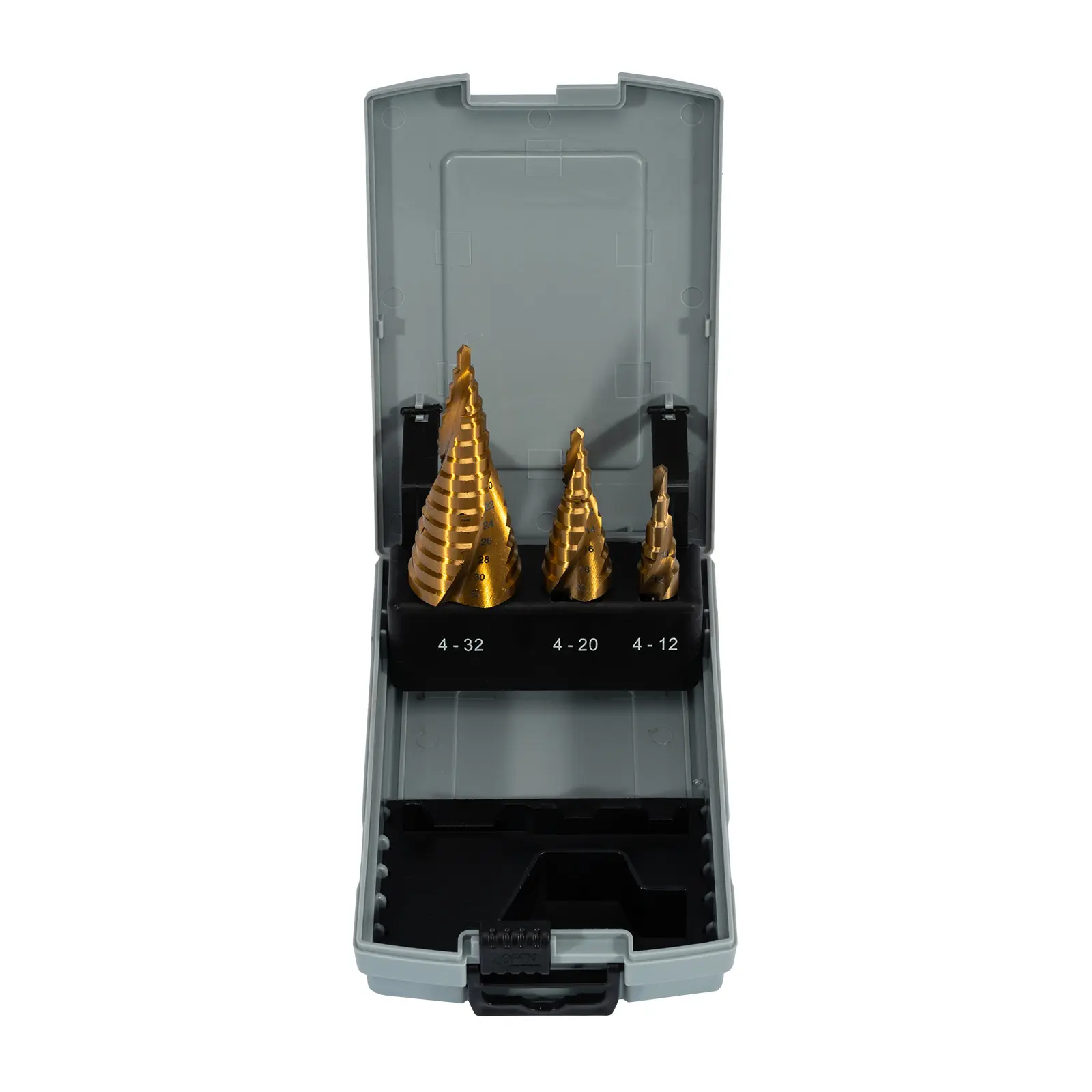 Sada stupňovitých vrtáků slouží pro vyvrtání kruhových otvorů v ocelových plátech (i měkčí materiály jako dřevo, plast...).Plynulé a bezhrotové vrtání bez deformace materiálu. Díky titanovému povrchu je vrták mnohem odolnější, použitelný téměř ve všech aplikacích.Výhodou TiN je dobrá elasticita a adheze, snižuje energetickou náročnost obrábění, chrání nástroj proti opotřebení na čele i hřbetu nástroje.Vhodné pro aku/elektrické vrtačky.