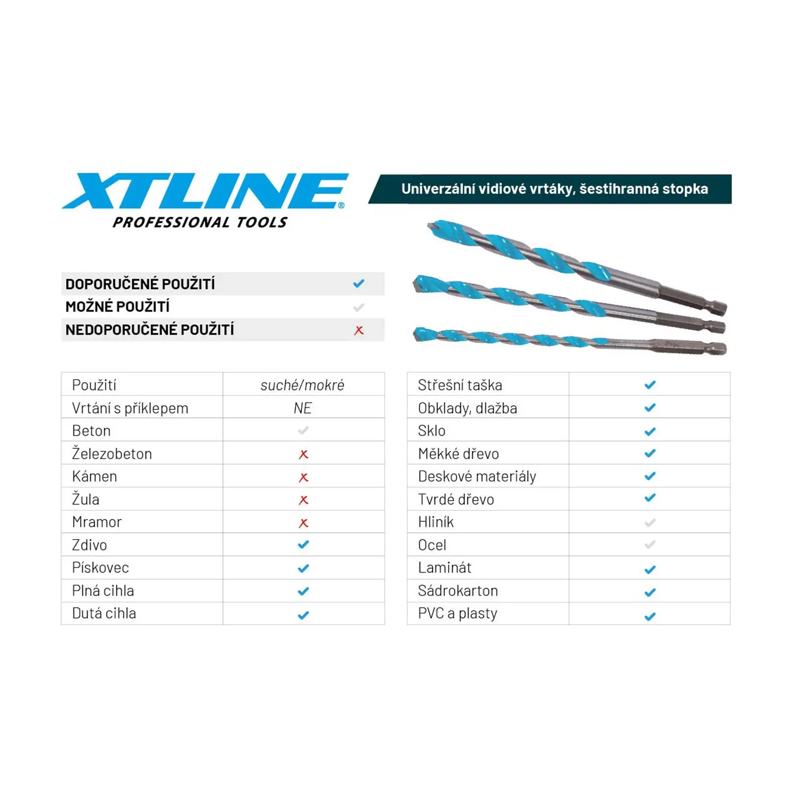 Vidiový vrták "multi construction" je určen pro vrtání do různých stavebních materiálů, jako jsou beton, zdivo, cihly, kámen, dlažba, obklady, keramika, dřevo, neželezné kovy, plechy, plast a mnoho dalších. Vrták je vyroben z kvalitní rychlořezné oceli (HSS) s tvrdými břity ze slinutého karbidu, které umožňují rychlé a přesné vrtání s minimálním tlakem. Díky své univerzálnosti a konstrukci je tento vrták vhodný pro řadu různých aplikací a řemesel. Uplatnění najde všude tam, kde je třeba vrtat skrze různorodou skladbu materiálů bez nutnosti volit konkrétní vrták pro konkrétní materiál. Vrták je navíc vhodný pro většinu typů aku vrtaček. Všestrannost a vysoká efektivita vrtáku, který si poradí s většinou běžných stavebních materiálů, z něj činí ideální řešení jak pro hobby uživatele, tak profesionály.