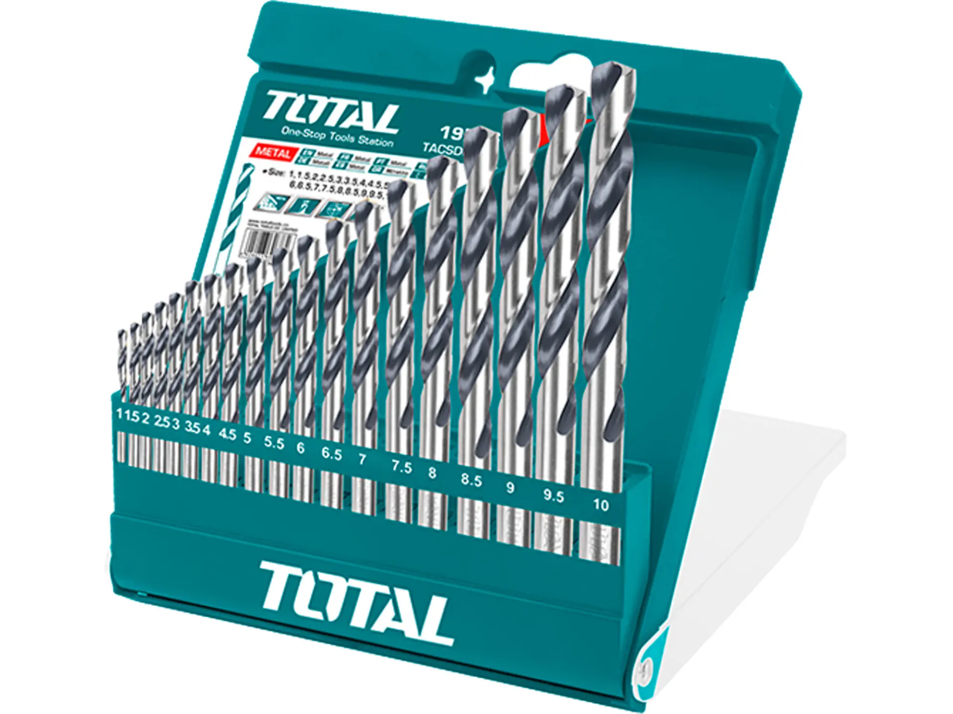 19ks vrtáků do kovu HSS: 1-1,5-2-2,5-3-3,5-4-4,5-5-5,5-6-6,5-7-7,5-8-8,5-9-9,5-10mm